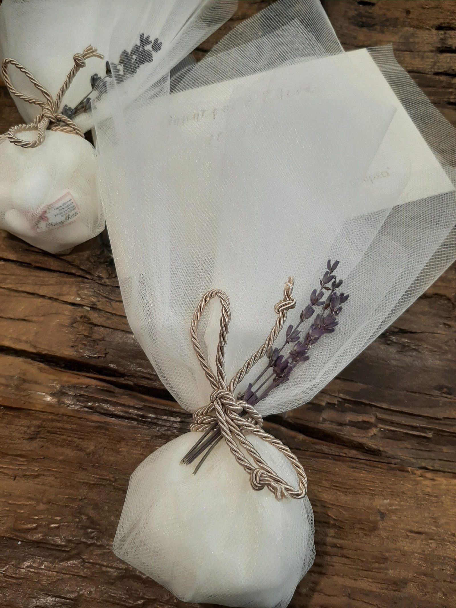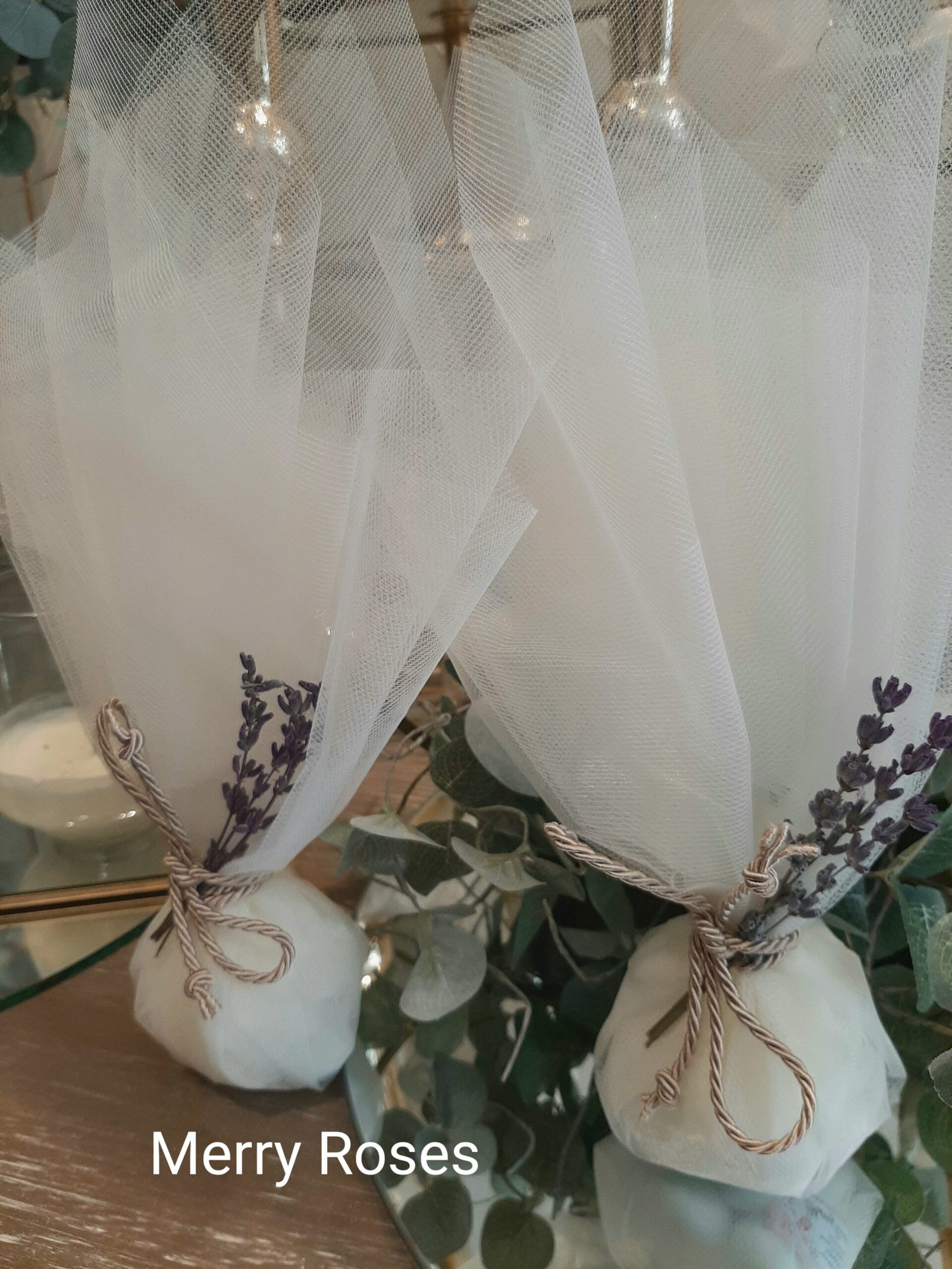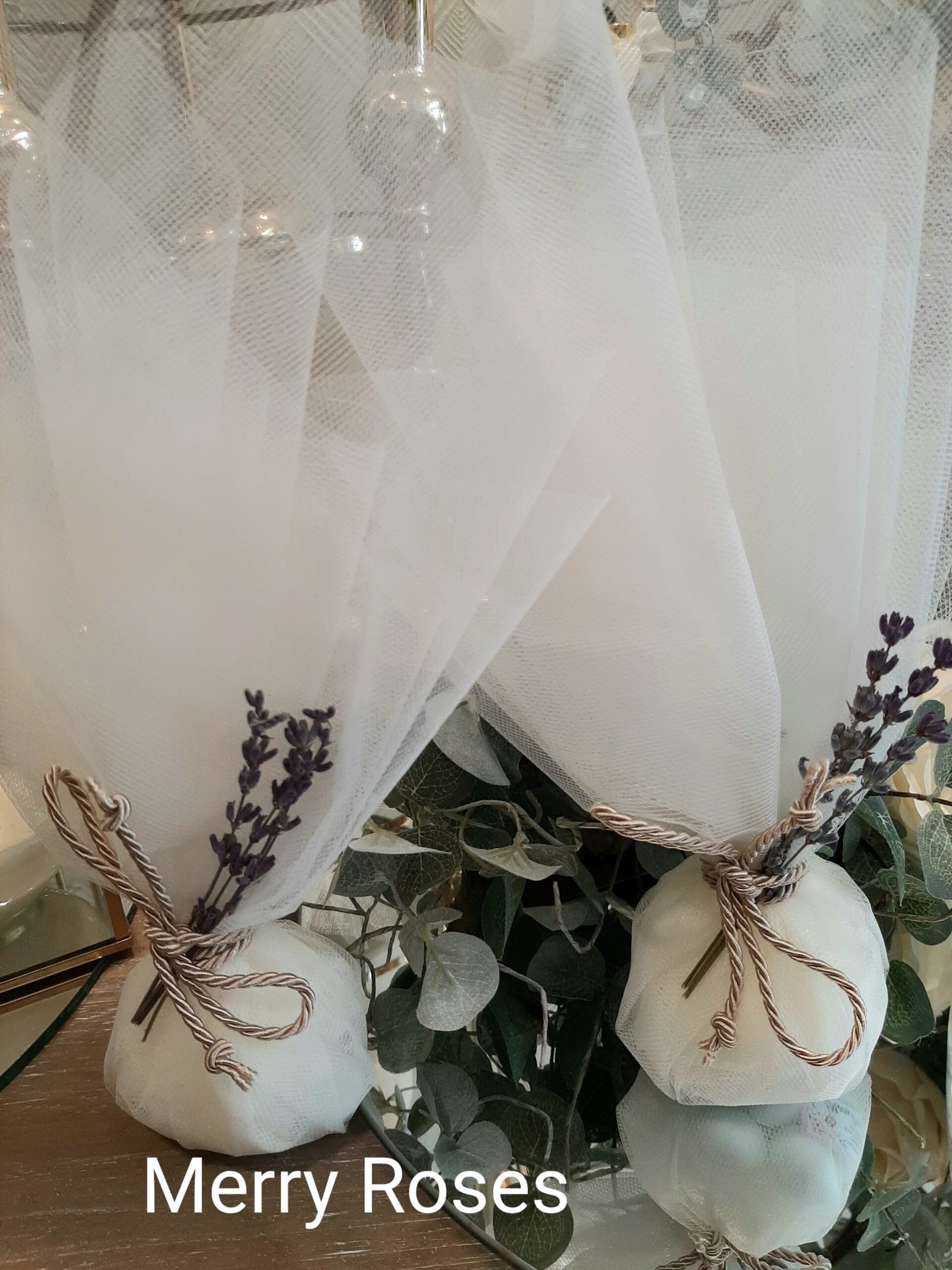 Τούλινη μπομπονιέρα Γάμου με λεβάντα και χρυσό κορδόνι πολυτελείας.