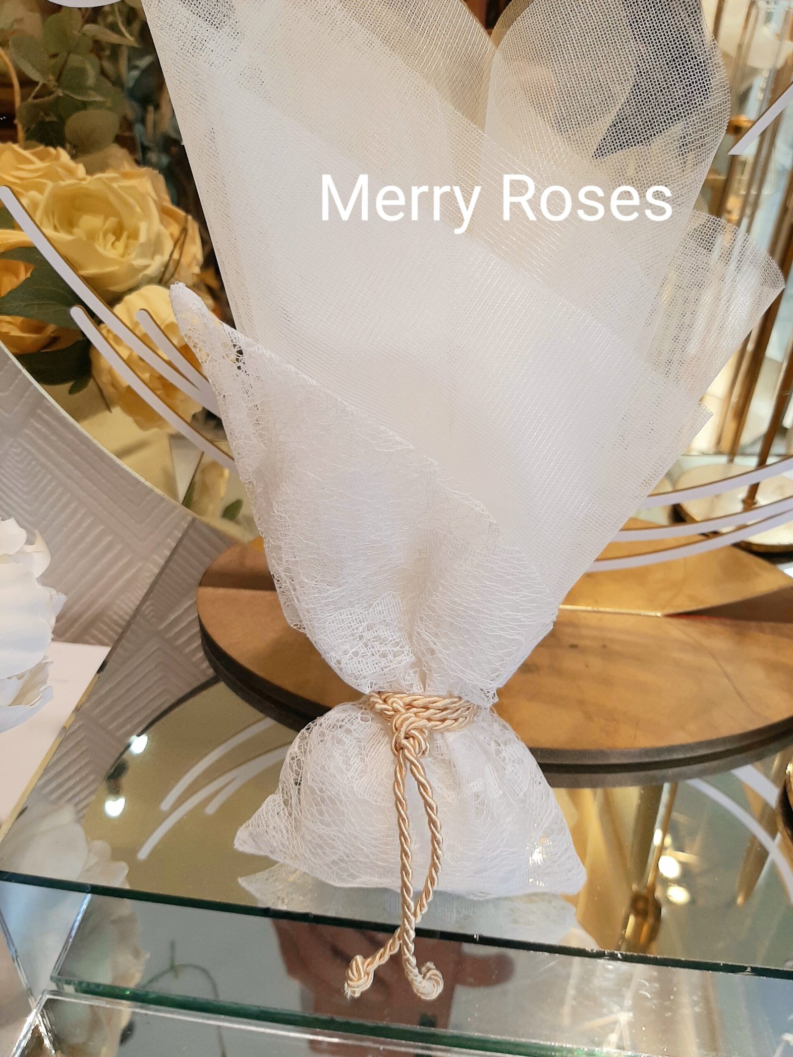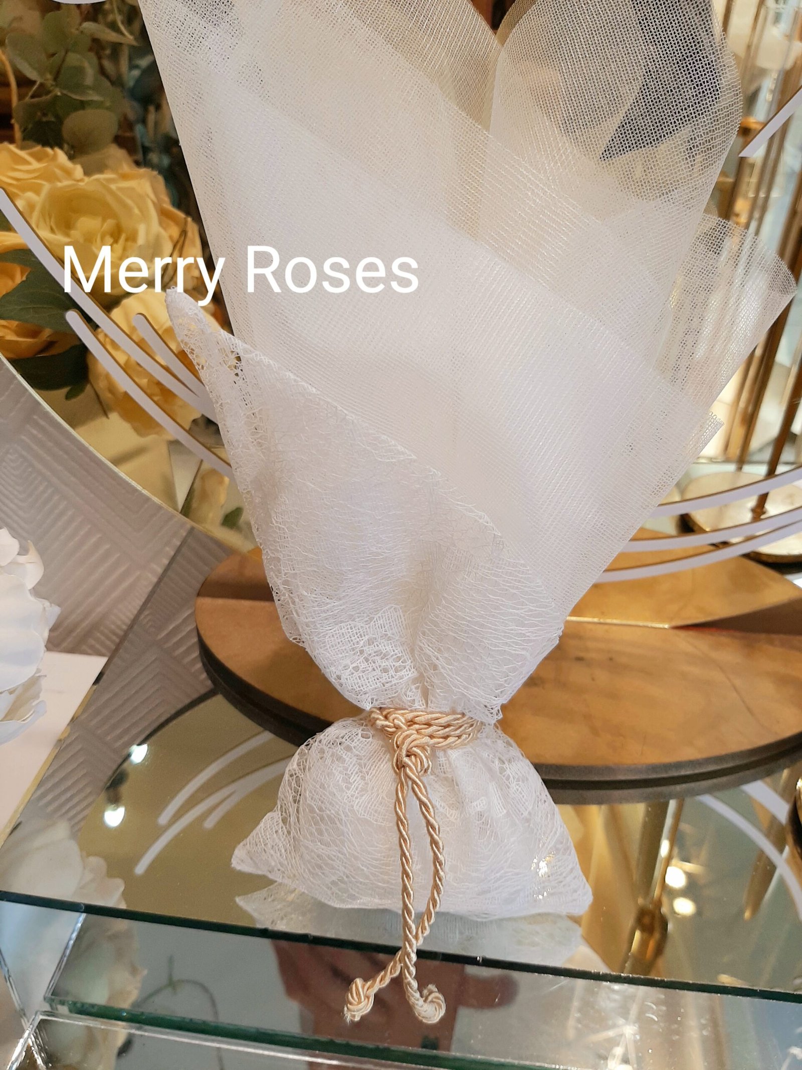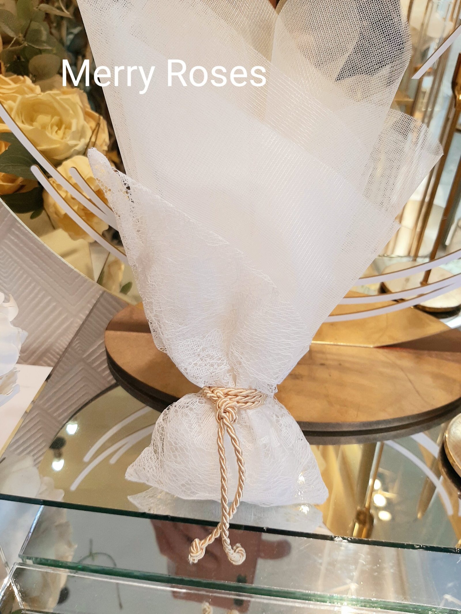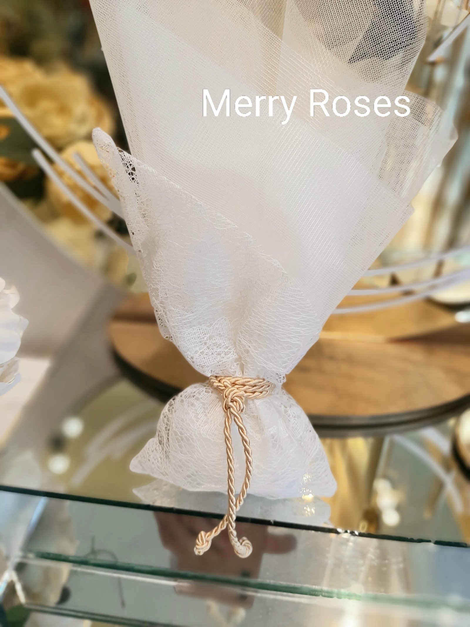 Ξεχωριστή μπομπονιέρα γάμου με πουγκί δαντέλας λοξό,δεμένη με κορδόνι χρυσό και τούλι ιβουάρ.