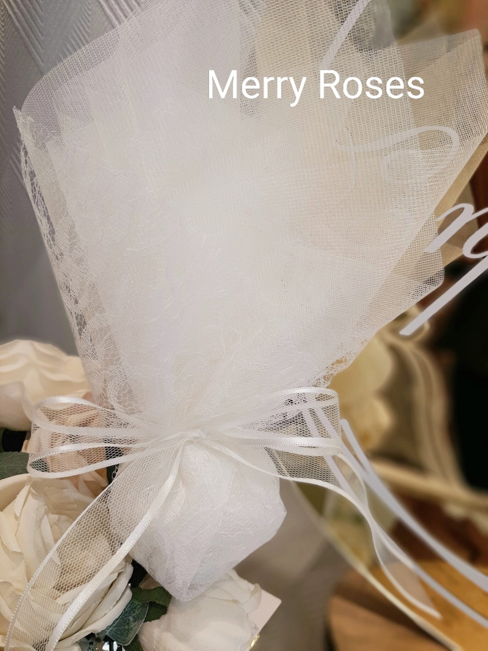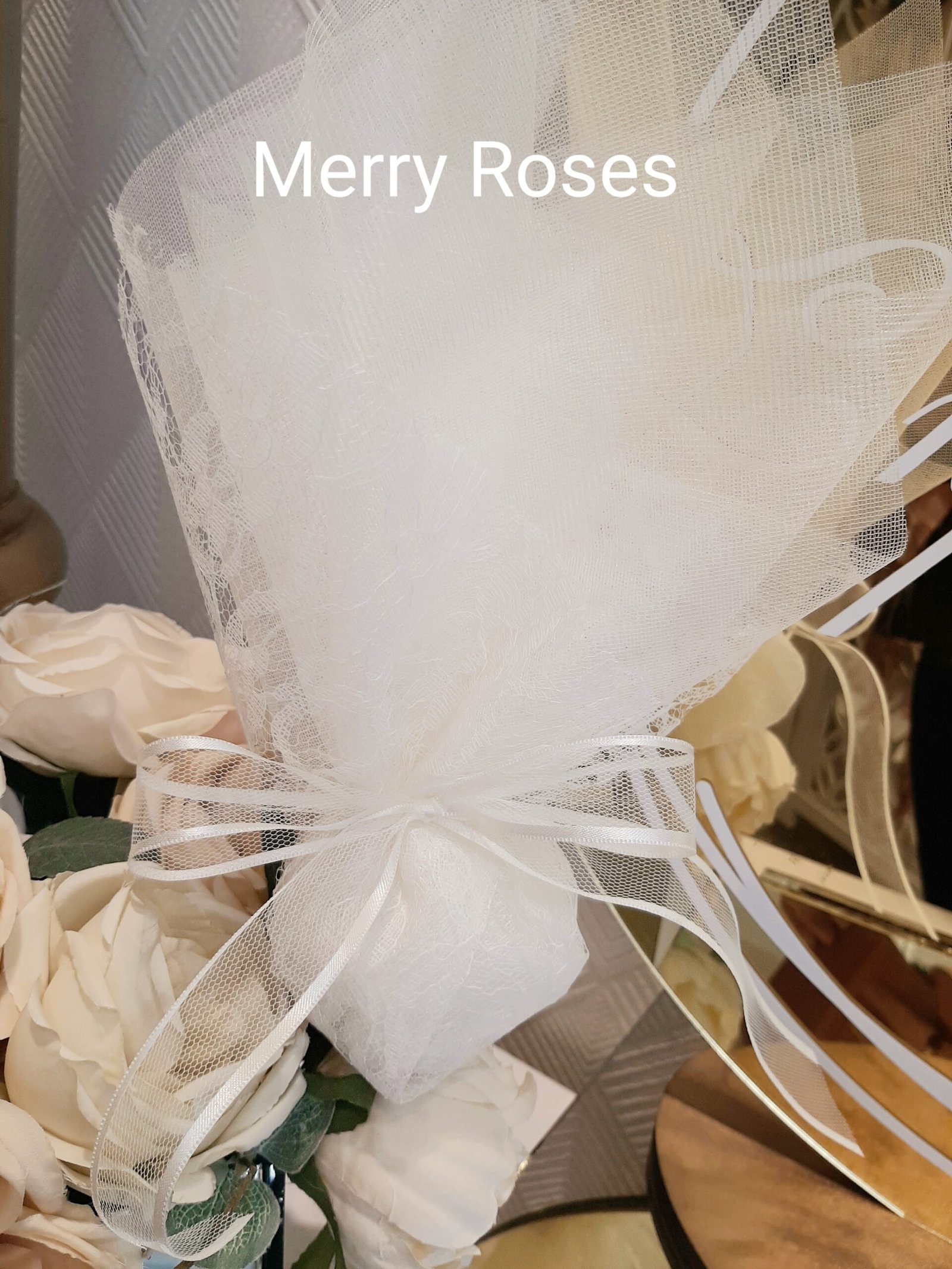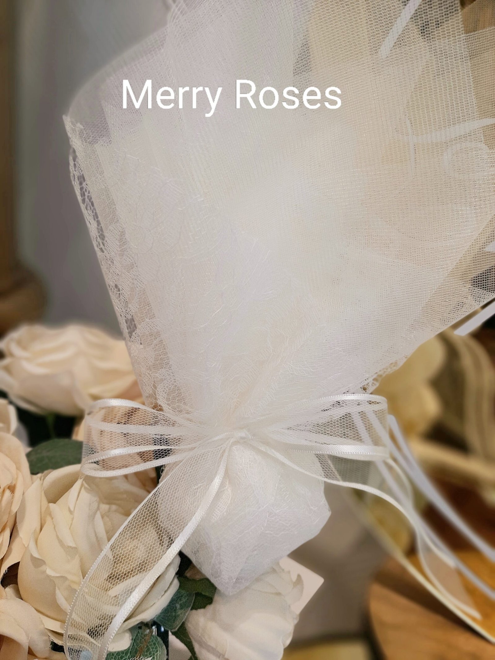 Μπομπονιέρα γάμου ιβουάρ με τούλι και δαντέλα ,δεμένη με εντυπωσιακή κορδέλα τούλινη με φινίρισμα σατέν.