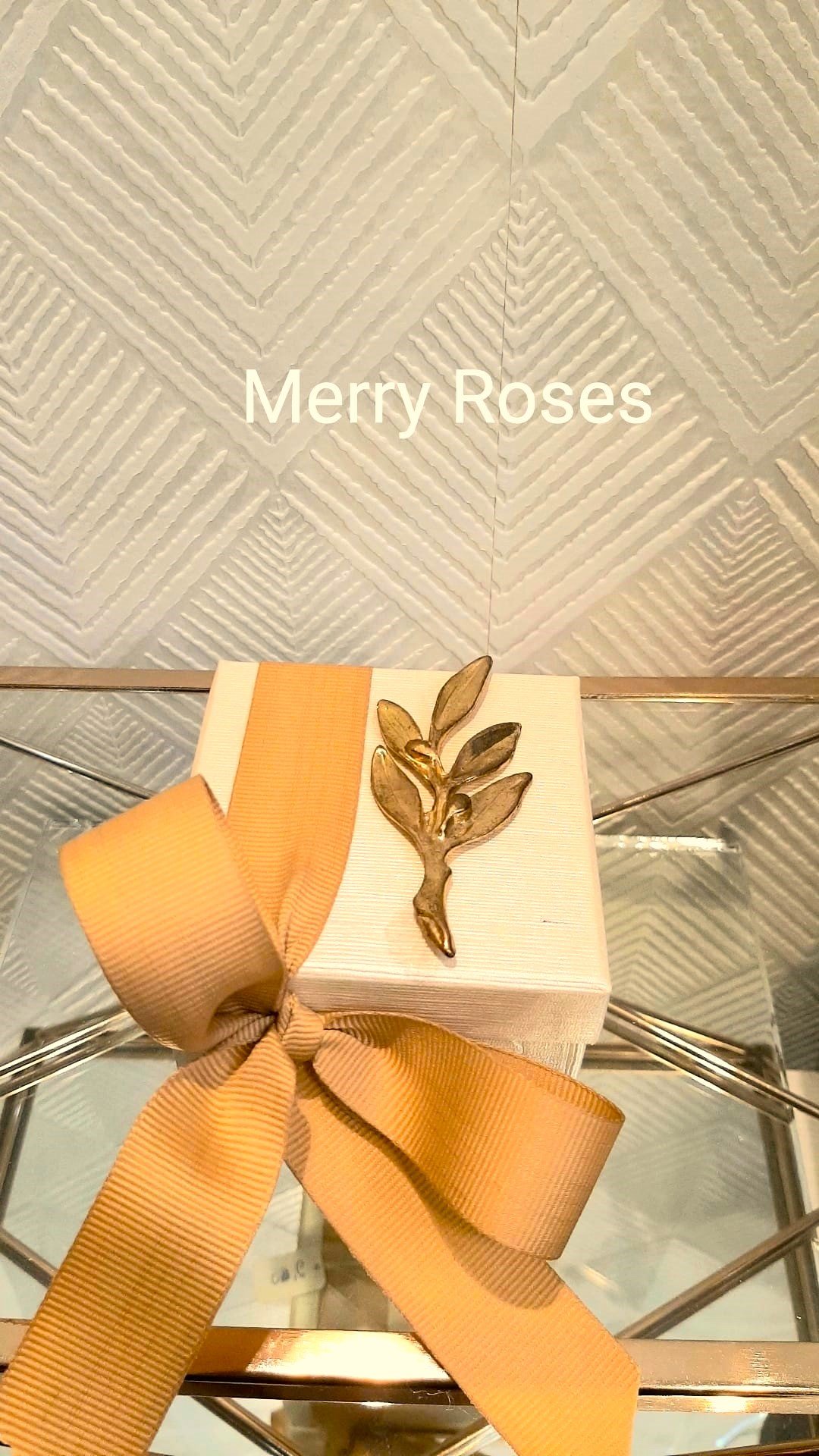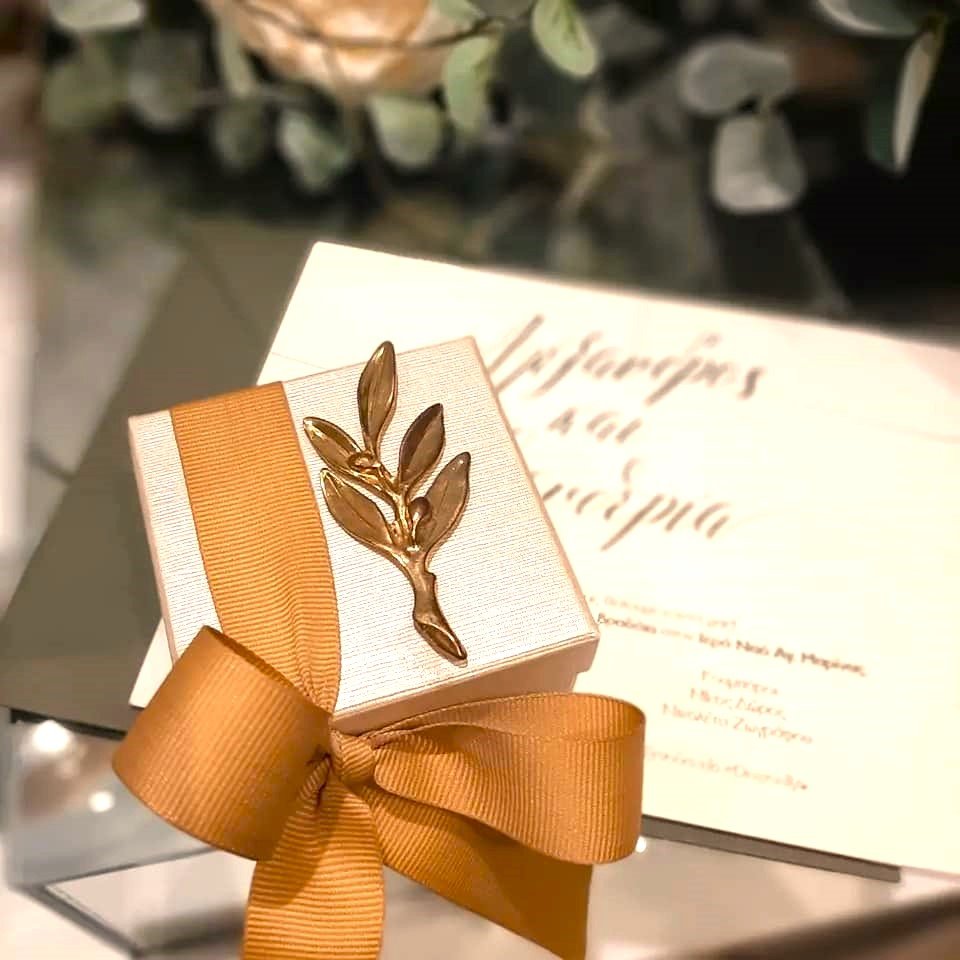 Μπομπονιέρα γάμου ελιά χρυσή μεταλλική σε κουτί πολυτελείας.