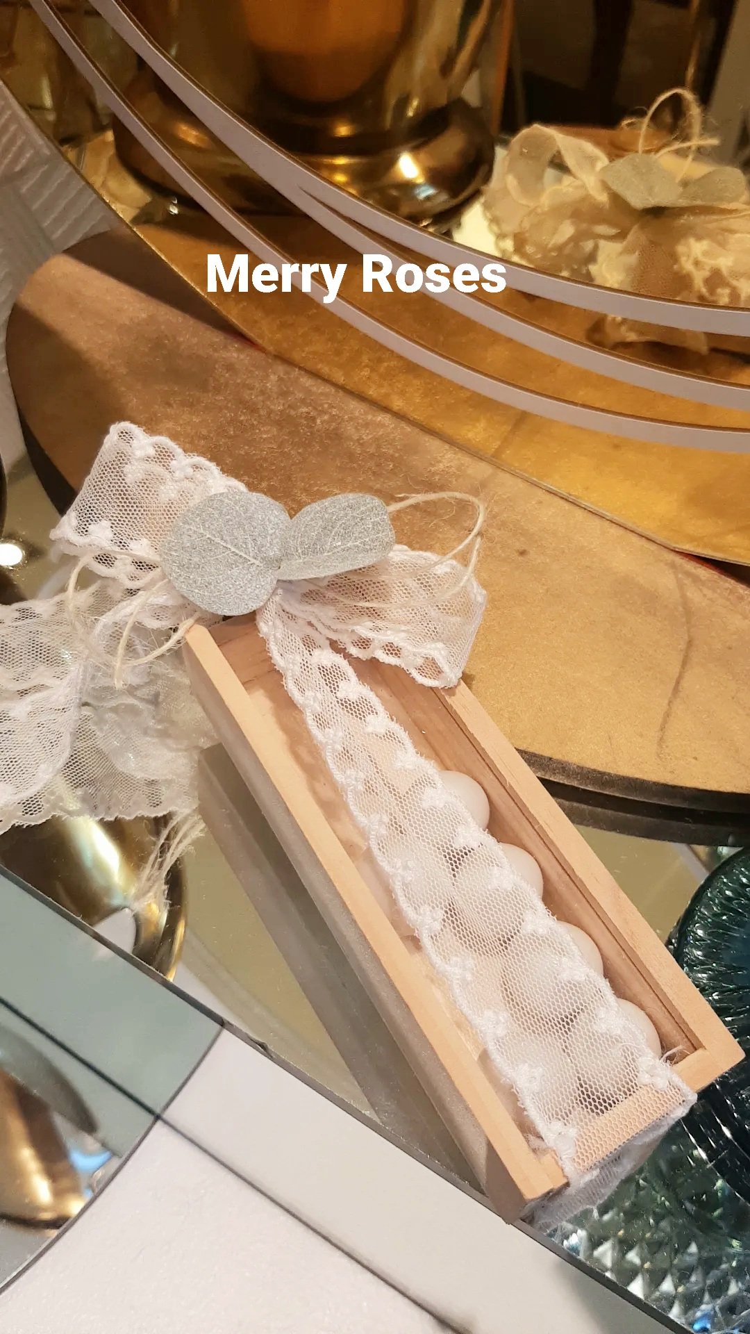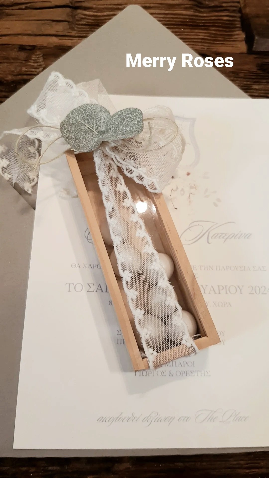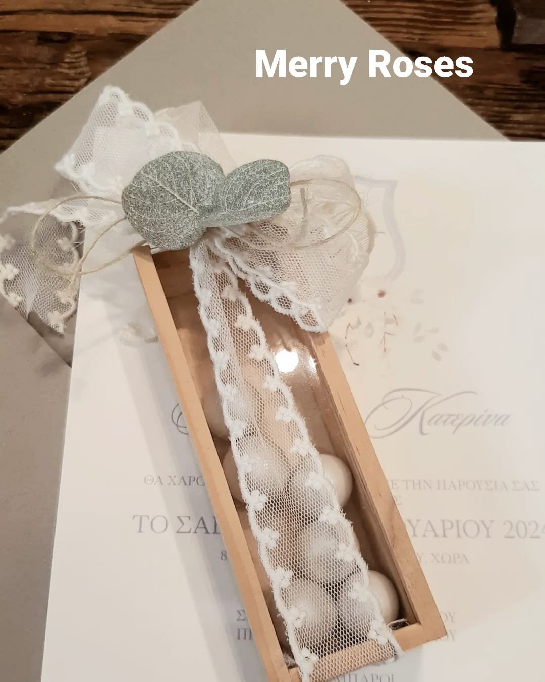 Μπομπονιέρα Γάμου ξύλινο κουτί με πλέξιγκλας ,δέσιμο με τούλινη δαντέλα και διακοσμητικό φυλλαράκι ευκάλυπτου.