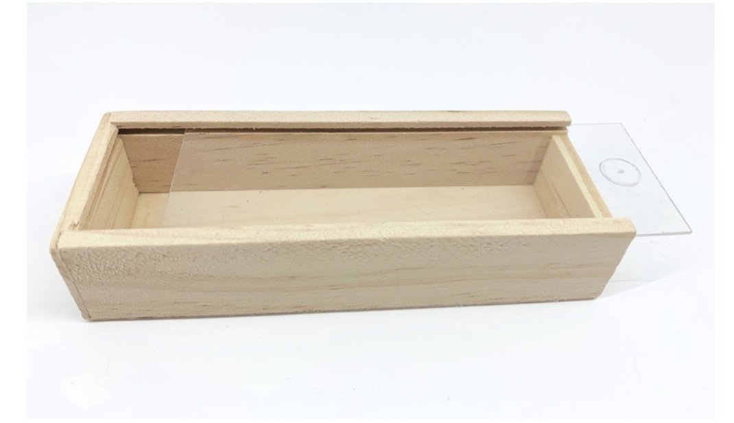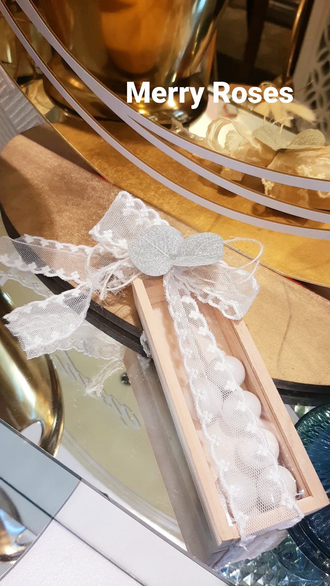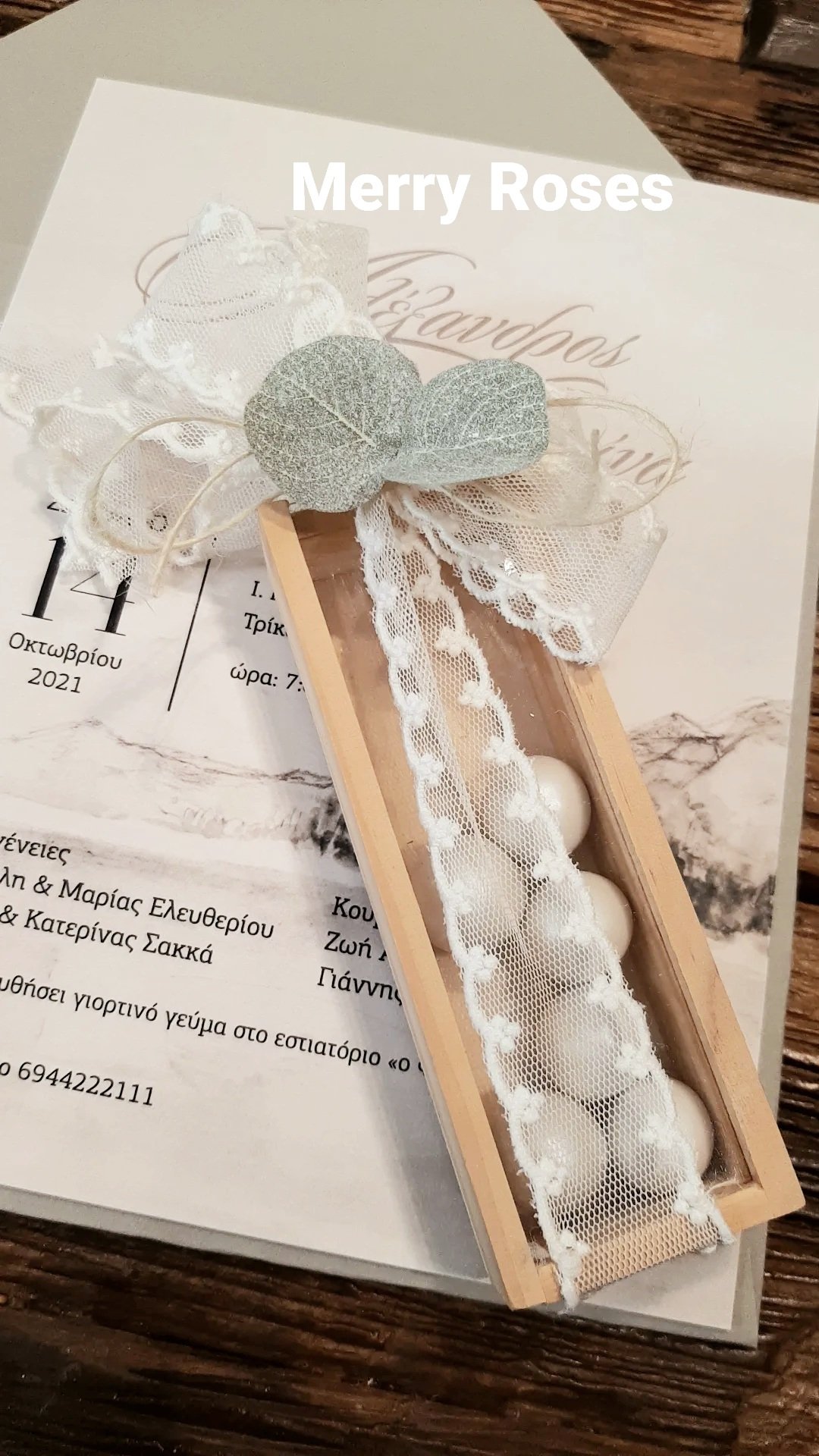 Μπομπονιέρα Γάμου ξύλινο κουτί με πλέξιγκλας ,δέσιμο με τούλινη δαντέλα και διακοσμητικό φυλλαράκι ευκάλυπτου.