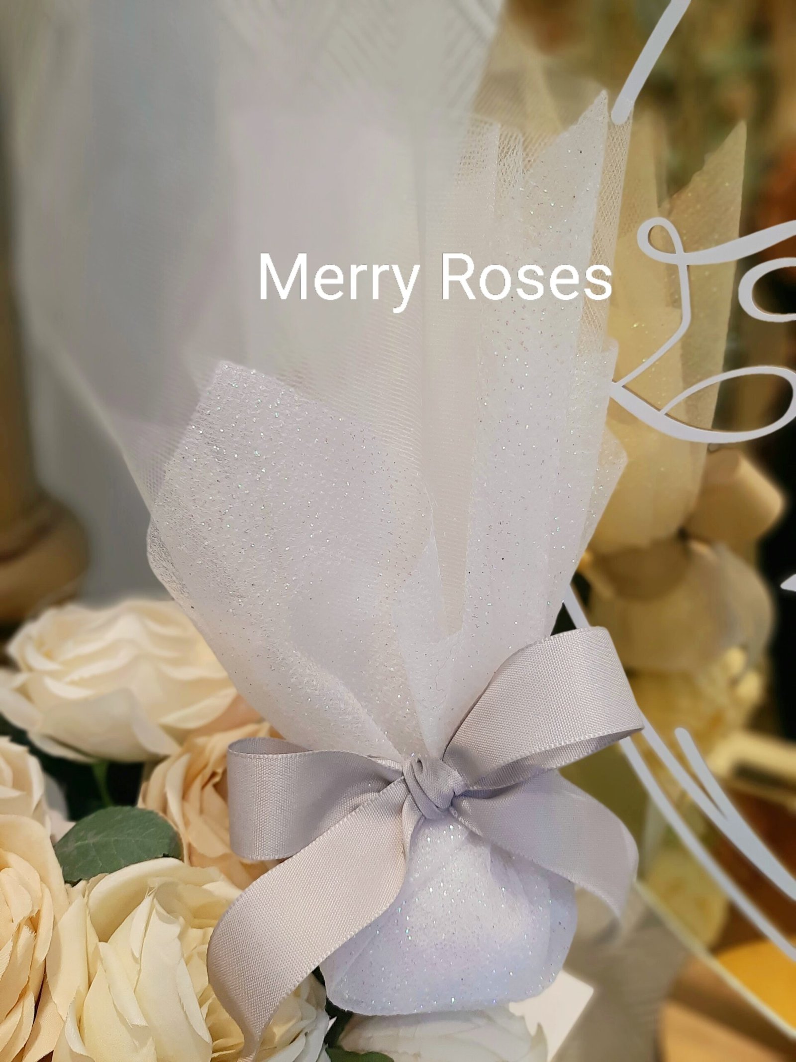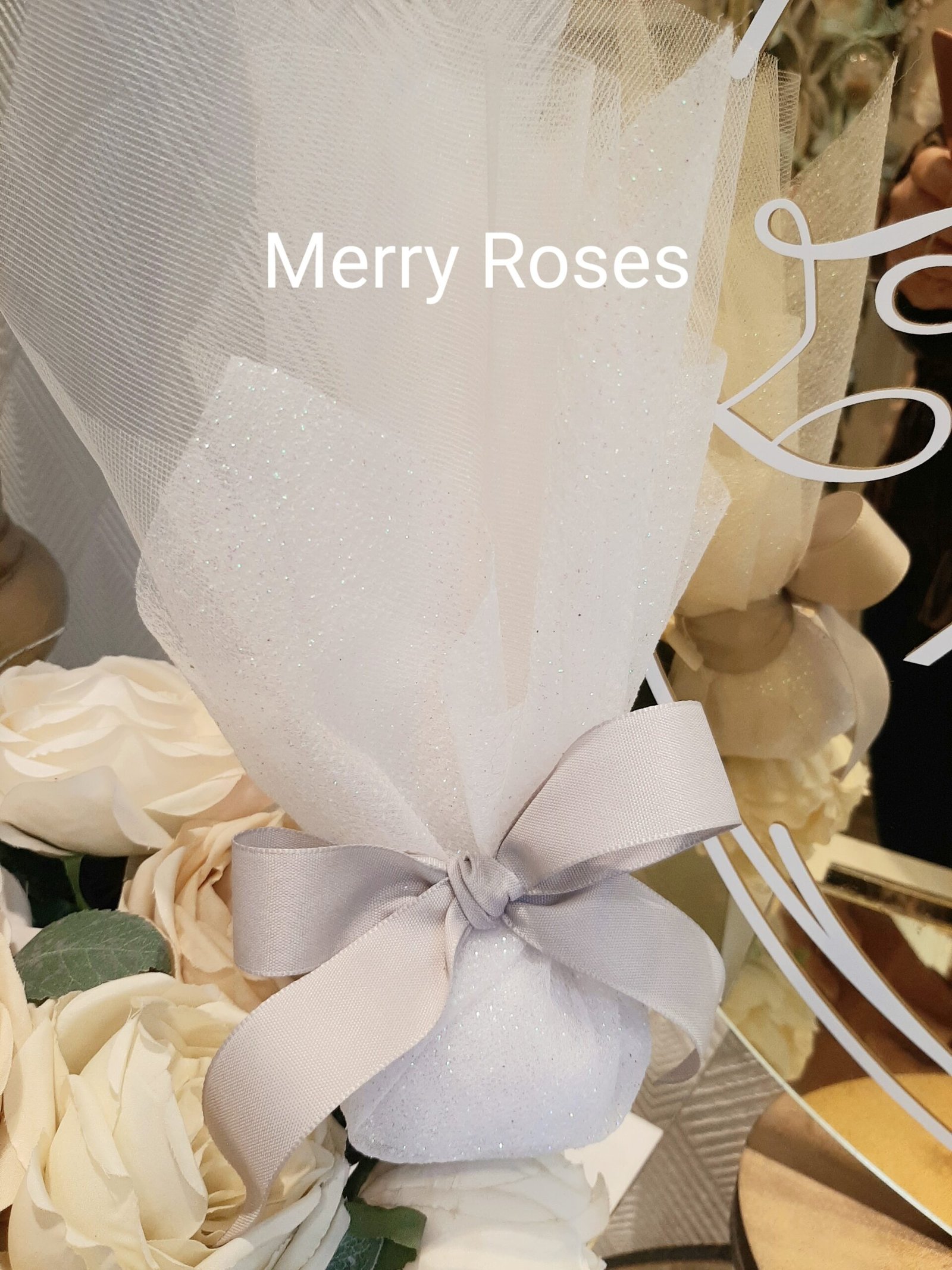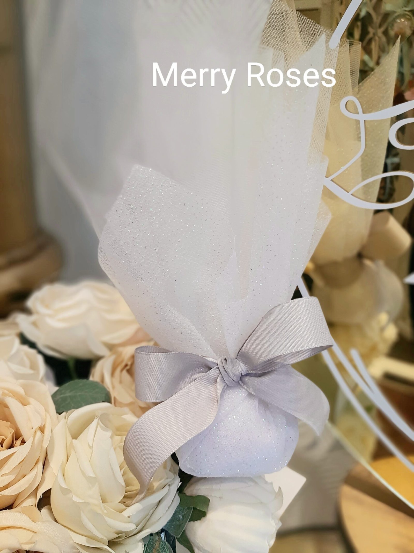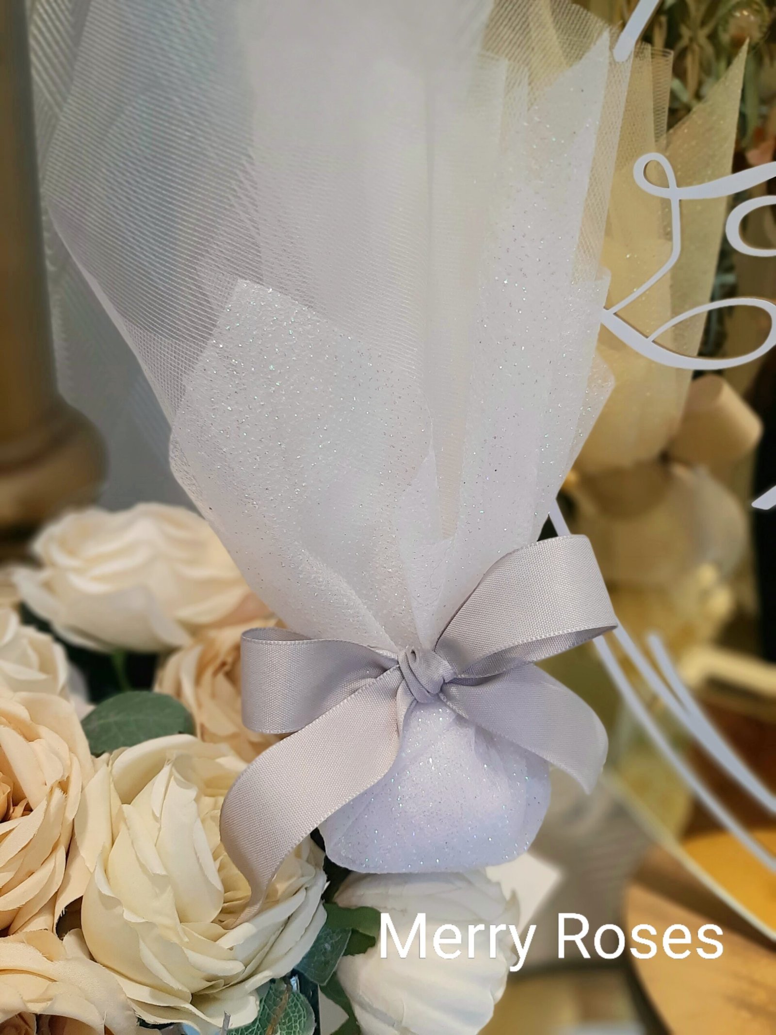 Μπομπονιέρα γάμου λευκή με ιριδίζον τούλι ύφασμα λάμψης ιριδίζον ,δεμένη με φιόγκο υφασμάτινης κορδέλας σε γκρί απόχρωση.