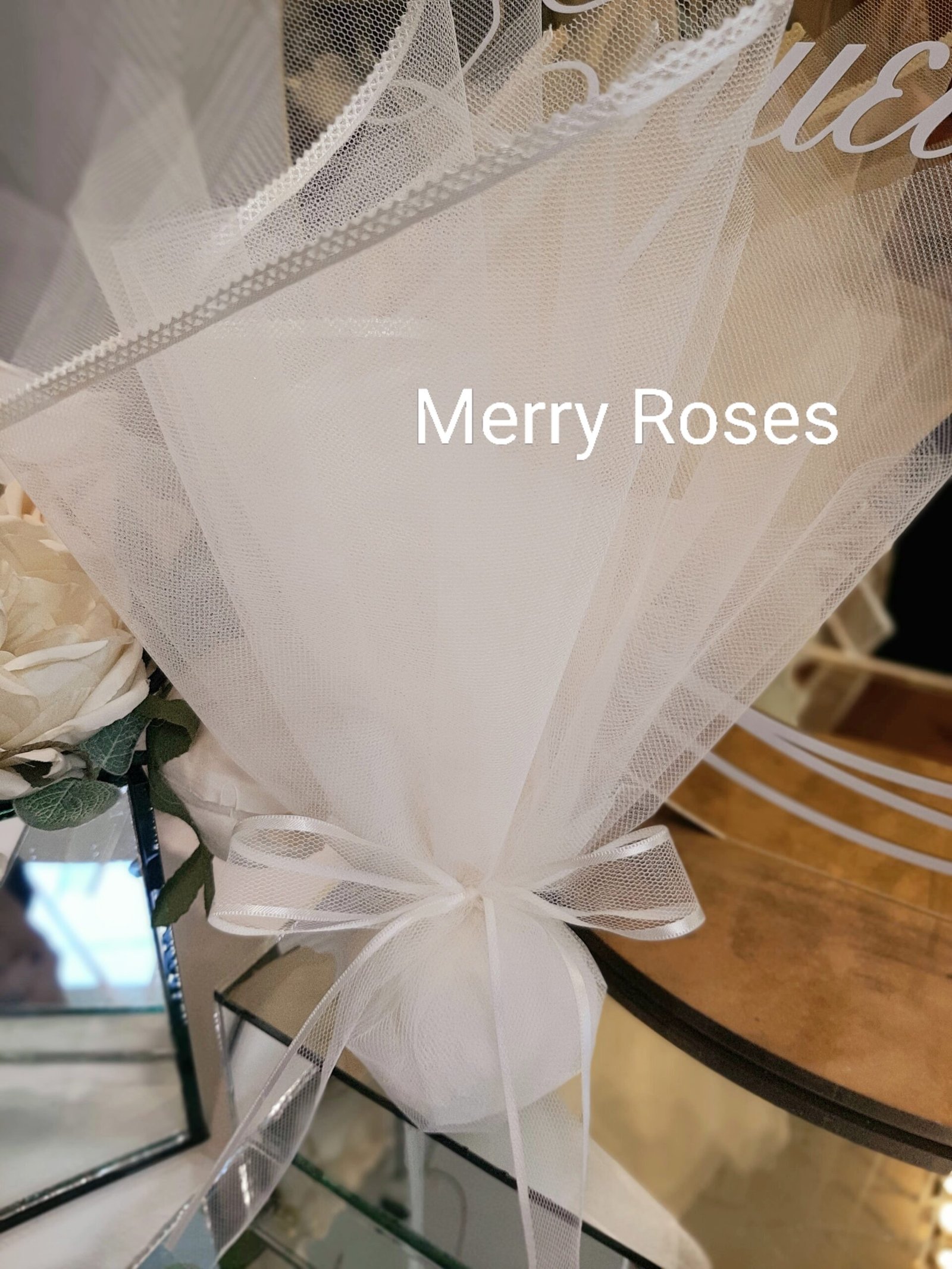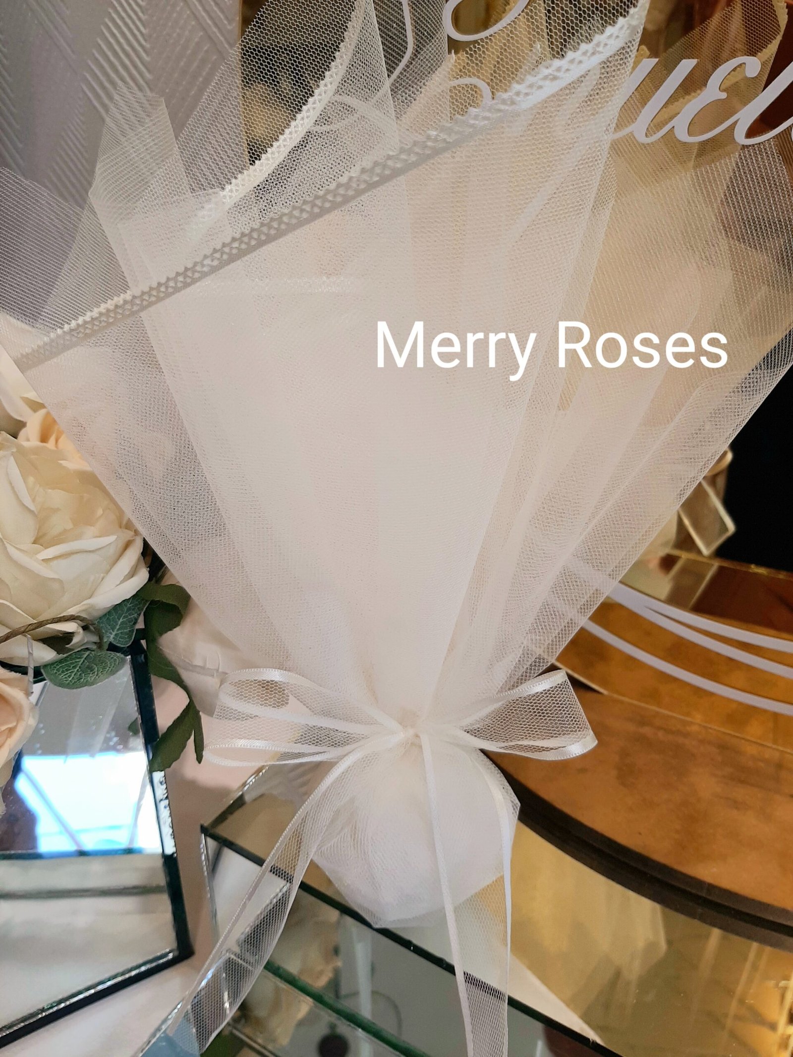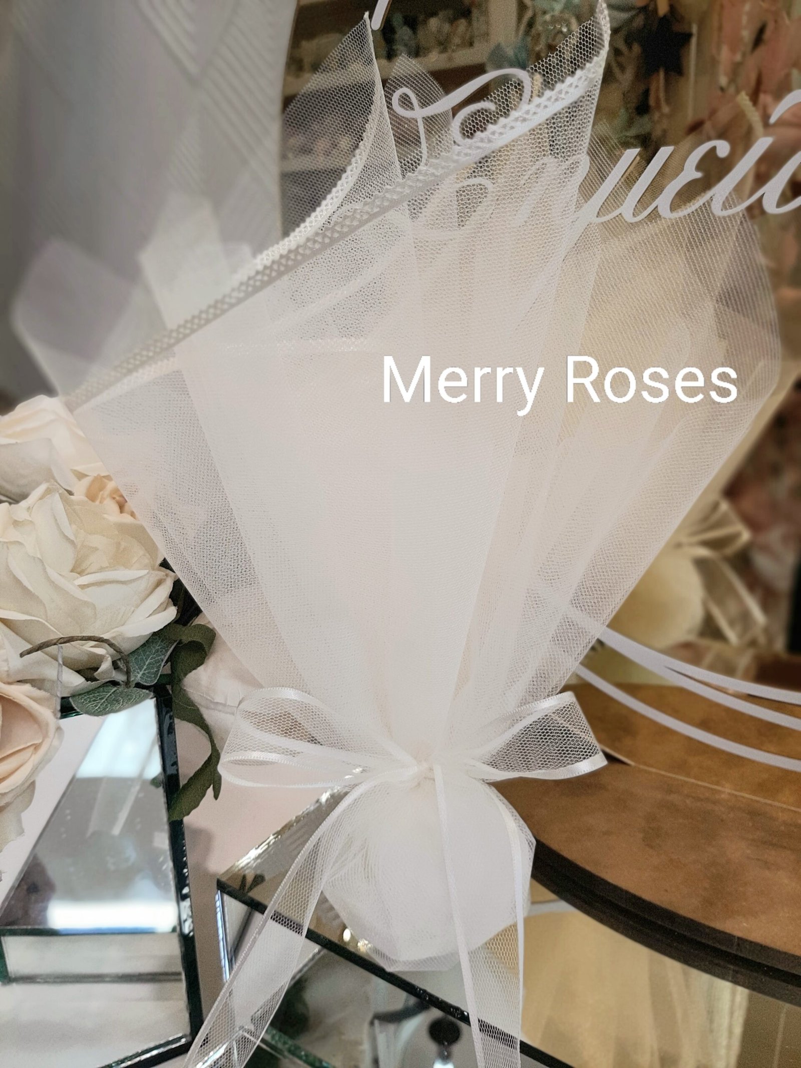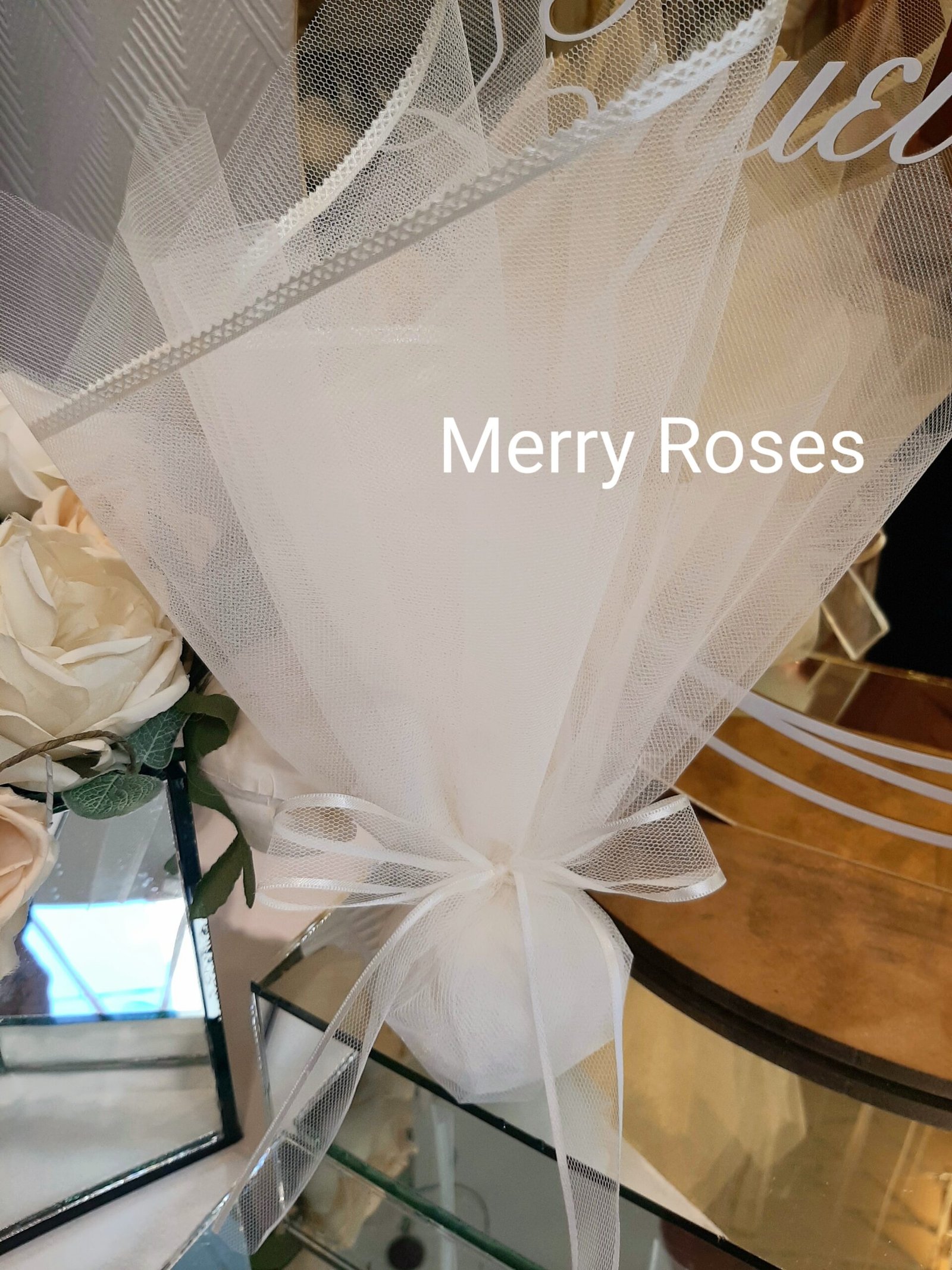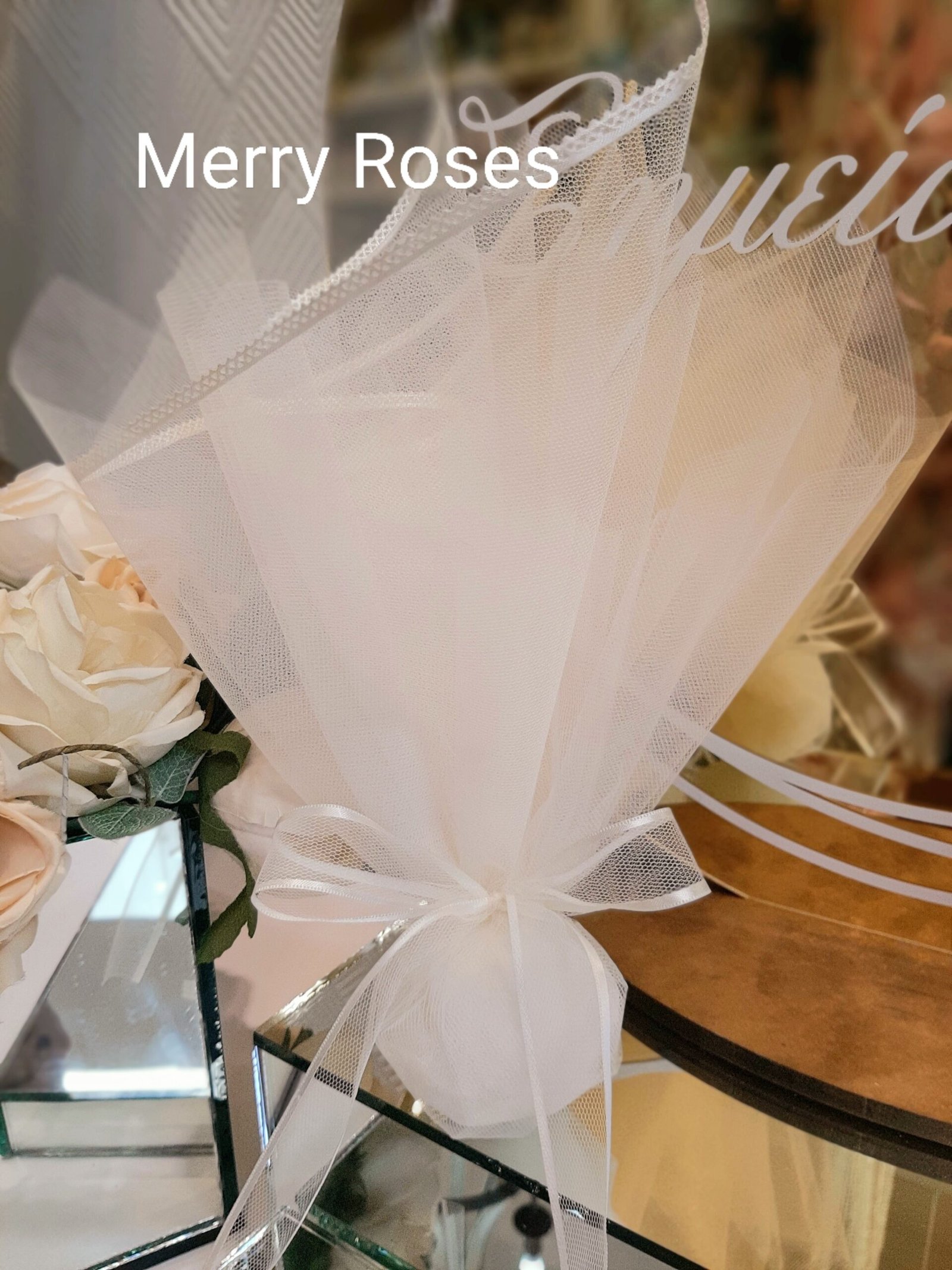 Ιδιαίτερη μπομπονιέρα γάμου με τούλι ιβουάρ 45*50 εκ με φινίρισμα σατέν ,δεμένη με φίνα τούλινη κορδέλα φιόγκο με φινίρισμα ιβουάρ σατέν.