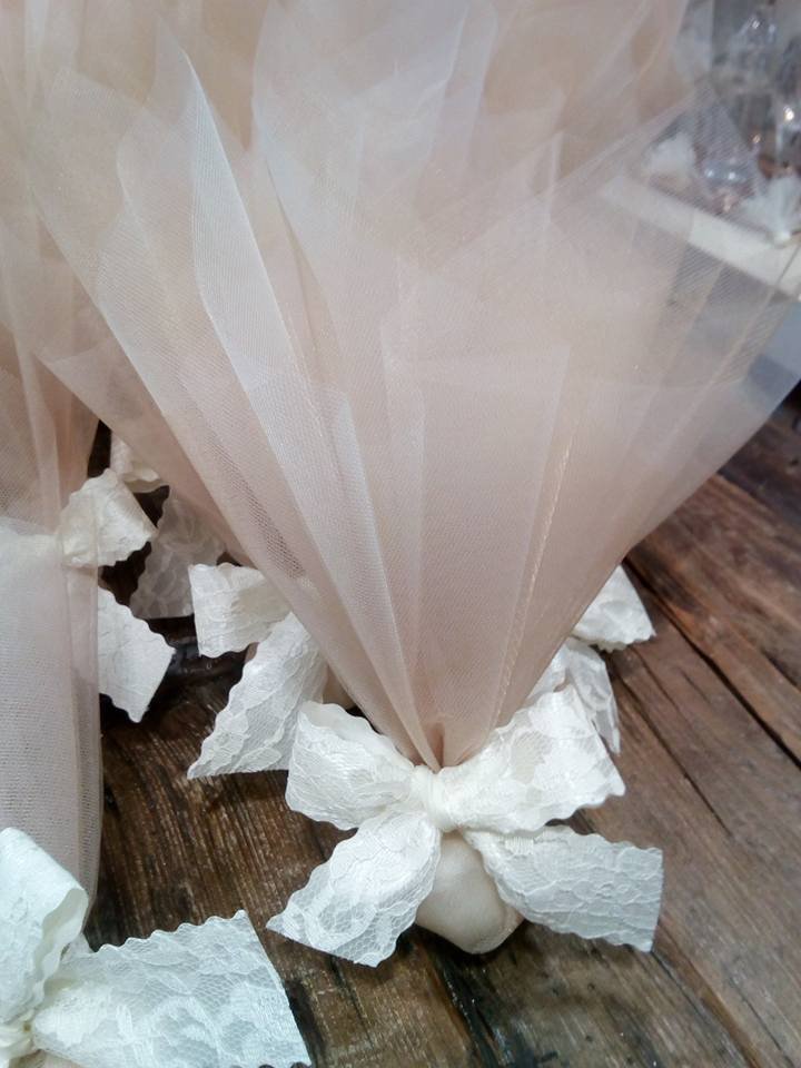 Μπομπονιέρα γάμου με δίχρωμο τούλι 45 * 50 εκ ( χρυσό-ιβουάρ) δεμένη με φιόγκο ντουμπλαρισμένης δαντέλας 2,5 εκ