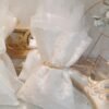 Μπομπονιέρα γάμου πουγκί ντουμπλαρισμένης δαντέλας με εσωτερικό τούλι ,δεμένο με χρυσή διακοσμητική ράβδο ολόγυρα.