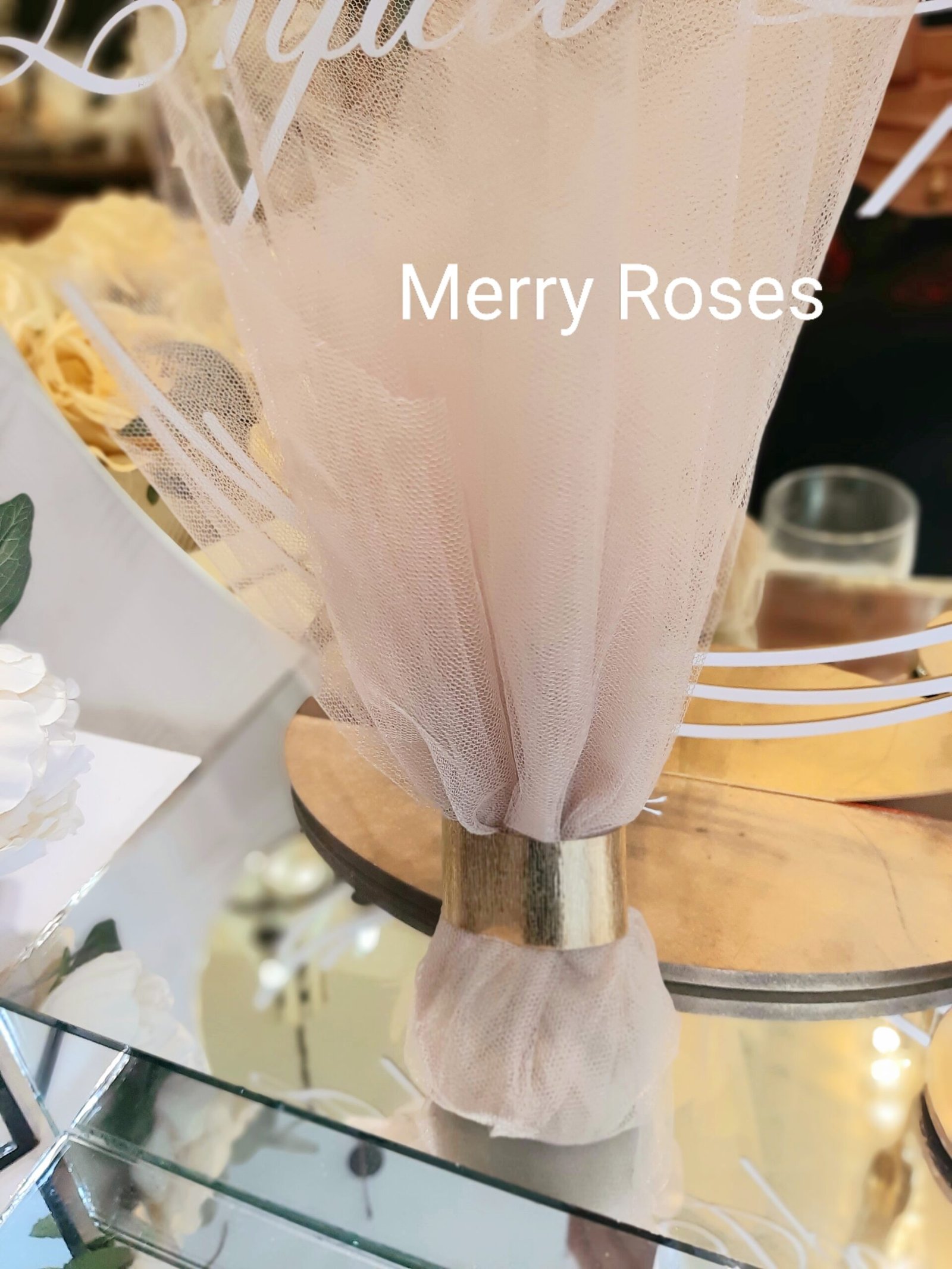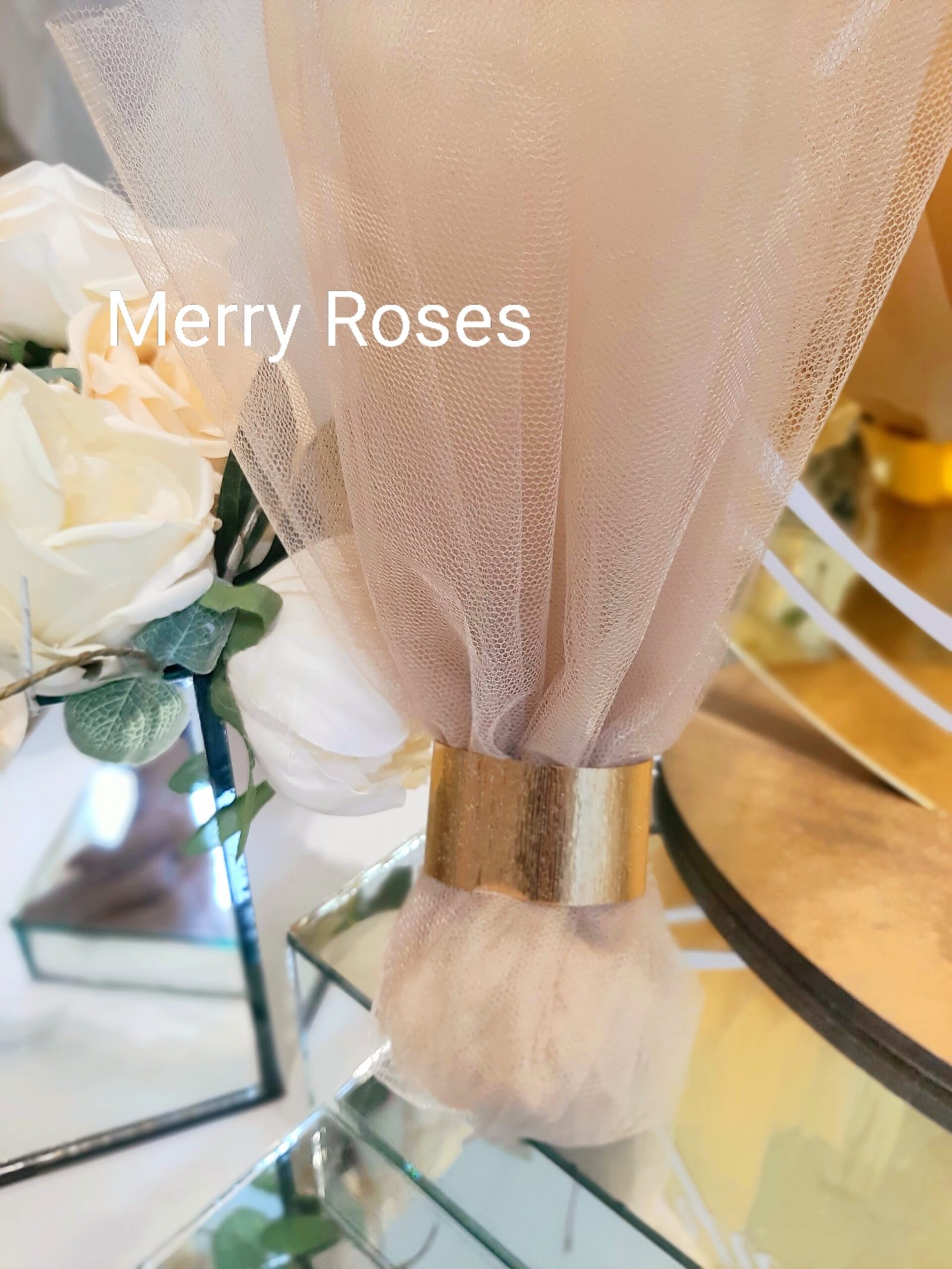 Λαμπερή μπομπονιέρα γάμου με χρυσό τούλι γαλλικό 50×50 και δέσιμο με χρυσή σφυρήλατη μεταλλική ράβδο