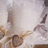 Μπομπονιέρα γάμου με τούλι 45*45 και μαζί με πουά τούλι ιβουάρ 36*36 ,δεμένη με φιόγκο δαντέλας και χρυσή μεταλλική καρδιά