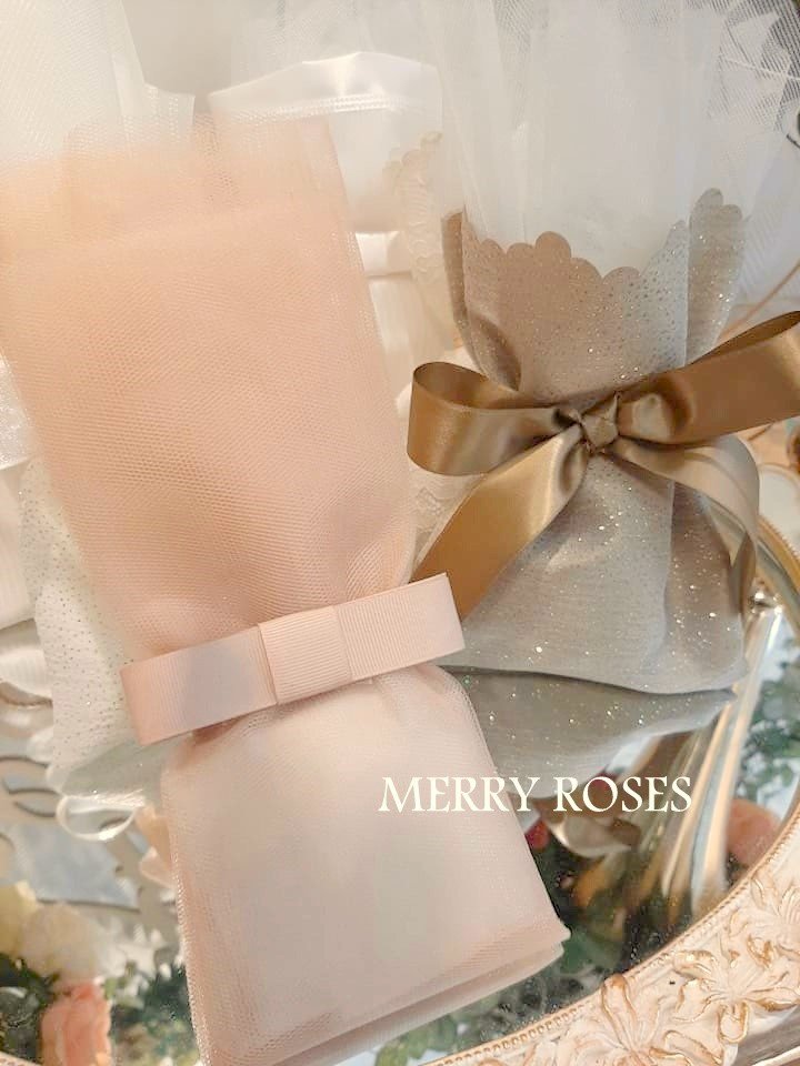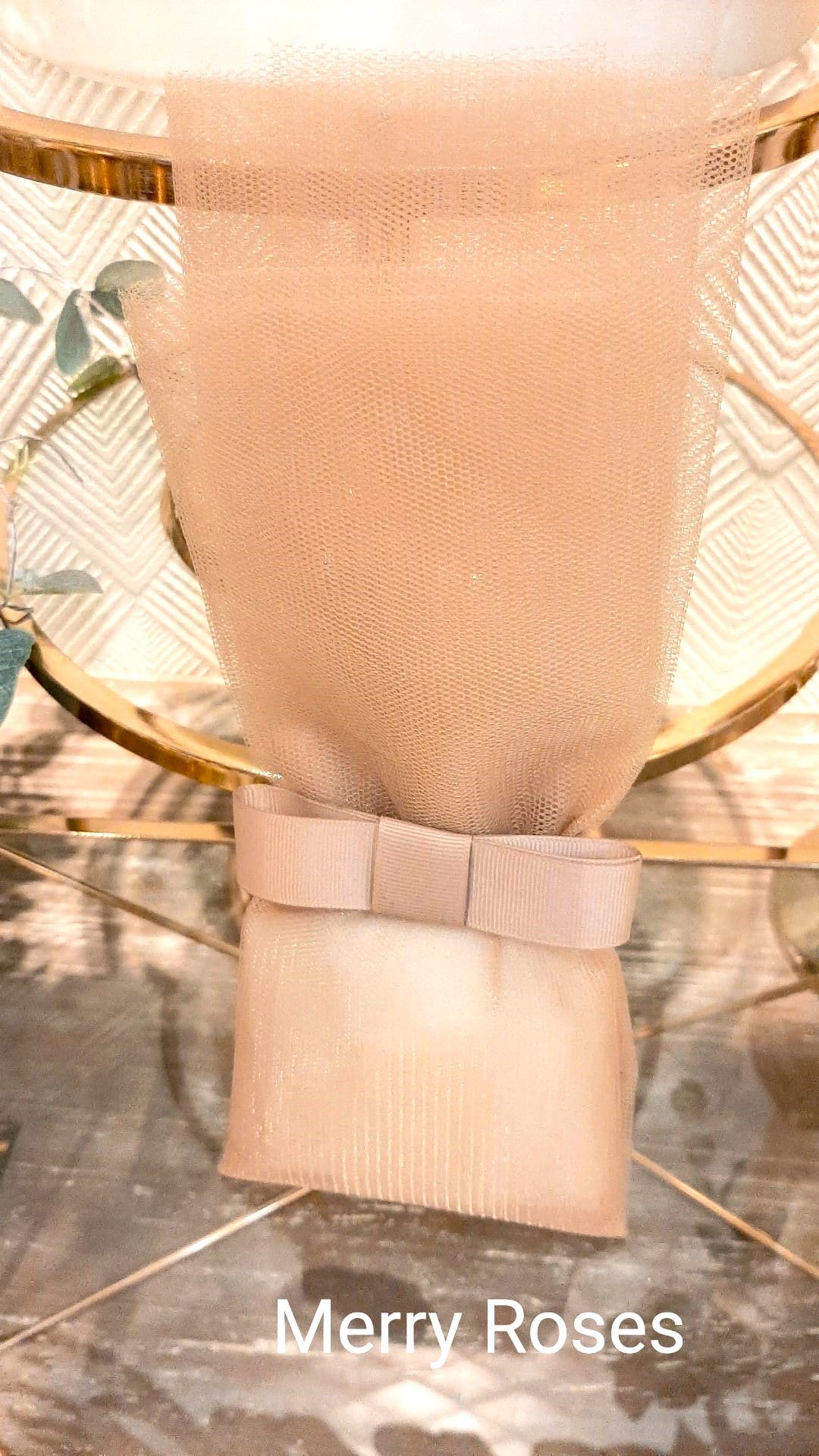Τούλινη μπομπονιέρα γάμου με χρυσό τούλι γαλλικό και γκρό κορδέλα δέσιμο φιόγκο τύπου Channel
