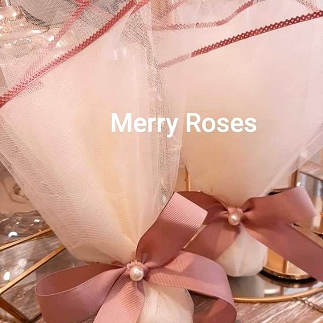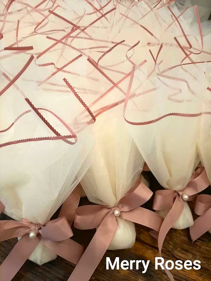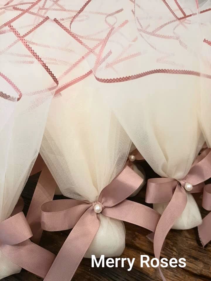 Τούλινη μπομπονιέρα γάμου 45 * 50 εκ ιβουάρ με φινίρισμα σατέν dusty pink ,δεμένη με φιόγκο απο γκρό κορδέλα dusty pink (σάπιο μήλο) χρώματος και πέρλα.
