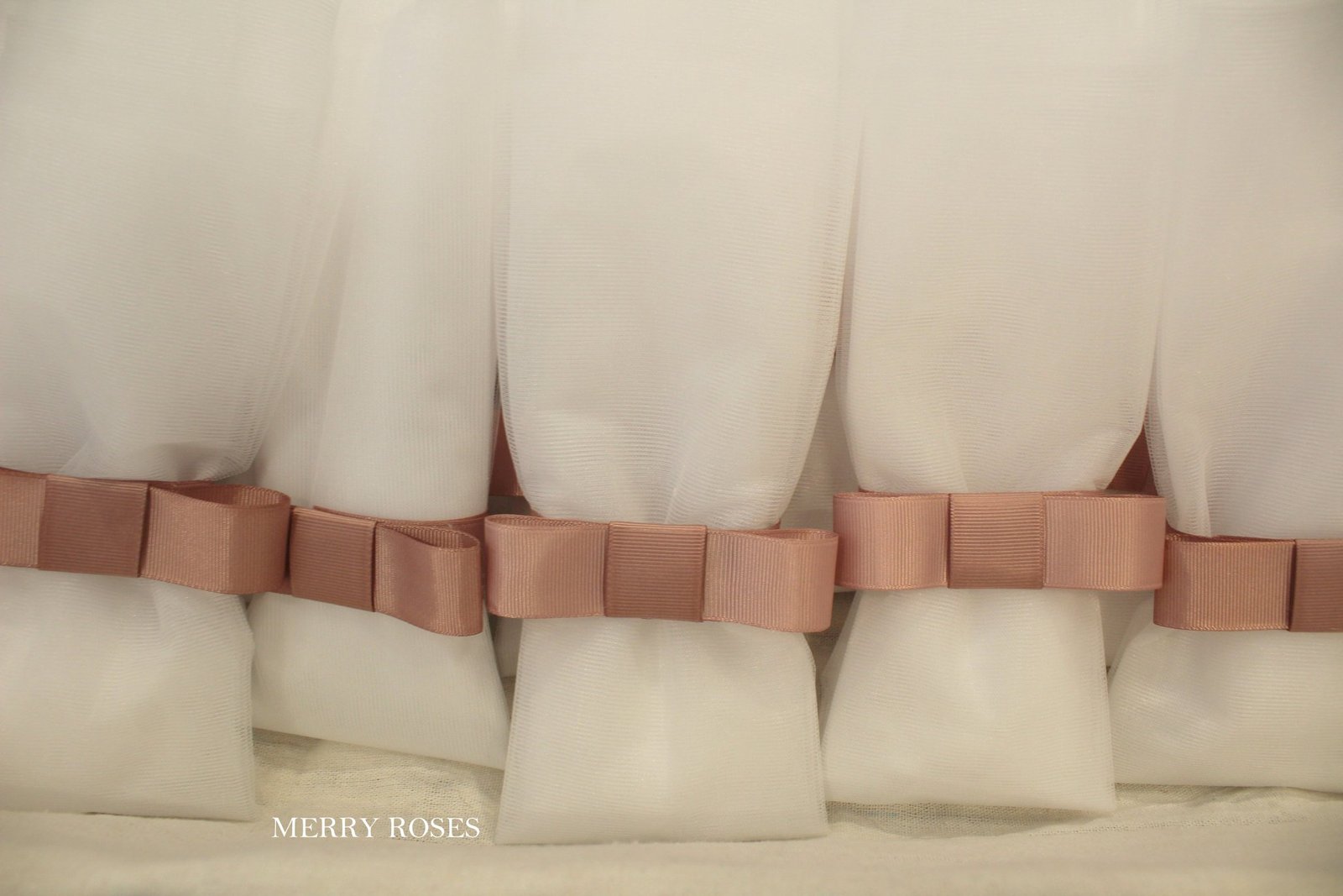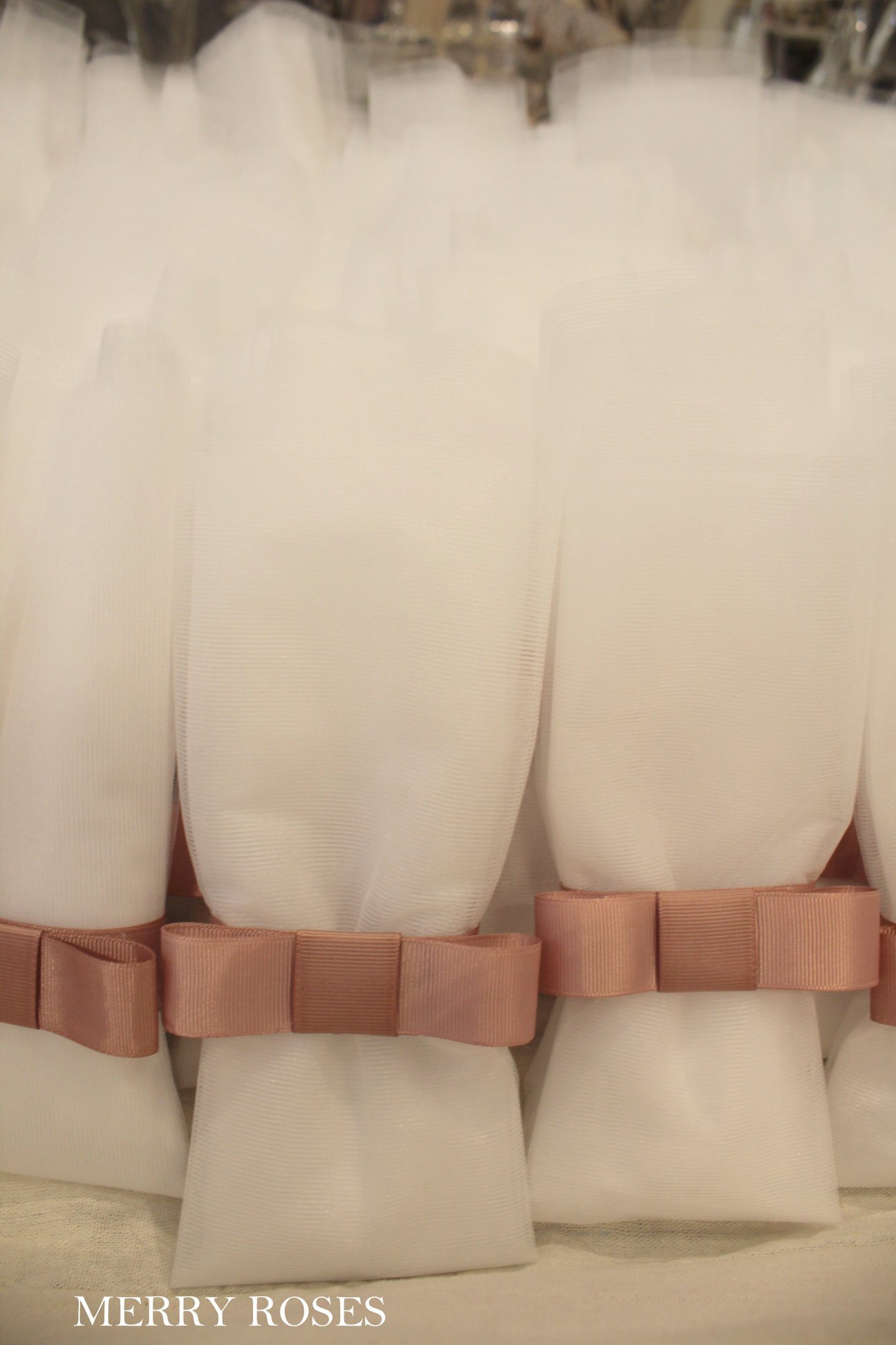 Τούλινη μπομπονιέρα γάμου ιβουάρ με τούλι 45*50 εκ, με γαλλικό φιόγκο απο γκρό κορδέλα dusty pink (σάπιο μήλο) χρώματος.