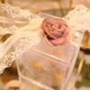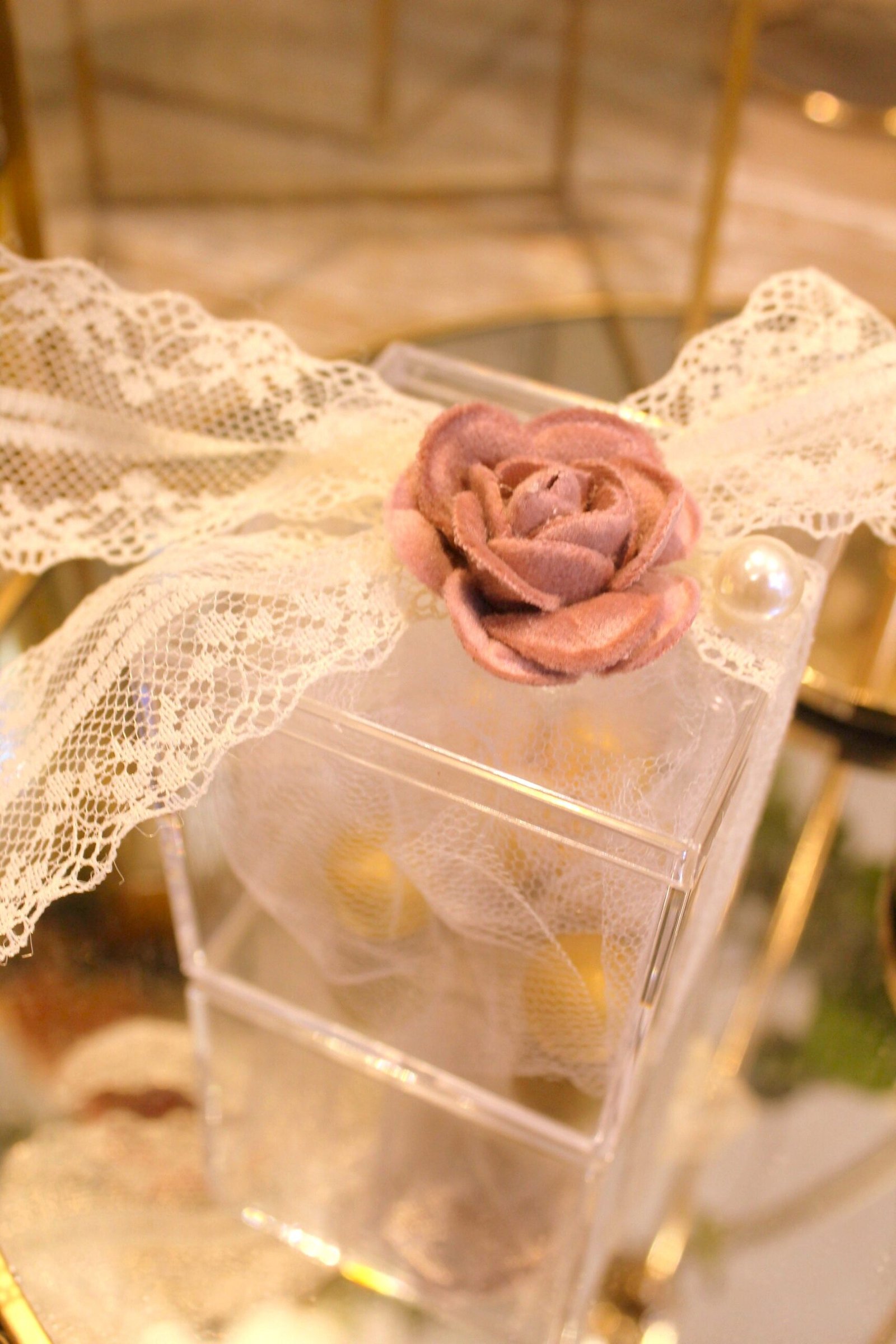 Μπομπονιέρα vintage ,κουτί πλεξιγκλάς με λουλούδι σουέτ ,σάπιο μήλο χρώματος,δαντέλα και πέρλα.
