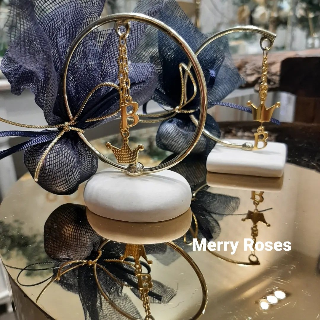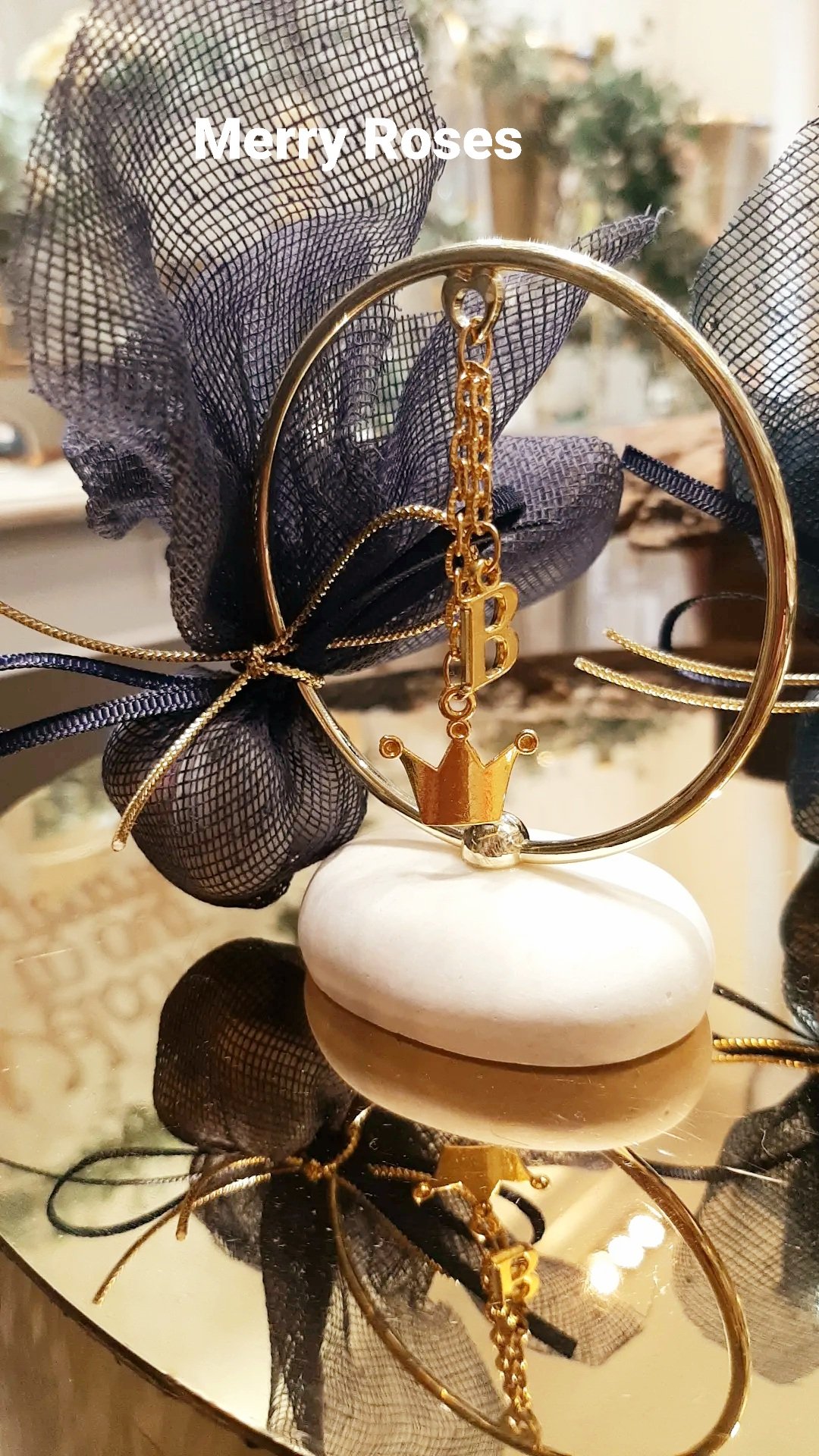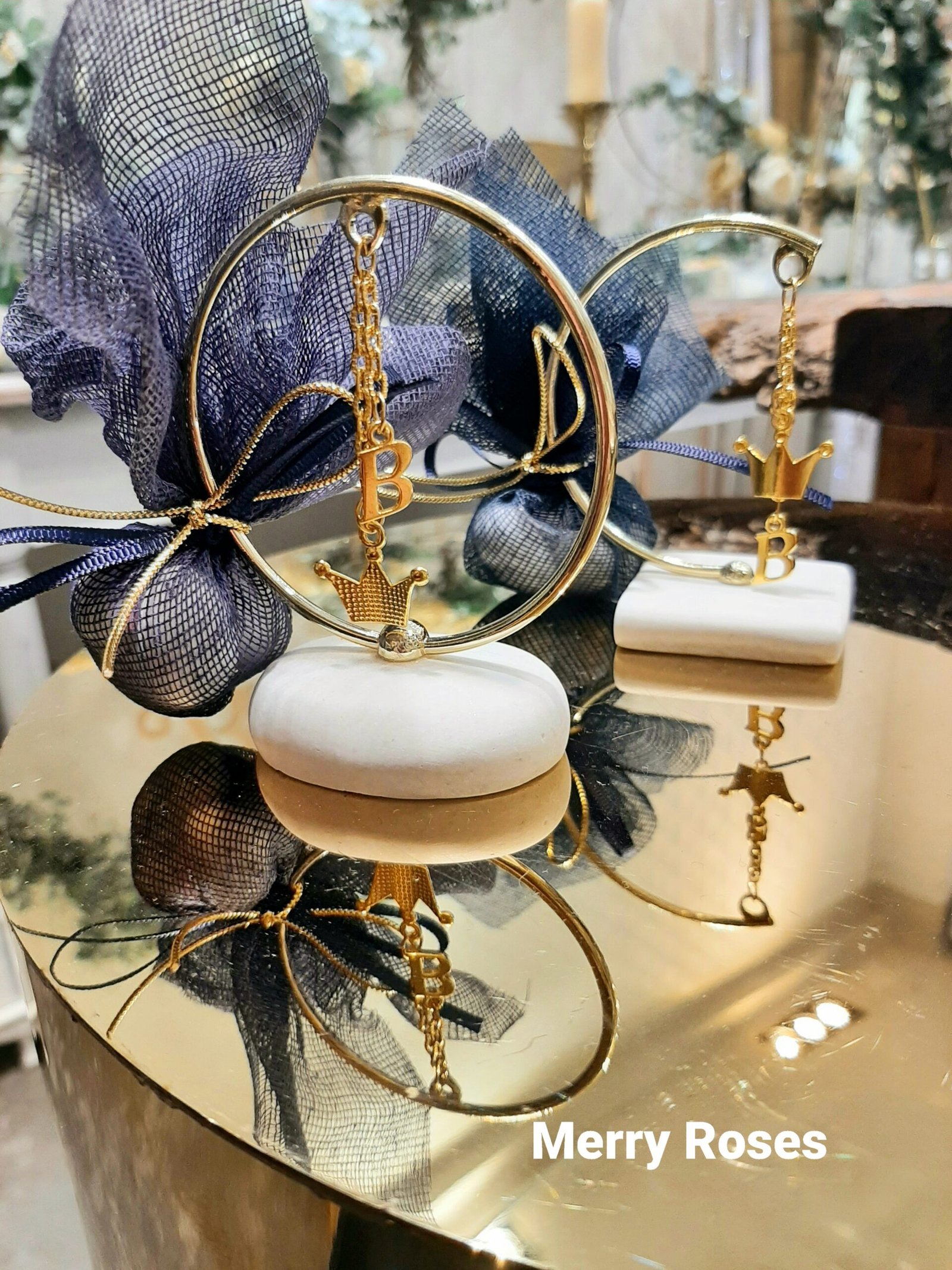 Μπομπονιέρα βάπτισης κορώνα μαζί με μονόγραμμα σε χρυσό στεφάνι στρογγυλλό  με βάση