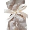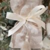 Μπομπονιέρα πουγκί υφασμάτινο 12×17 εκ με λευκά λουλούδια και φούντα.