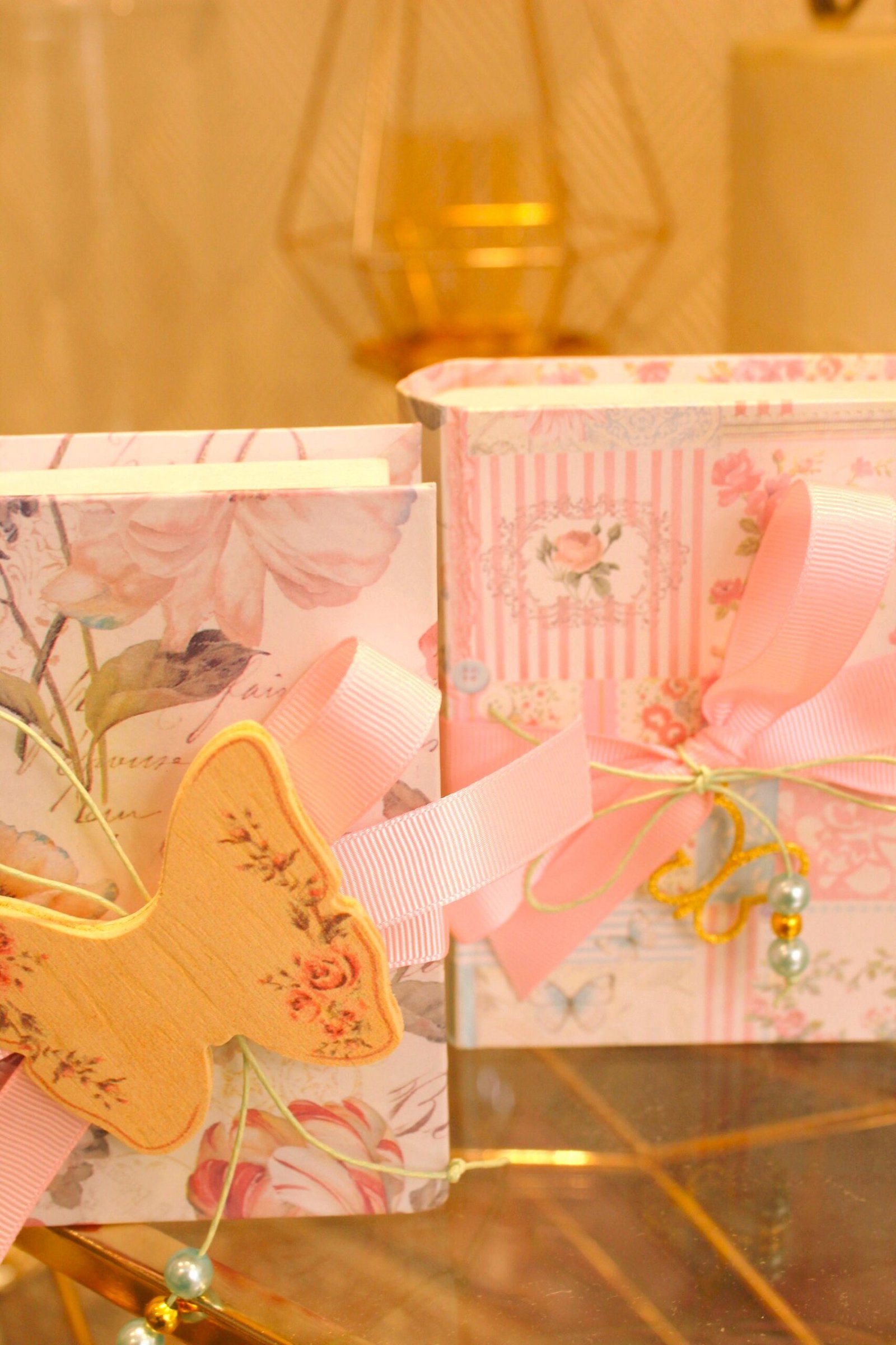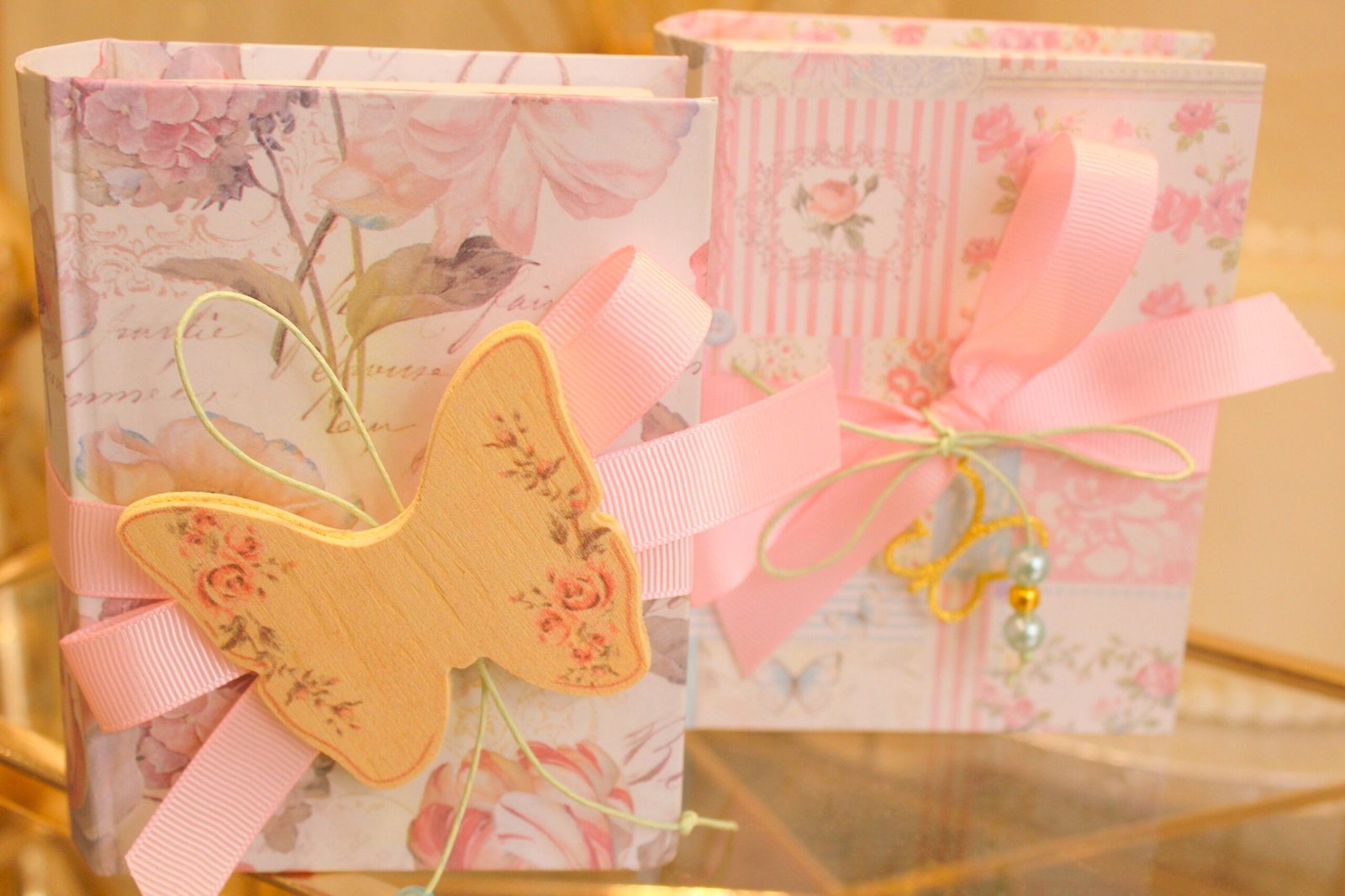 Μπομπονιέρα βάπτισης πεταλούδα σε κουτί κασετίνα floral δεμένο με κορδέλες και πέρλες