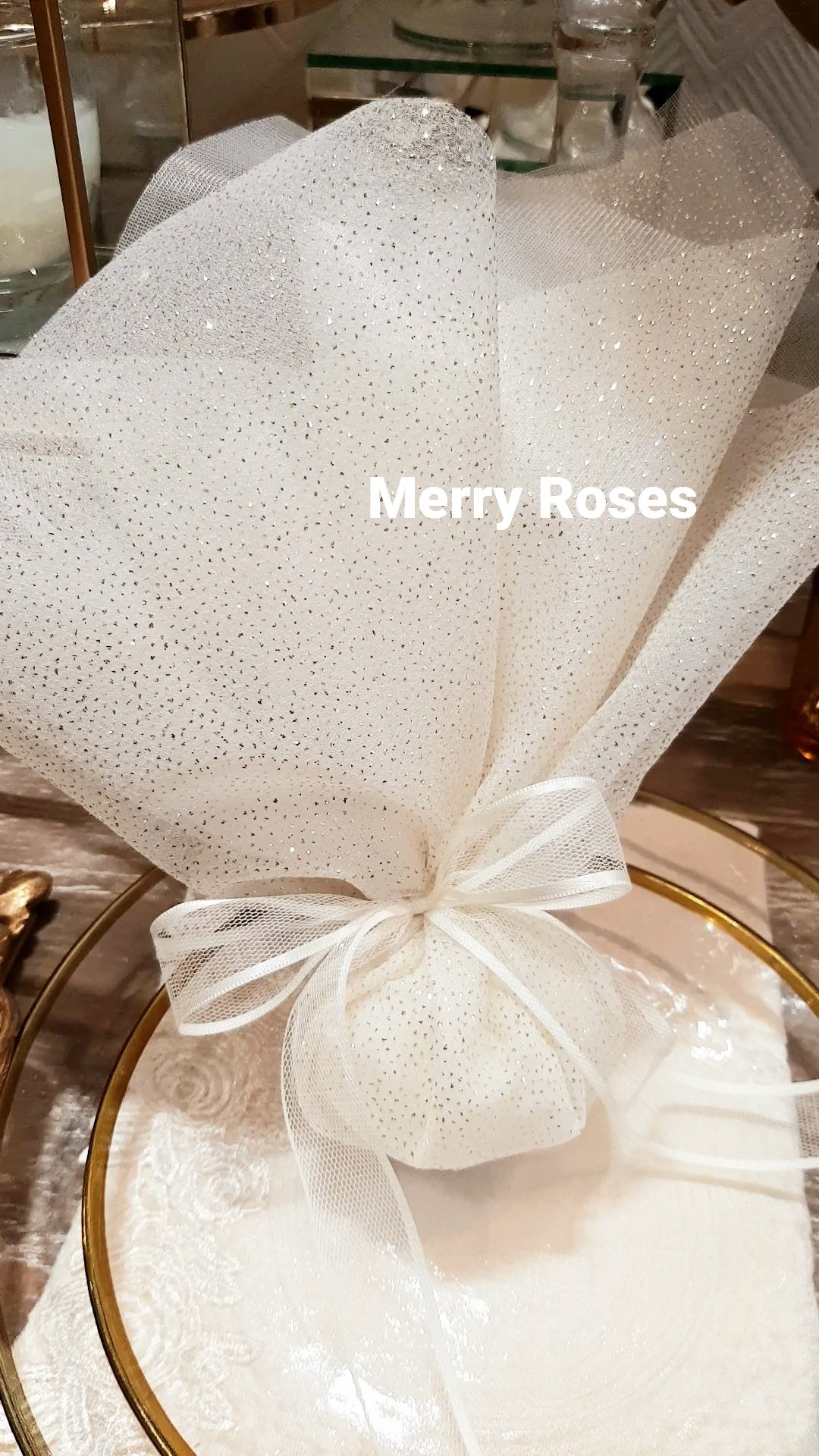 Ξεχωριστή μπομπονιέρα γάμου με λάμψη χρυσού απο τούλι ύφασμα χρυσής λάμψης.