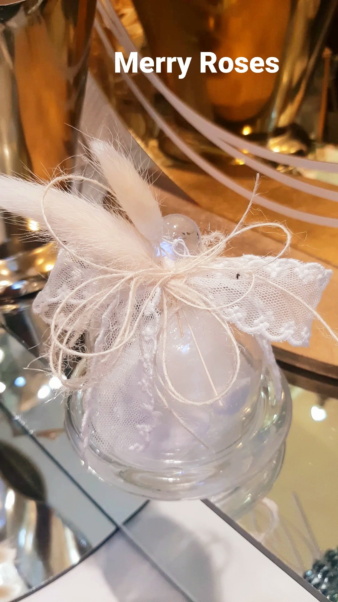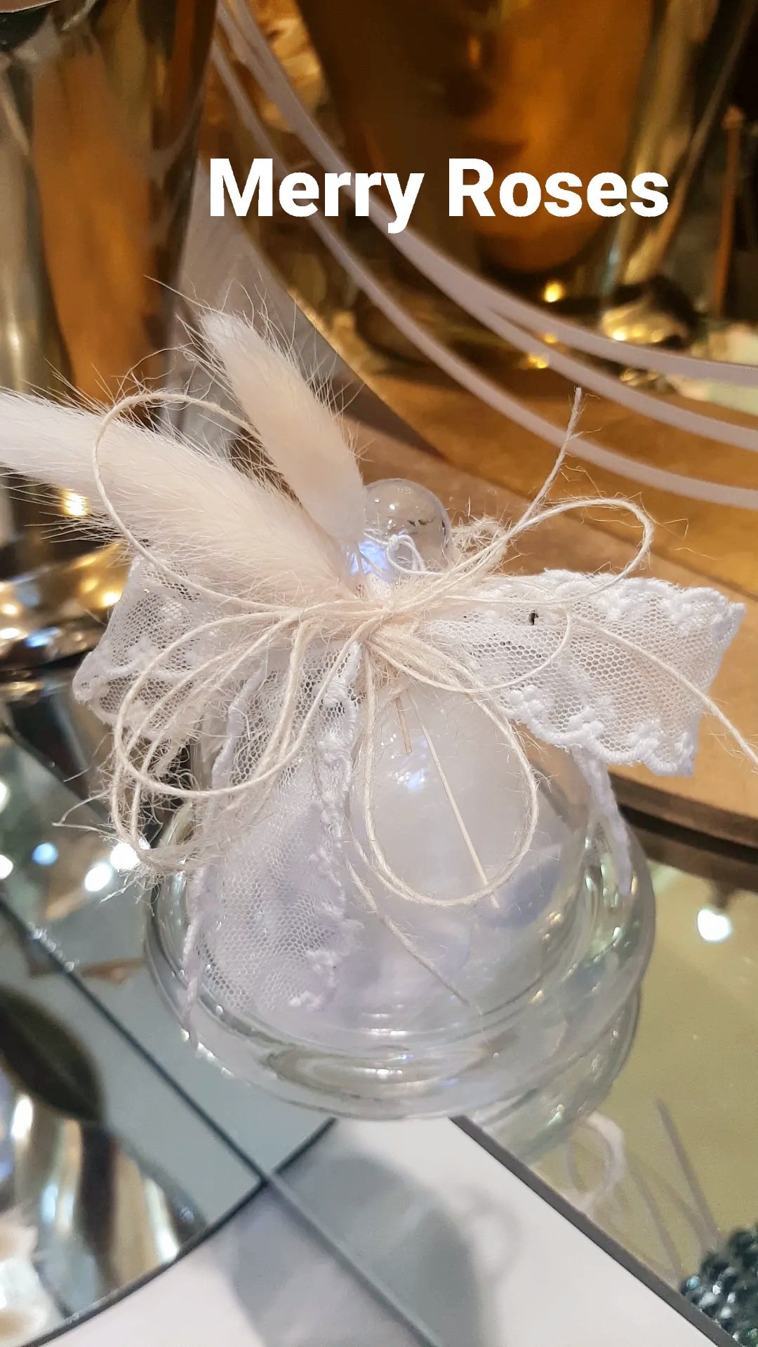 Γυάλινη τουρτιέρα με φυσικά λευκά άνθη και ιδιαίτερες κορδέλες δέσιμο.