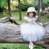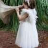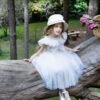 Ένα ξεχωριστό φόρεμα στο χρώμα της πούδρας , που το χαρακτηρίζει το ιδιαίτερο μπούστο του από πλούσιο τούλι , κεντημένες πέρλες και κρύσταλλα που καταλήγουν στο πίσω μέρος σχηματίζοντας ένα βαθύ V. Η φούστα του φορέματος αποτελείται από τούλι και ιδιαίτερη ανάγλυφη γαλλική δαντέλα .Η εσωτερική επένδυση του φορέματος αποτελείται από μαλακό βαμβακερό ύφασμα.
