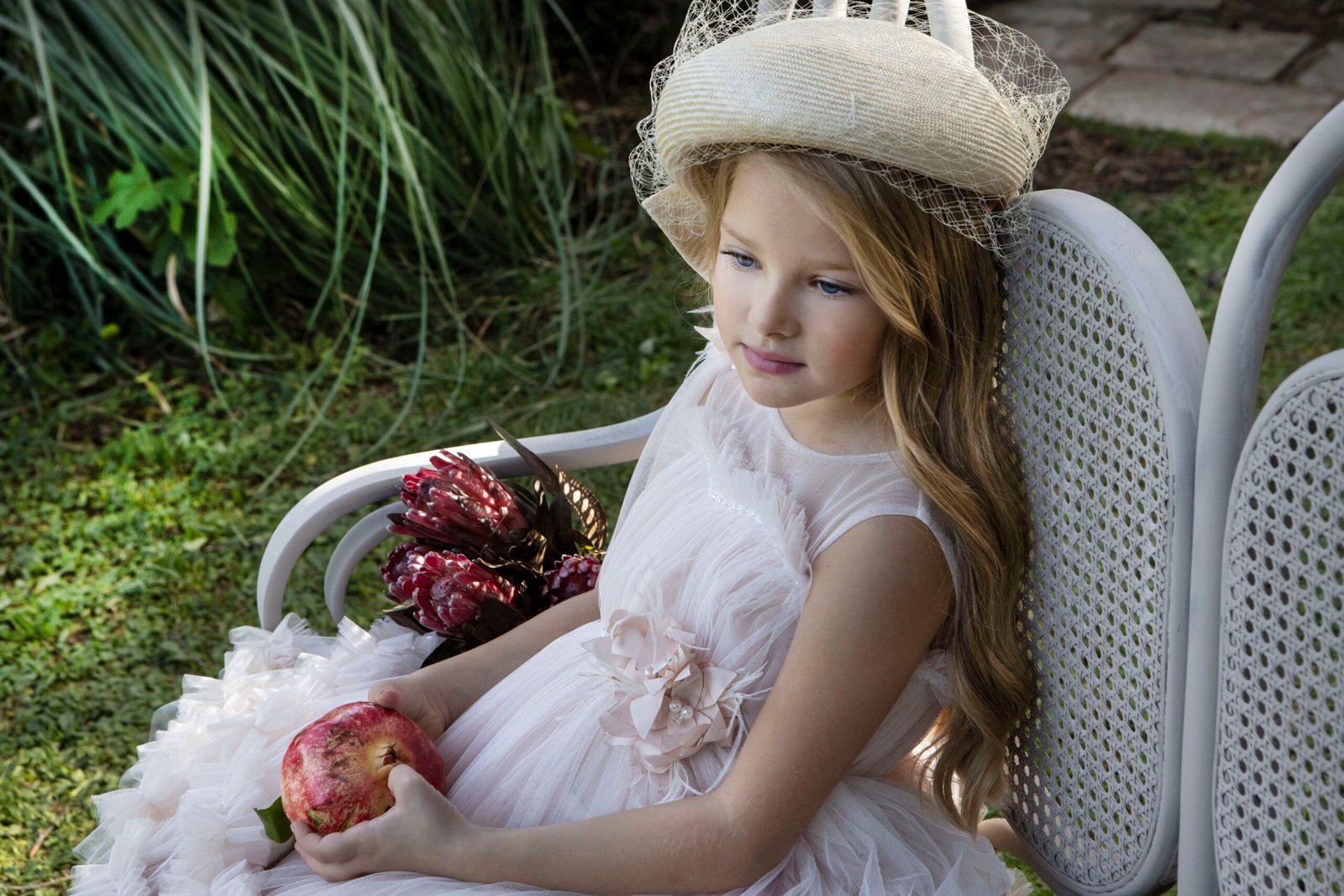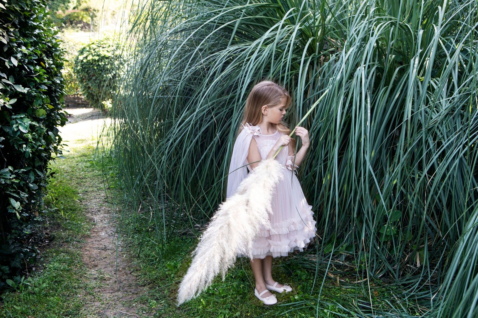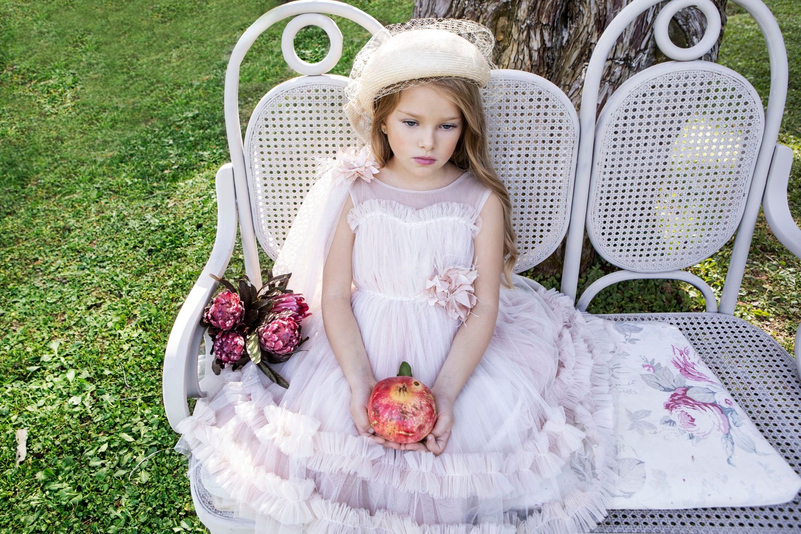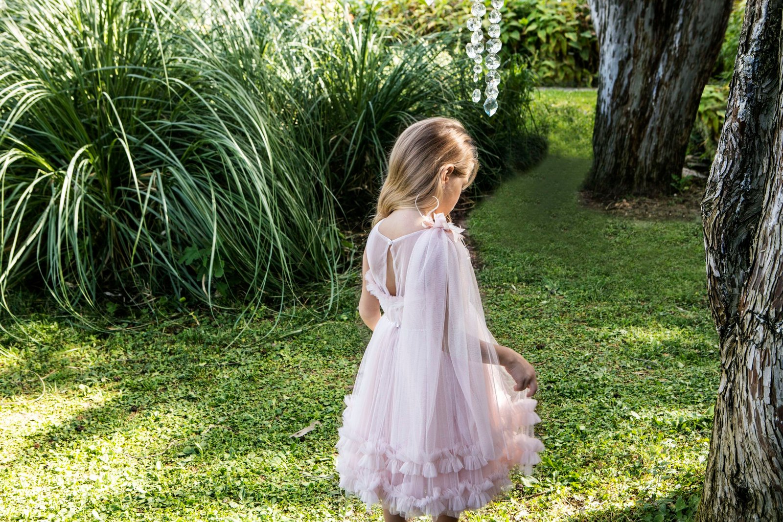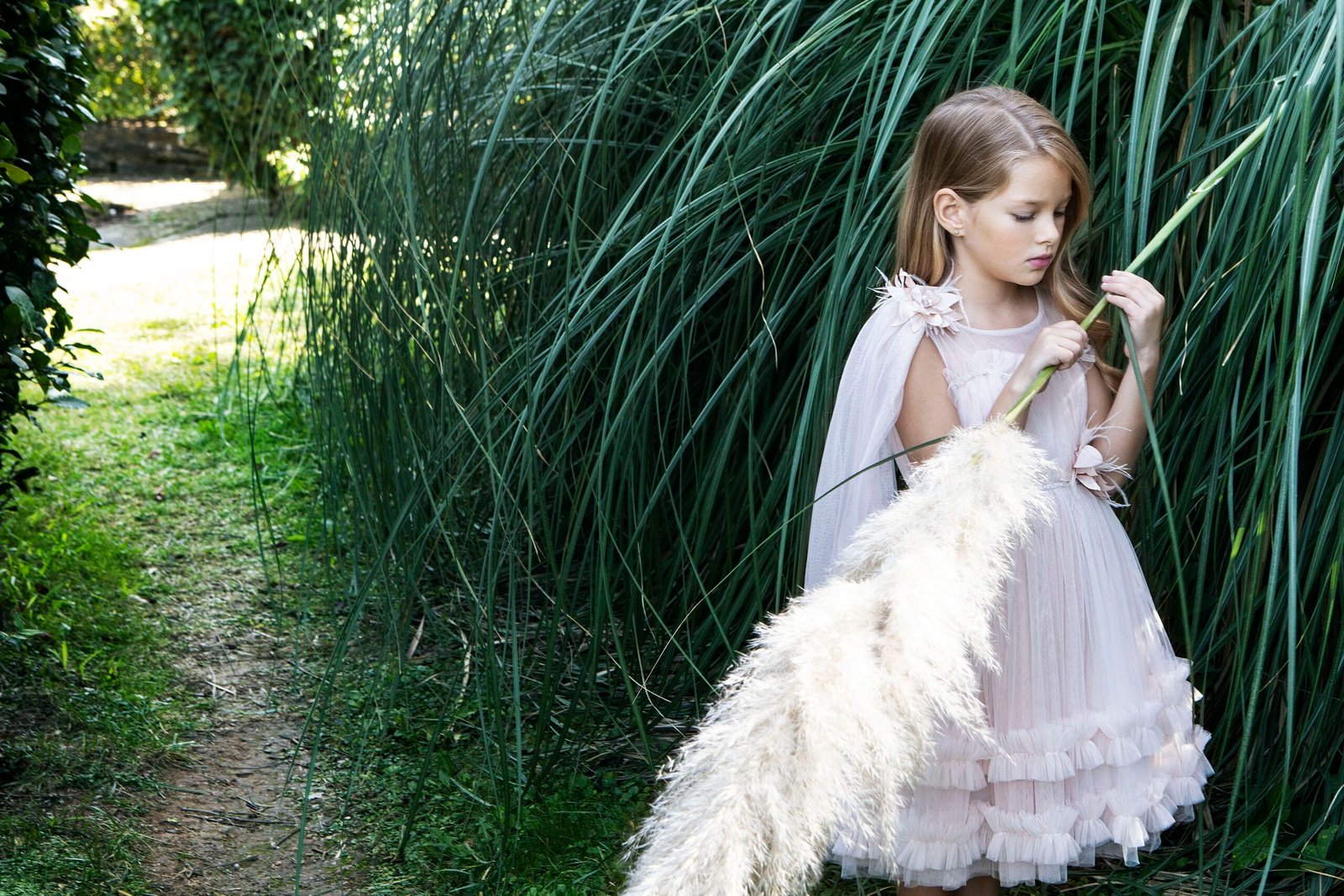 Ξεχωριστό φόρεμα  σε σομόν απόχρωση με ιδιαίτερο τούλινο βολάν στο τελείωμα της φούστας. Το μπούστο στολίζει μια τρέσα με διάφανα κρυσταλλάκια και τον ένα ώμο του φορέματος τον διακοσμεί ενα τούλινο πέπλο στην ιδια απόχρωση . Εσωτερική επένδυση από μαλακό βαμβακερό ύφασμα . Ασορτί κορδέλα με το ίδιο λουλούδι του φορέματος και κατ’ επιλογή μπαντάνα ή τουρμπάνι .