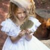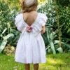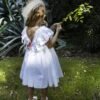 Φόρεμα Βάπτισης βαμβακερό μπροντερί σε λευκή απόχρωση με ιδιαίτερες δαντέλες στο μπούστο. Τη μέση του φορέματος στολίζει χειροποίητο λουλούδι όπως και στο πίσω μέρος. Ασορτί κορδέλα με το ίδιο λουλούδι του φορέματος κατ’ επιλογή μπαντάνα ή τουρμπάνι .