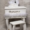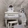 Μπουντουάρ με οβάλ καθρέφτη πλούσιο στολισμό στο πάνω μέρος από τούλια όπως και στο καρεκλάκι, ασορτί λαμπάδα με τον ίδιο στολισμό, σετ λαδιού (3 κεράκια, μπουκαλάκι λαδιού, σαπουνάκι) .