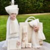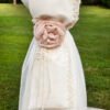 Κ21.10 τσάντα ώμου με πλούσιο στολισμό από βουάλ μεταξωτό ύφασμα , κορδονέ δανδελα και μεγάλο χειροποίητο λουλούδι σε σάλιο μήλο απόχρωση, ασορτί λαμπάδα με τον ίδιο στολισμό, σετ λαδιού (3 κεράκια, μπουκαλάκι λαδιού, σαπουνάκι). Κάθε πακέτο βάπτισης μπορεί να στολιστεί με οποιοδήποτε φόρεμα της συλλογής μας.