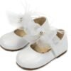 Γοβάκι από ματ συνθετικό δέρμα, με μονή μπαρέτα διακοσμημένη με υφασμάτινο χειροποίητο φιόγκο με μαραμπού φτερά, σε λευκό χρώμα.
