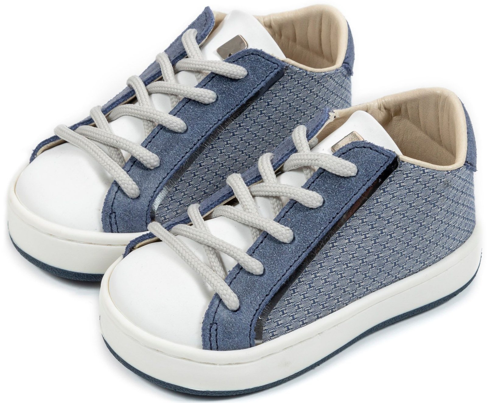 Δετό δίχρωμο sneaker από ύφασμα και δέρμα, σε χρώμα μπλε ρουά-λευκό.