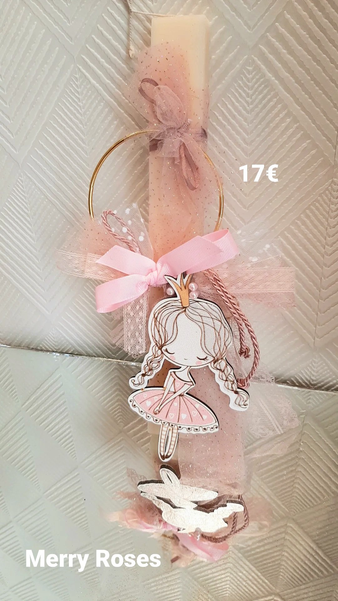 Παραμυθένια Αρωματική Πασχαλινή Λαμπάδα με Πριγκίπισσα διακοσμητική σε χρυσό στεφάνι κρεμαστό.