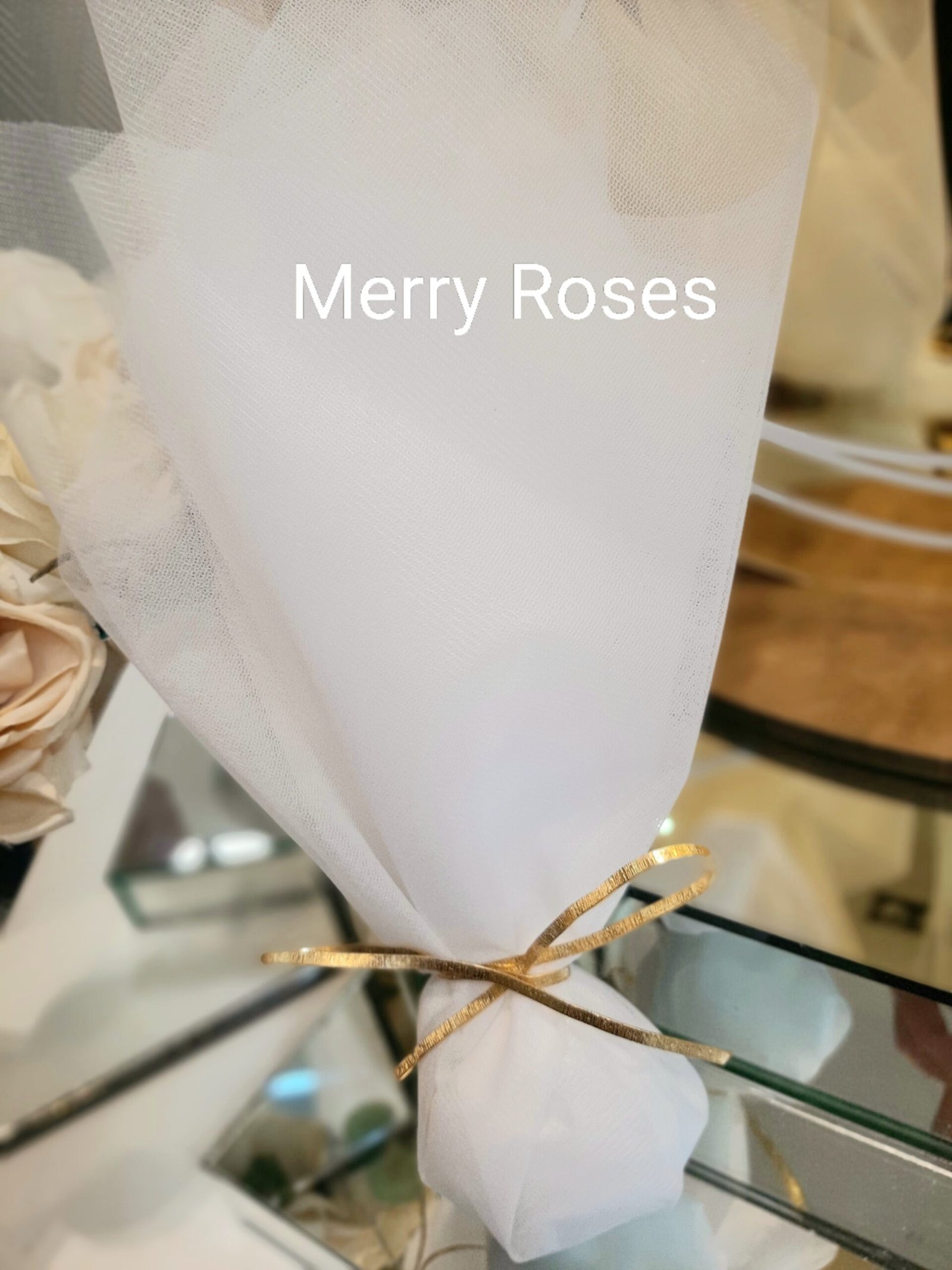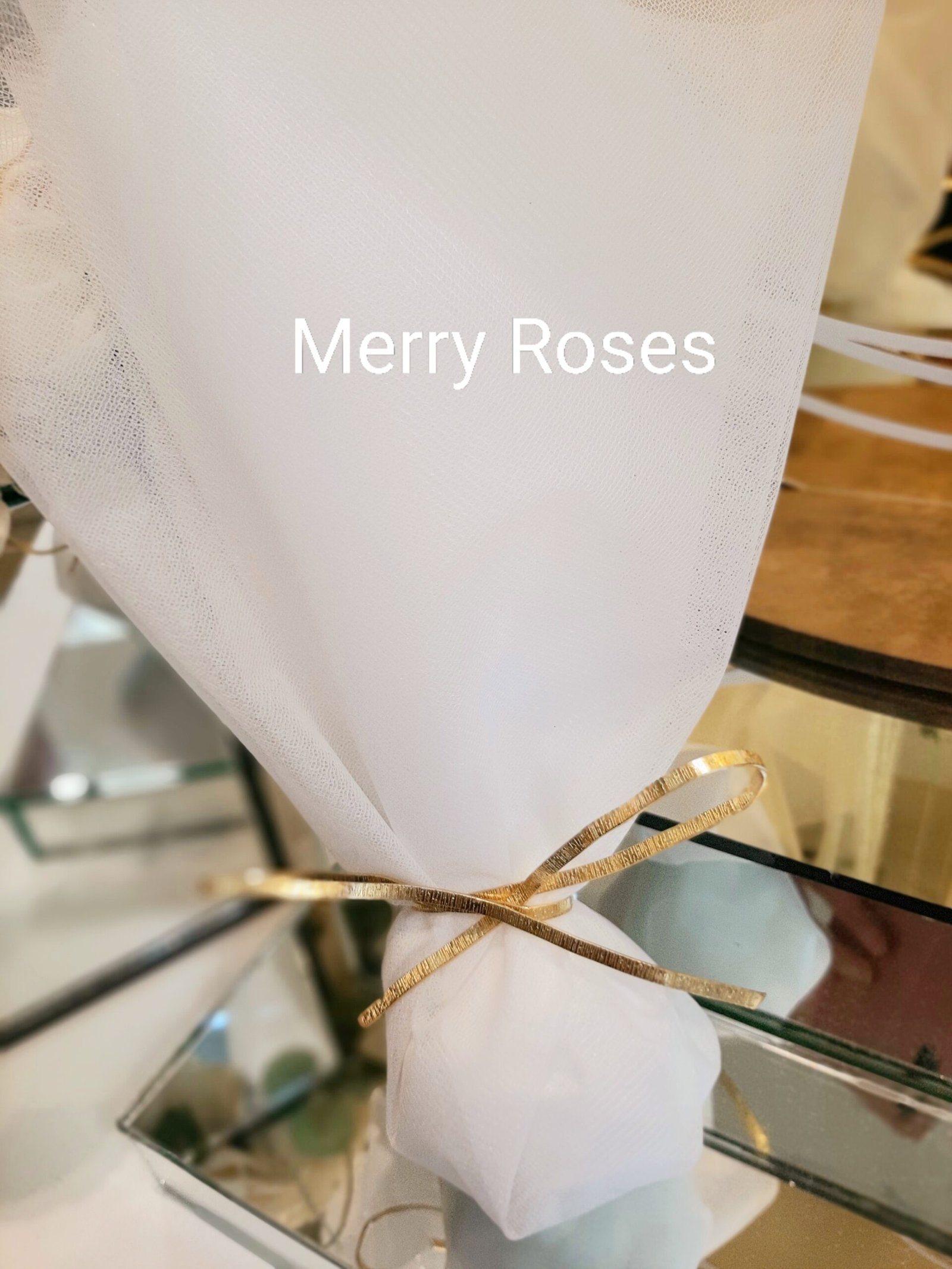 Luxury λευκή τούλινη μπομπονιέρα γάμου 50 × 60 εκ με δέσιμο φιόγκο απο χρυσή διακοσμητική σφυρήλατη μεταλλική ράβδο