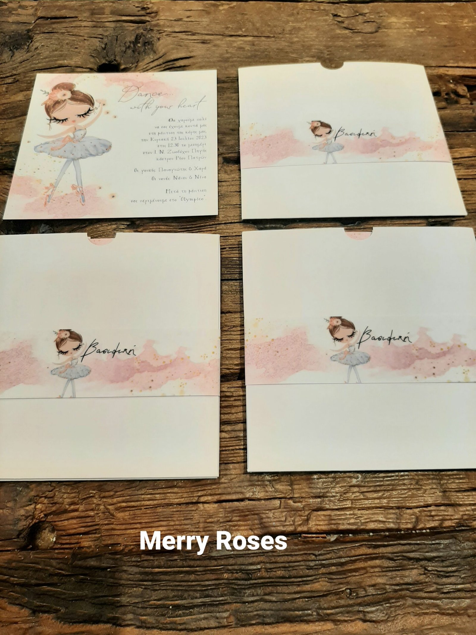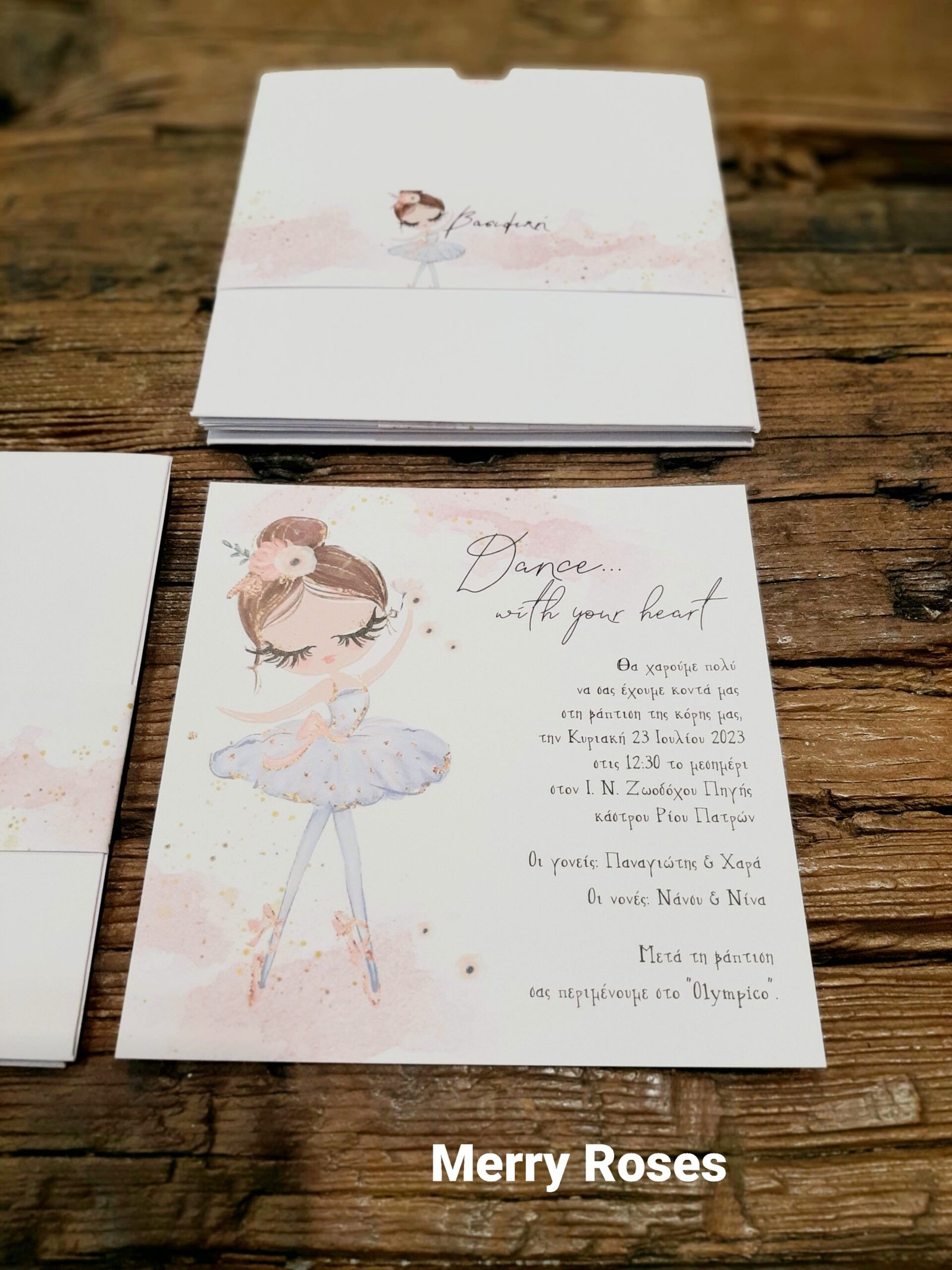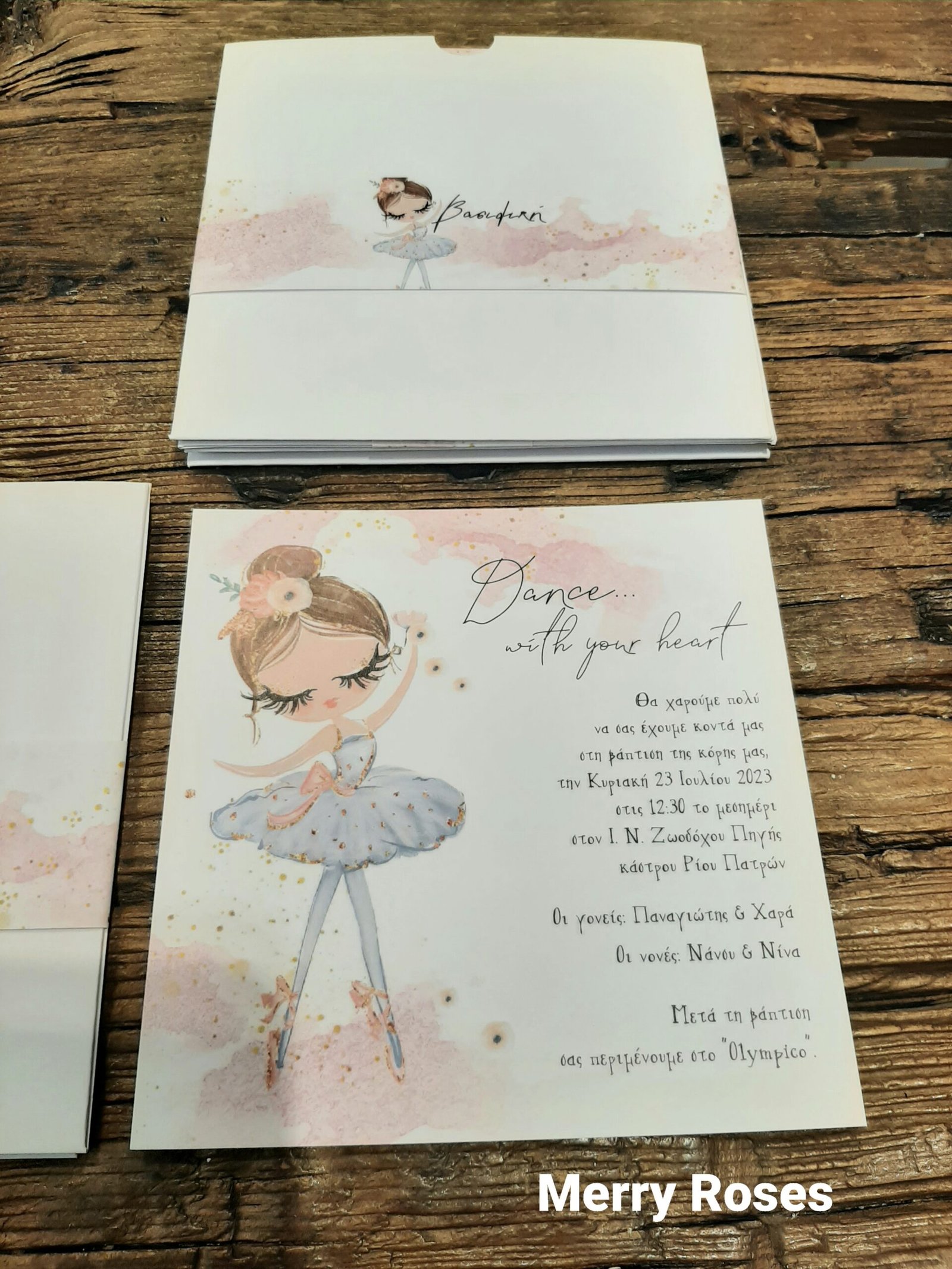 Προσκλητήριο βάπτισης μπαλαρίνα. Η κάρτα είναι με εκτύπωση μιας όψης και διάστασης 16*16 εκ