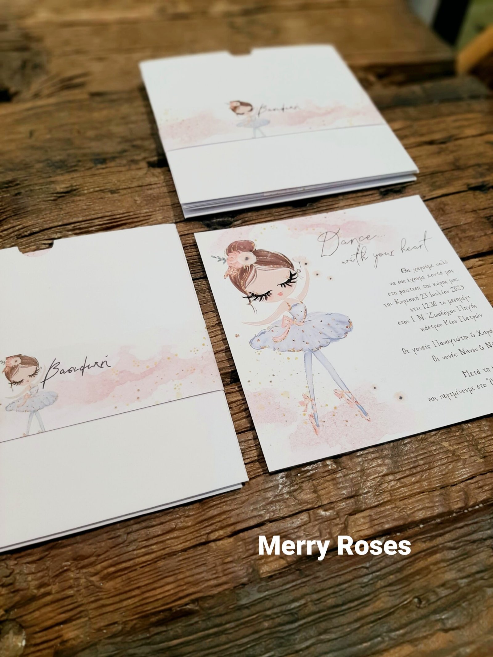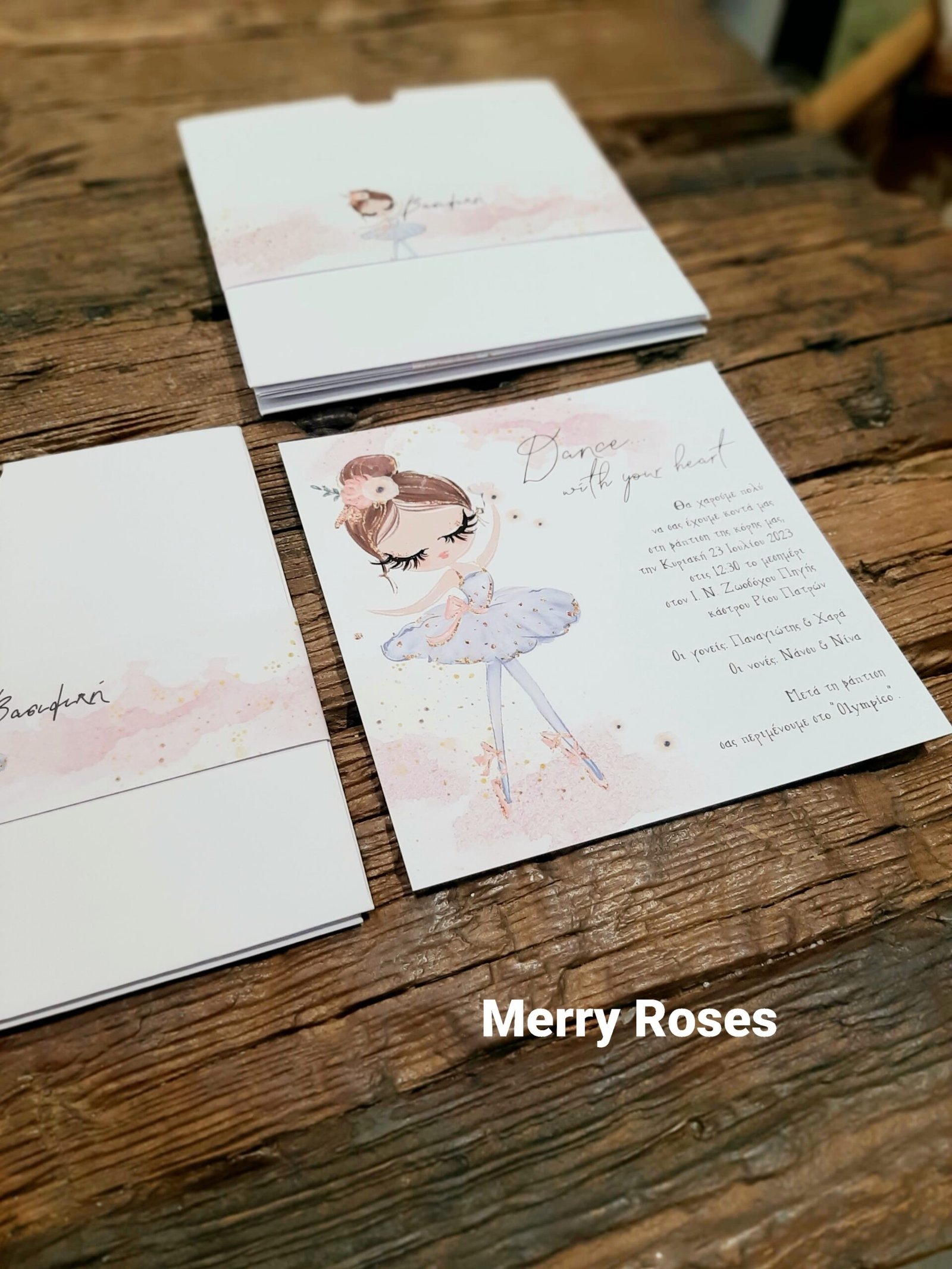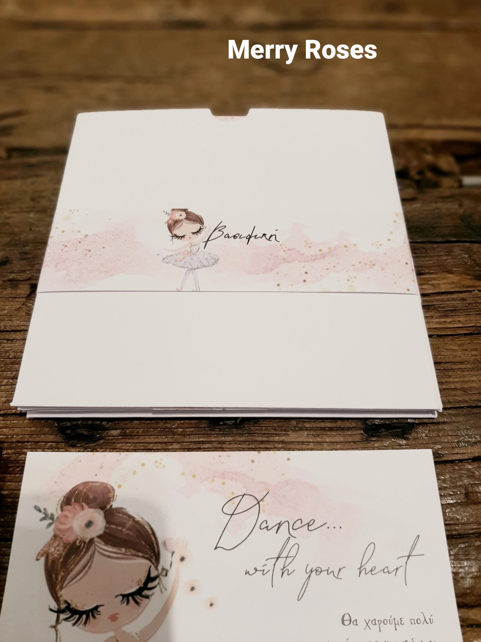 Προσκλητήριο βάπτισης μπαλαρίνα. Η κάρτα είναι με εκτύπωση μιας όψης και διάστασης 16*16 εκ