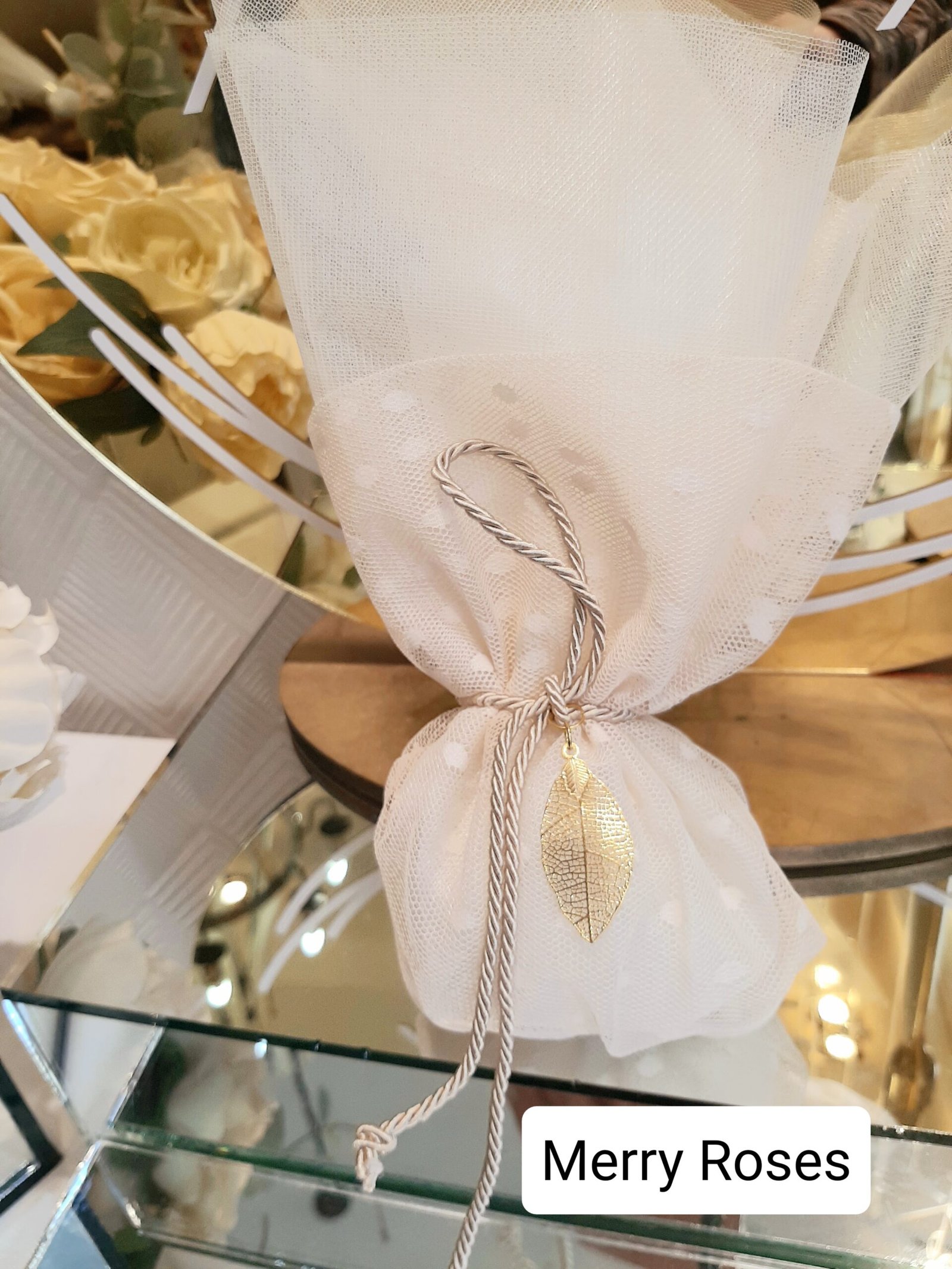 Δέσιμο με κορδόνι μπεζ χρυσό και χρυσό φυλλαράκι κόσμημα.