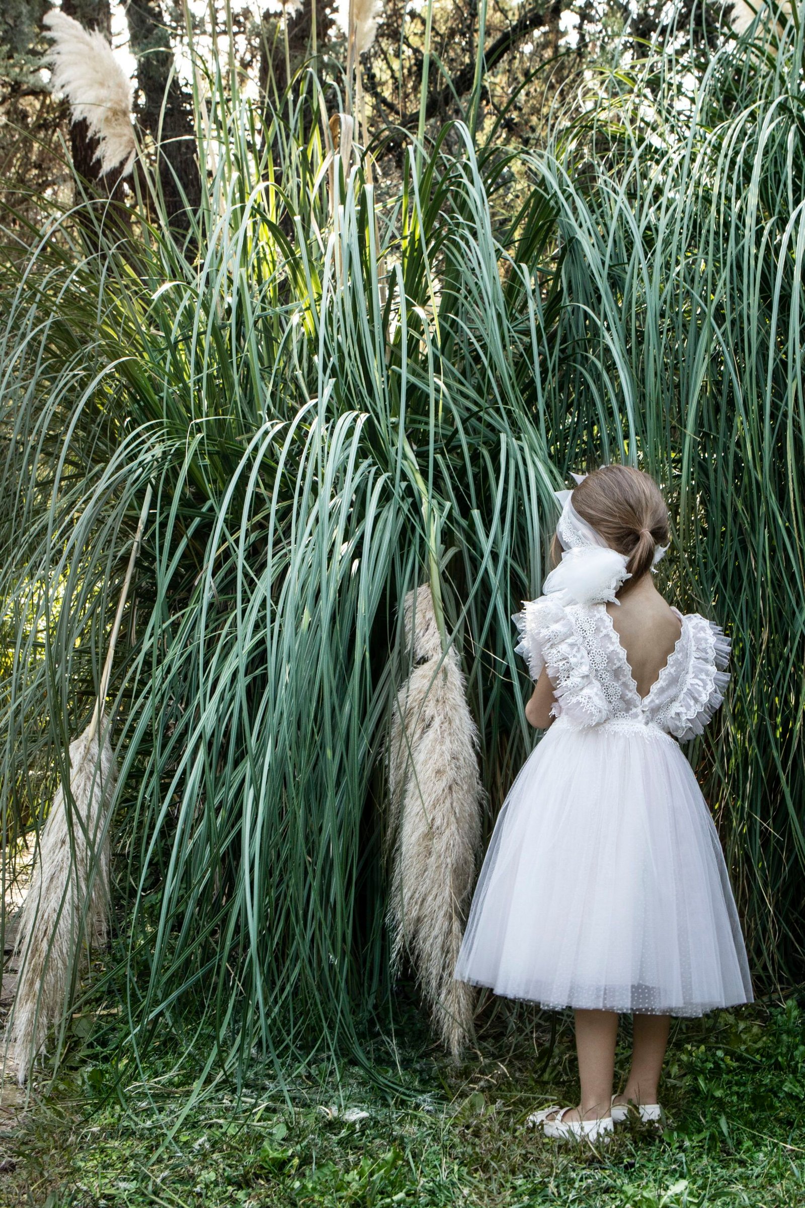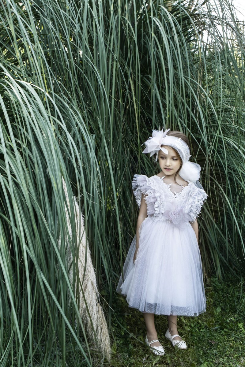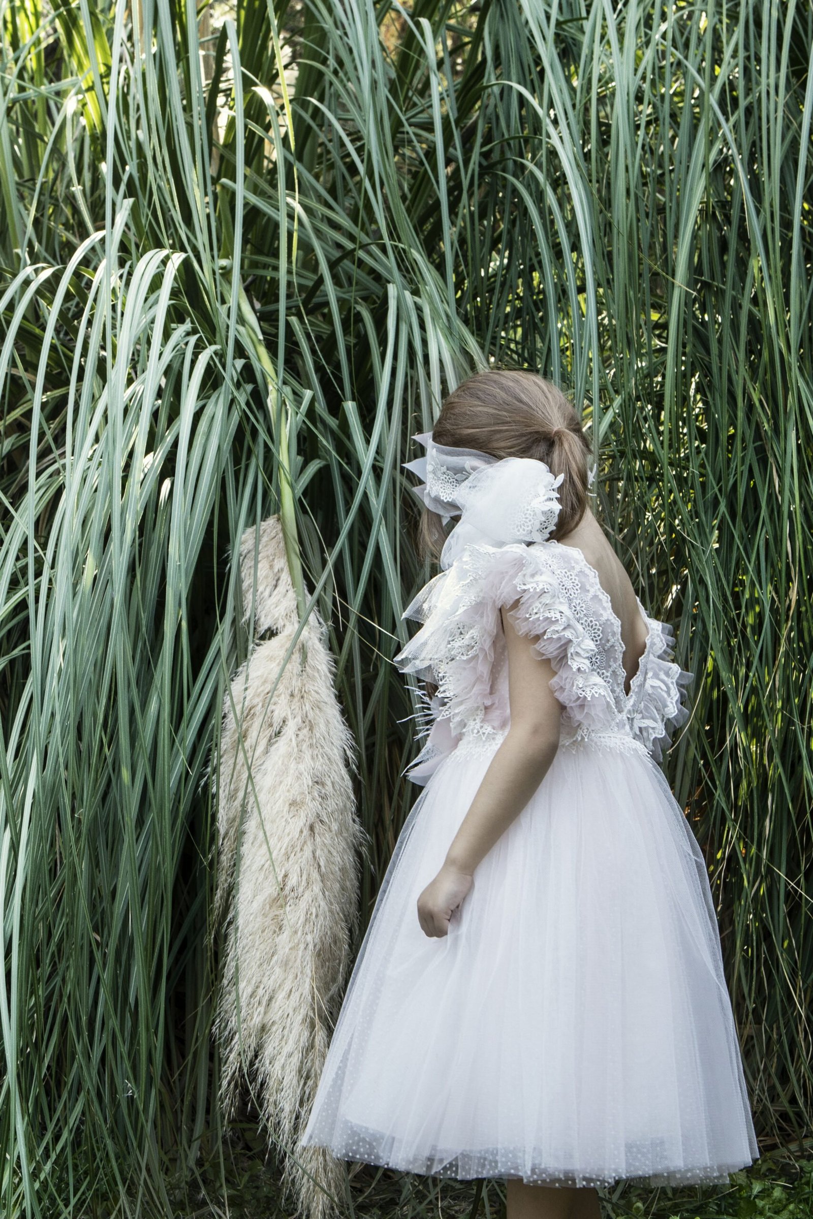 Ένα ρομαντικό φόρεμα σε baby pink απόχρωση , που το χαρακτηρίζει το ιδιαίτερο μπούστο του από ανάγλυφες δαντέλες και τούλι , σχηματίζοντας ενα βαθύ V στην πλάτη του. Αέρινα τούλια στην ίδια απόχρωση ολοκληρώνουν τη φούστα του φορέματος .Η εσωτερική επένδυση του φορέματος αποτελείται από μαλακό βαμβακερό ύφασμα.