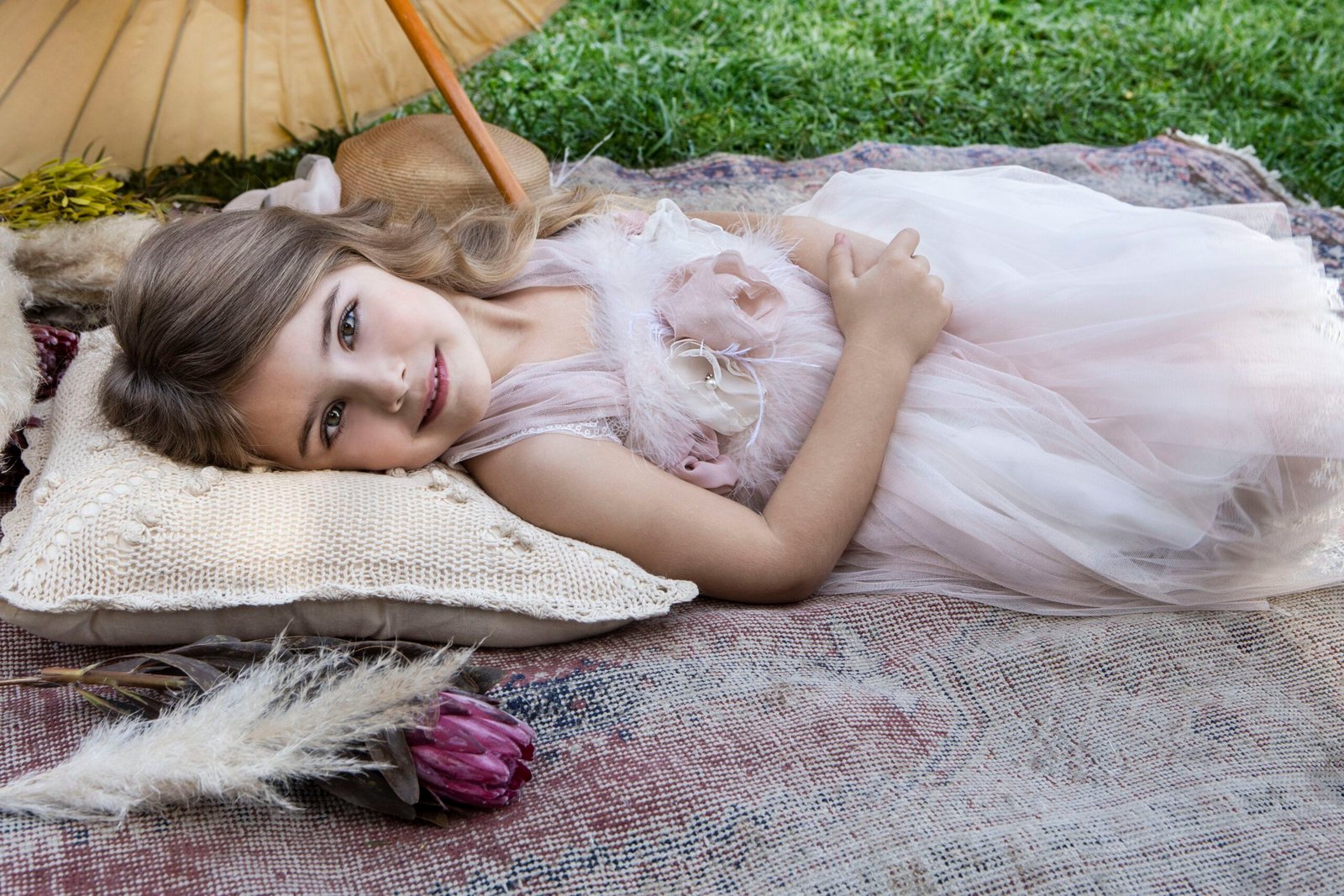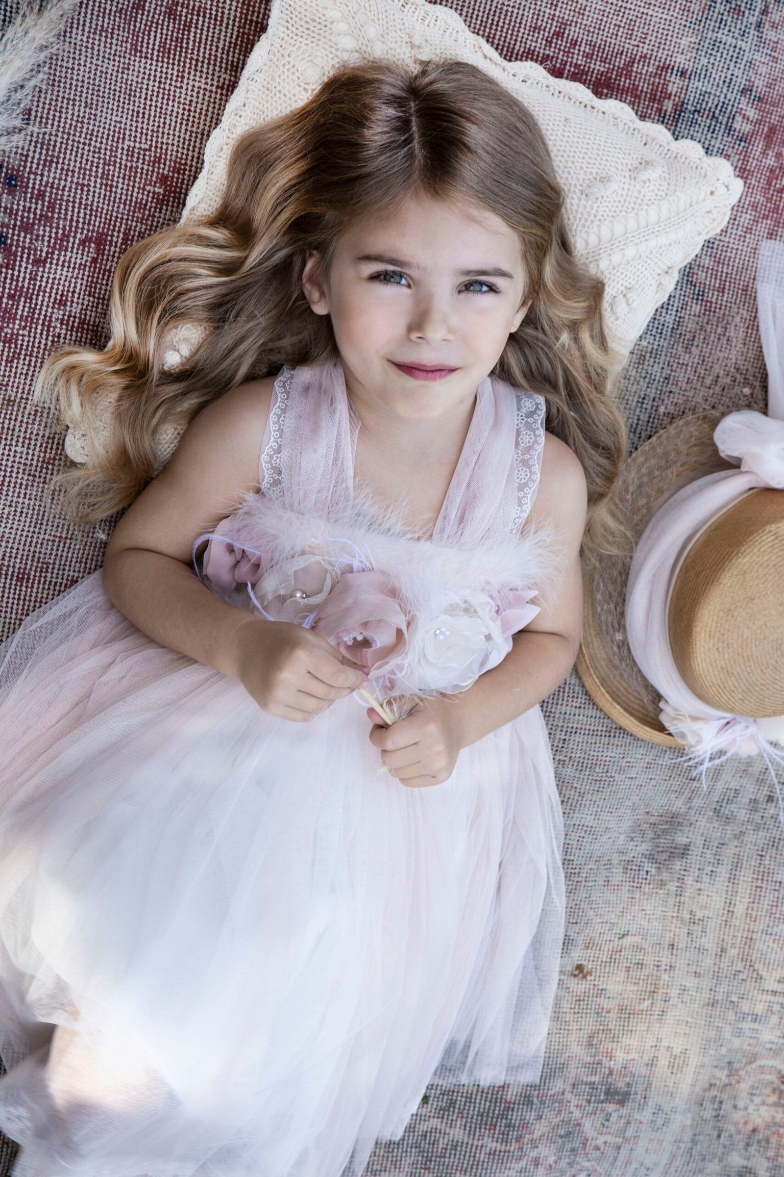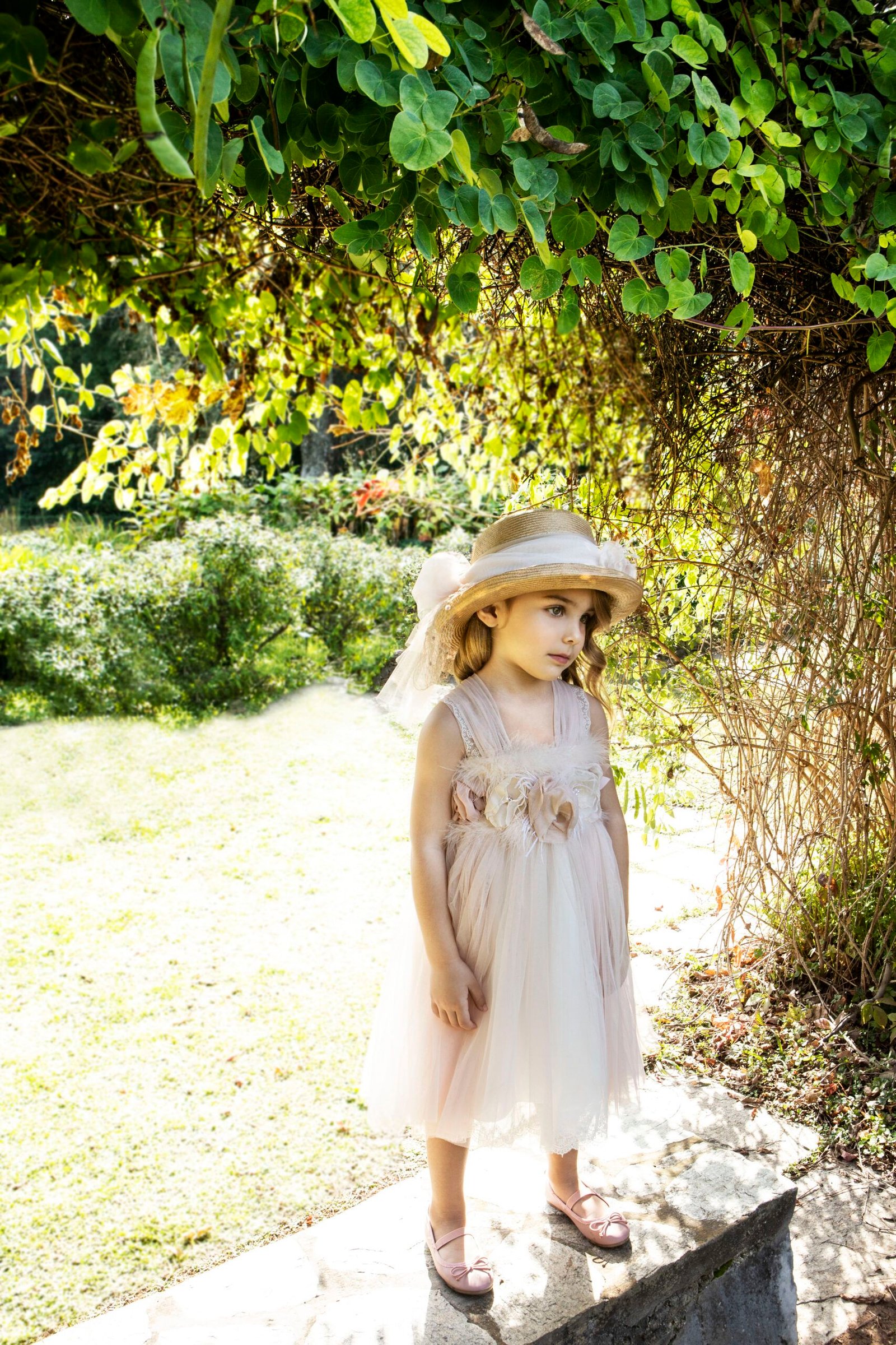 Ρομαντικό φόρεμα βάπτισης ιβουάρ με απαλό σάπιο μήλο απόχρωση με ιδιαίτερη ανάγλυφη δανδέλα στο τελείωμα της φούστας και στους ώμους , χειροποίητα πλούσια λουλούδια που στολίζουν το μπούστο .Πλούσια τούλινη φούστα στην ίδια απόχρωση και εσωτερική επένδυση από μαλακό βαμβακερό ύφασμα . Ασορτί κορδέλα με τα ίδια λουλούδια του φορέματος και κατ’ επιλογή μπαντάνα ή τουρμπάνι .