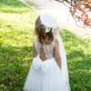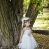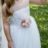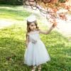 Ρομαντικό τούλινο φόρεμα σε ιβουάρ απόχρωση που το χαρακτηρίζει μια ανάγλυφη βαμβακερή δαντέλα στο μπούστο και στη πλάτη του φορέματος σχηματίζοντας V . Αέρινη φούστα με τελείωμα από την ίδια δαντέλα . Η εσωτερική επένδυση του φορέματος αποτελείται από μαλακό βαμβακερό ύφασμα.