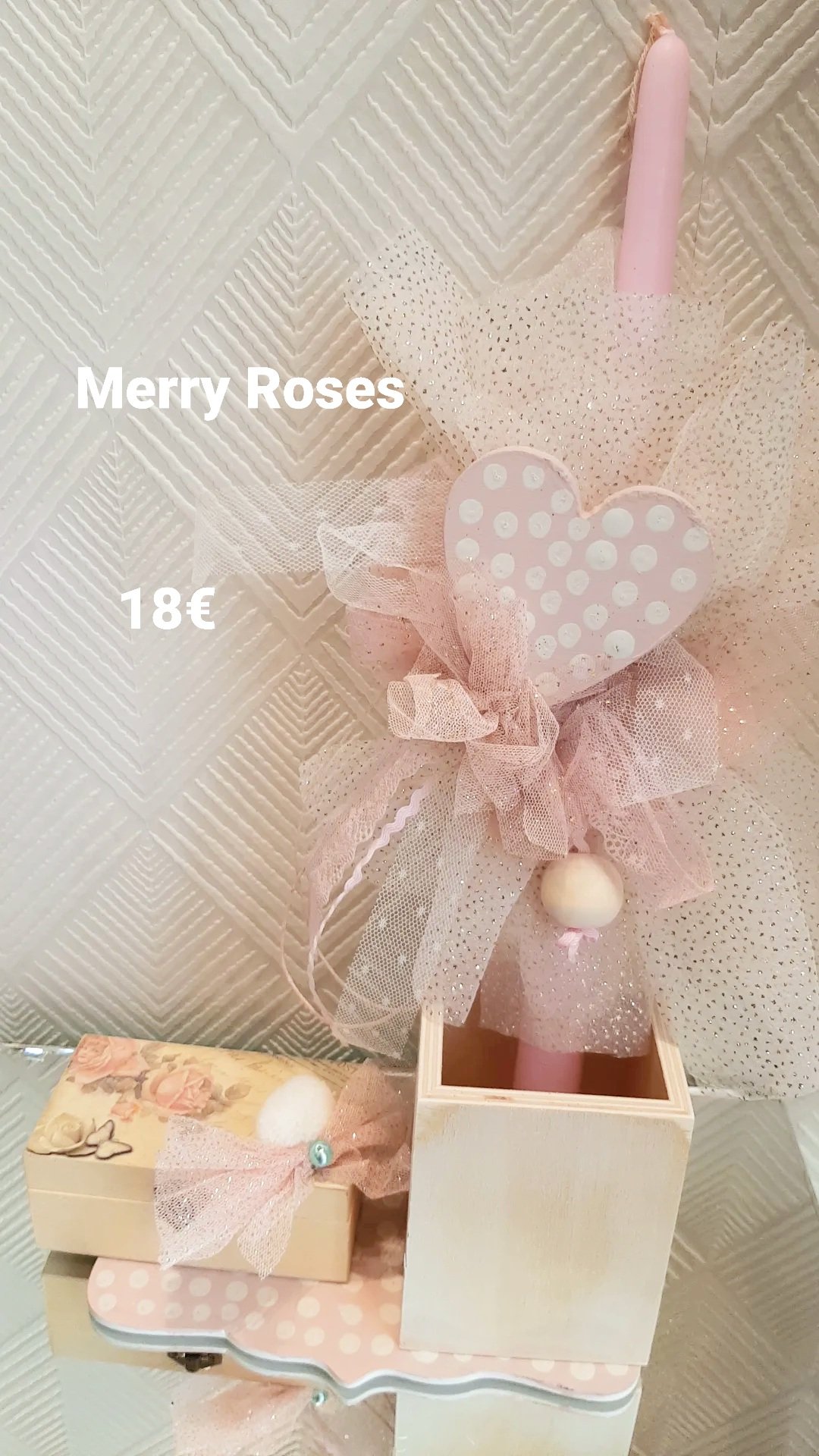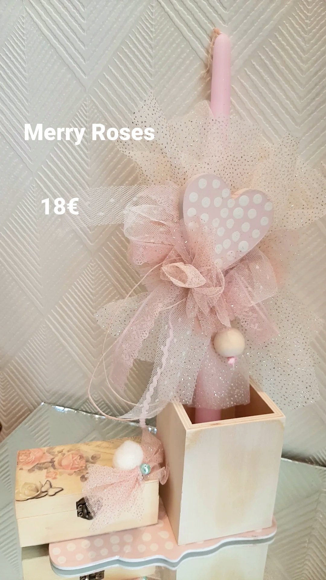 Ρομαντικό Πασχαλινό Σετ Δώρου με Λαμπάδα σε διακοσμητική βάση με ξύλινη θήκη και ξύλινο μπαουλάκι floral με πεταλούδα.