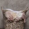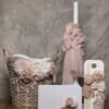 Ψάθινο καλάθι σε φυσικό χρώμα με πλούσιο στολισμό από χειροποίητα λουλούδια , ασορτί λαμπάδα με οργαντίνα σε σομόν απόχρωση και ιδιαίτερα εντυπωσιακά λουλούδια , σετ λαδιού (3 κεράκια, μπουκαλάκι λαδιού, σαπουνάκι) .