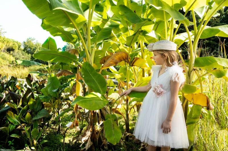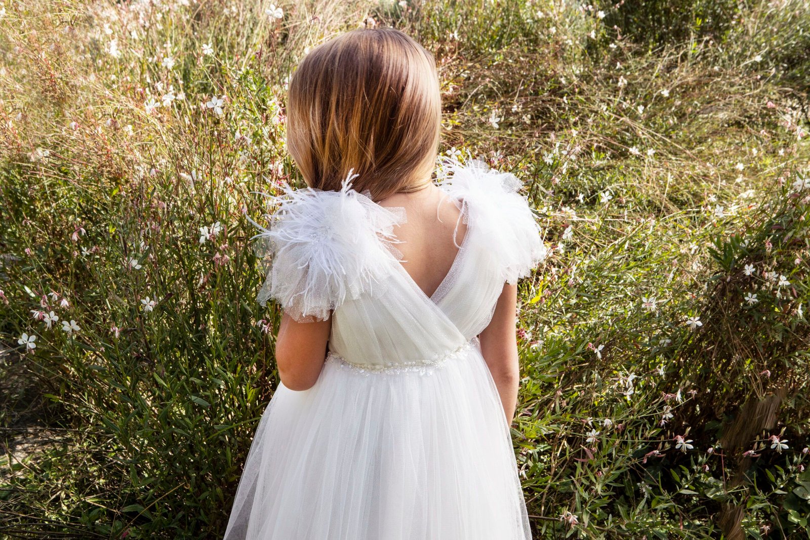 Ρομαντικό φόρεμα βάπτισης  σε ιβουάρ απόχρωση, glitter τούλι στο εσωτερικό του φορέματος με εντυπωσιακό κρουαζέ μπούστο. Χειροποίητα λουλούδια και εντυπωσιακή ζώνη με πέρλες και κρύσταλα που στολίζουν τη μέση του φορέματος , πλούσια φούστα  σε Α γραμμή στο μπροστινό μέρος και πολλά ασύμμετρα τούλια στο πίσω μέρος . Εσωτερική επένδυση από μαλακό βαμβακερό ύφασμα. Ασορτί κορδέλα με τα ίδια λουλούδια του φορέματος και κατ’ επιλογή τουρμπάνι ή μπαντάνα