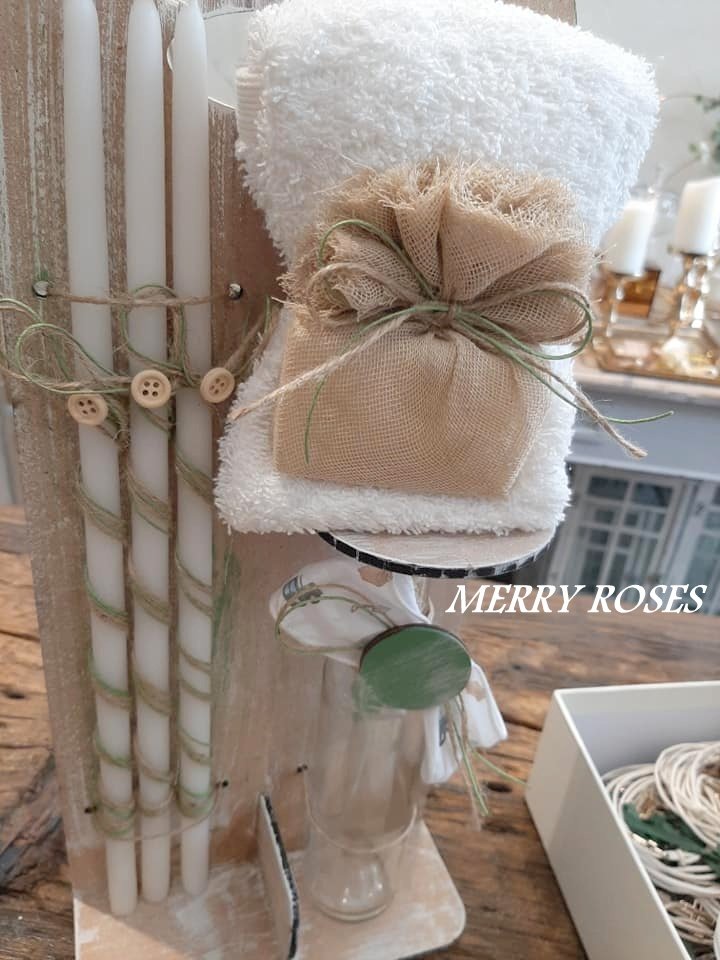 Λαδοσέτ με ξύλινο στάντ (3 κεράκια κολυμπήθρας,σαπουνάκι,πετσετούλα μικρή χεριών)