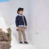 Βαπτιστικό σετ σε αποχρώσεις μπλε-σπαγγι. Ζακέτα ανάγλυφη με λοξό κούμπωμα με φερμουάρ. Το πουκάμισο είναι σιέλ βαμβακερό και το παντελόνι εκρού σπαγγί καμπαρτίνα. Στο σετ περιλαμβάνονται τιράντες, ξύλινο παπιγιόν, δίχρωμο φουλάρι και ψάθινο καπέλο ή μπερές.