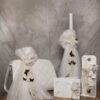 Tσάντα εκρού καπιτονέ με πλούσιο στολισμό μπροστά από τούλια ,χειροποίητα λουλούδια και ρομαντικές δανδέλες,που την στολίζουν χρυσές πεταλουδίτσες , ασορτί λαμπάδα με τον ίδιο στολισμό, σετ λαδιού (3 κεράκια, μπουκαλάκι λαδιού, σαπουνάκι) .