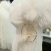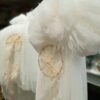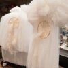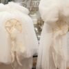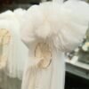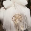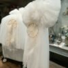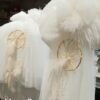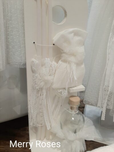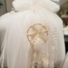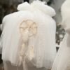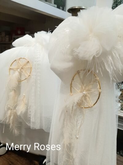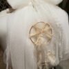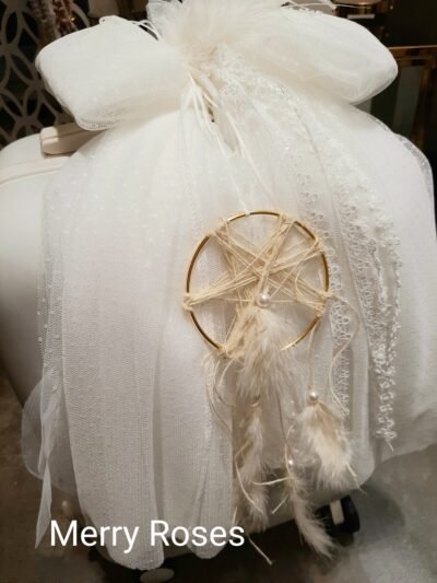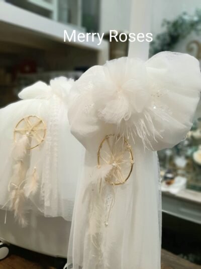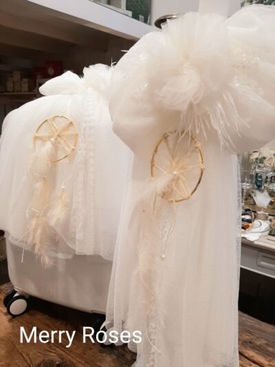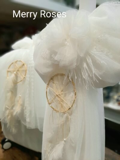 Σετ βάπτισης με τροχήλατη βαλίτσα λευκή γυαλιστερή ,γαλλικό τούλι φιόγκο πουά με μαραμπού και ονειροπαγίδα χρυσή με φτερά και πέρλες,μαζί με λαμπάδα σεταρισμένη &λαδοσέτ.