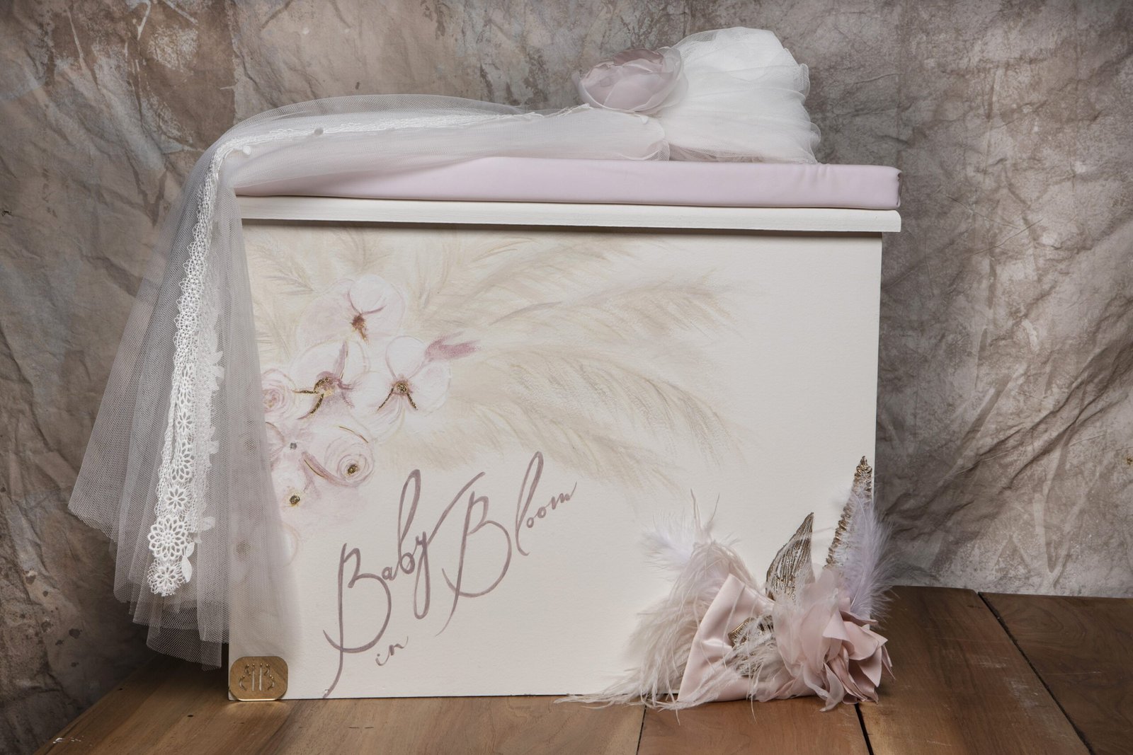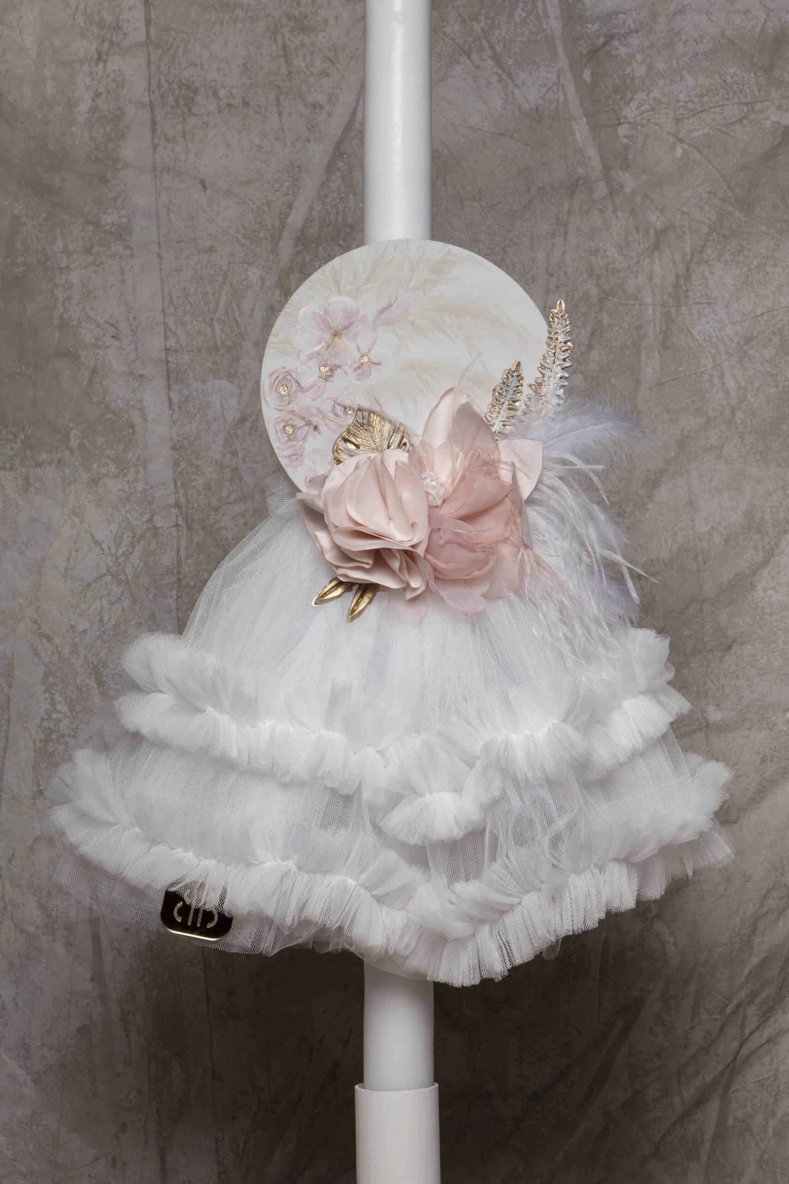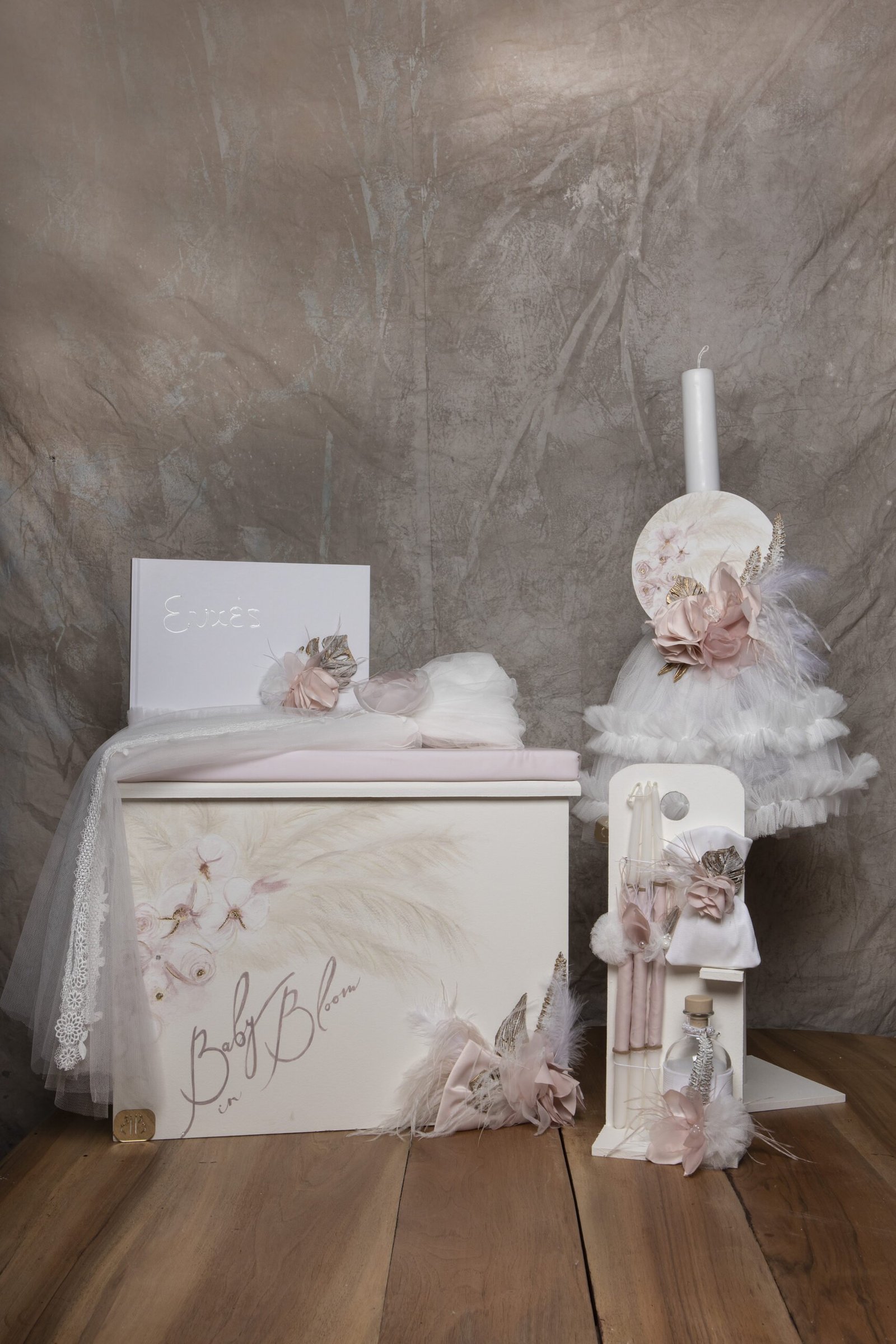 Ξύλινο κουτί σκαμπό με χειροποίητα λουλούδια και ζωγραφική της επιλογής σας , ασορτί λαμπάδα με ξύλινο καδράκι ζωγραφισμένο στο χέρι , σετ λαδιού (3 κεράκια, μπουκαλάκι λαδιού, σαπουνάκι) . Κάθε πακέτο βάπτισης μπορεί να στολιστεί με οποιοδήποτε φόρεμα της συλλογής .