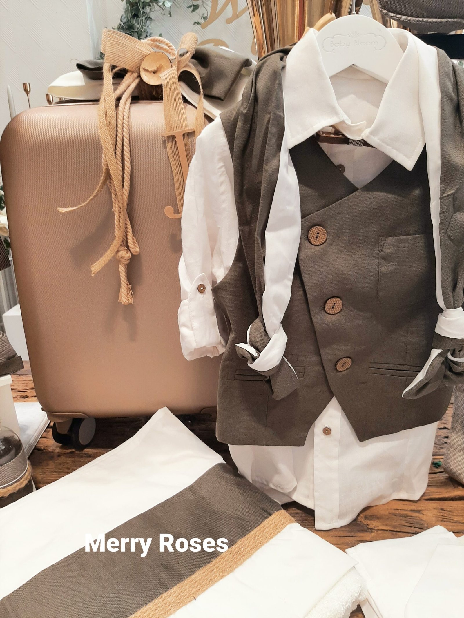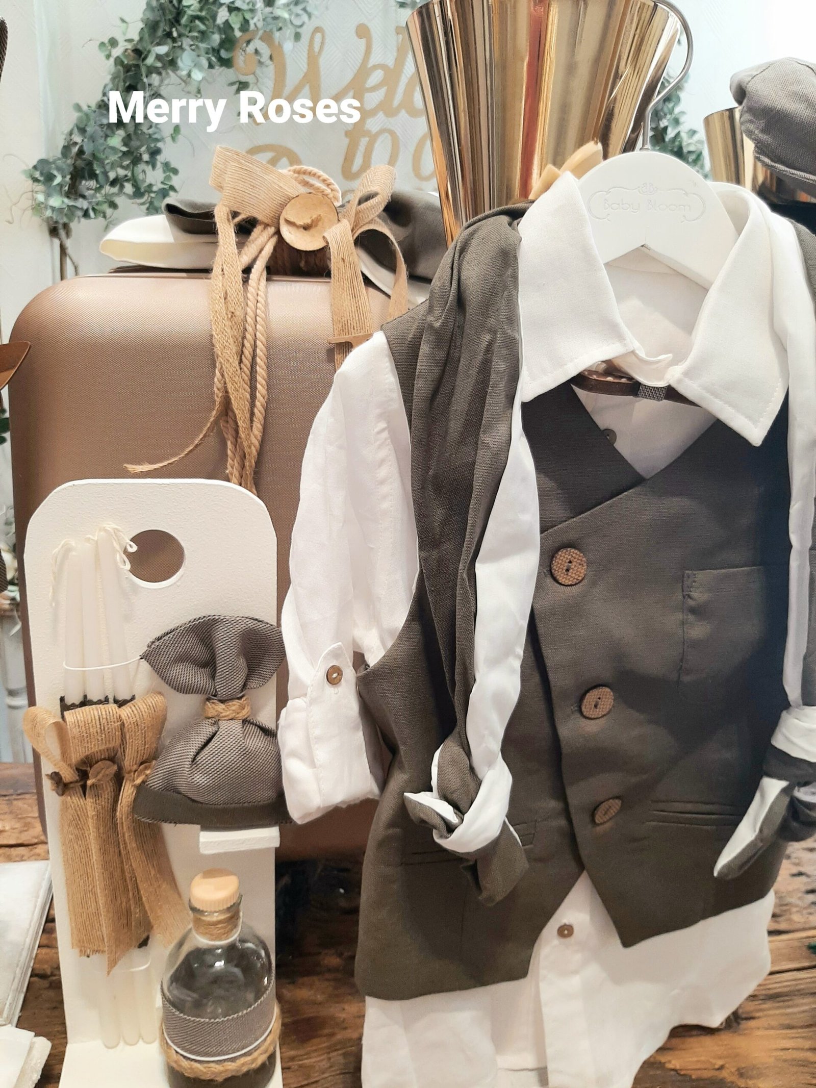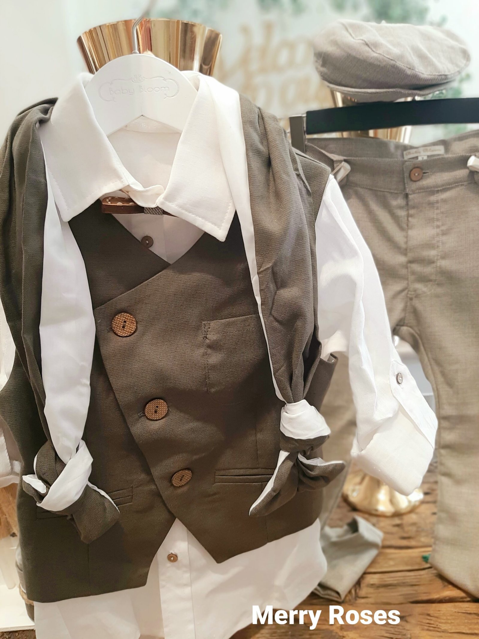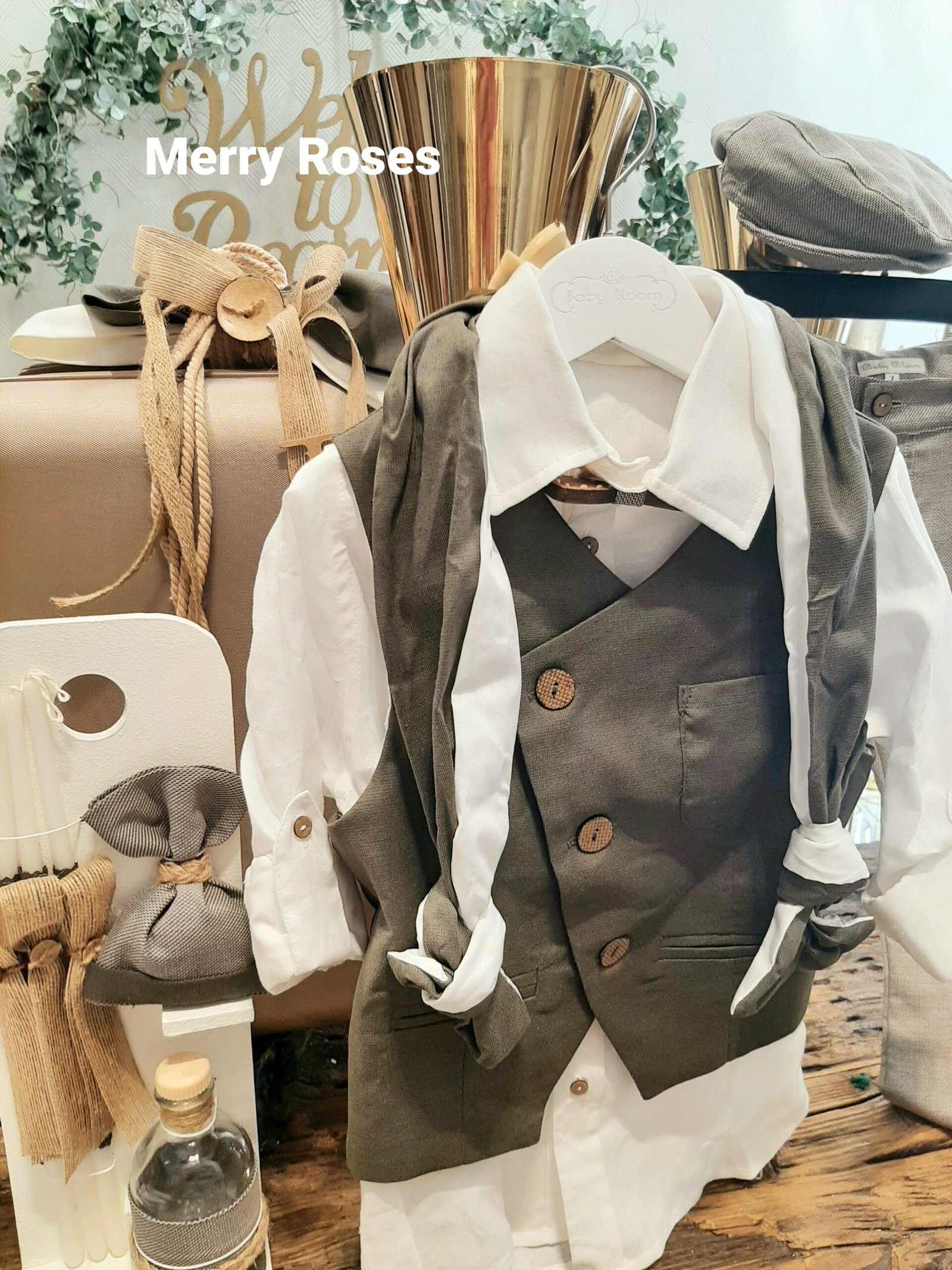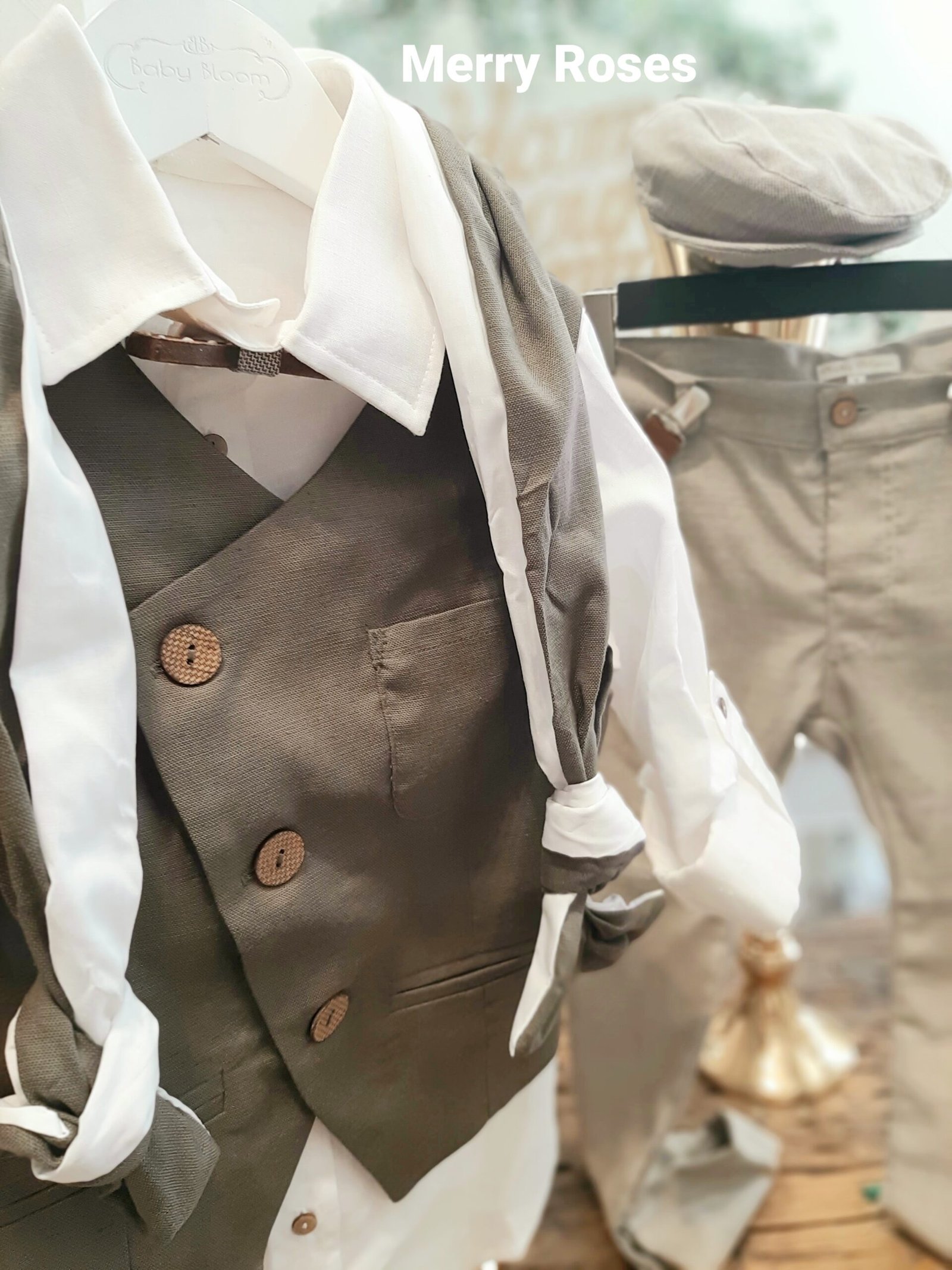 Μία πολύ ξεχωριστή πρόταση της σε χακί και μπεζ αποχρώσεις ,σετ βάπτισης 7 τεμαχίων που περιλαμβάνει παντελόνι μπεζ , το πουκάμισο είναι λευκό λινό και γιλέκο χακί λινό πλάγιο. Στο σετ περιλαμβάνονται επίσης τιράντες ,ξύλινο παπιγιόν ,δίχρωμο φουλάρι και ψάθινο καπέλο ή μπερές.