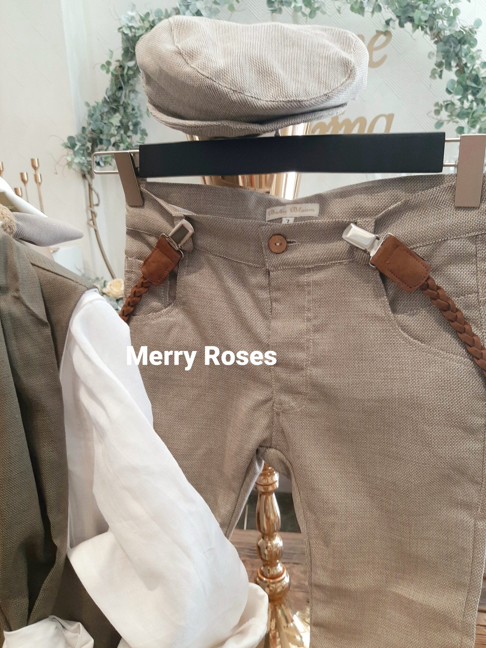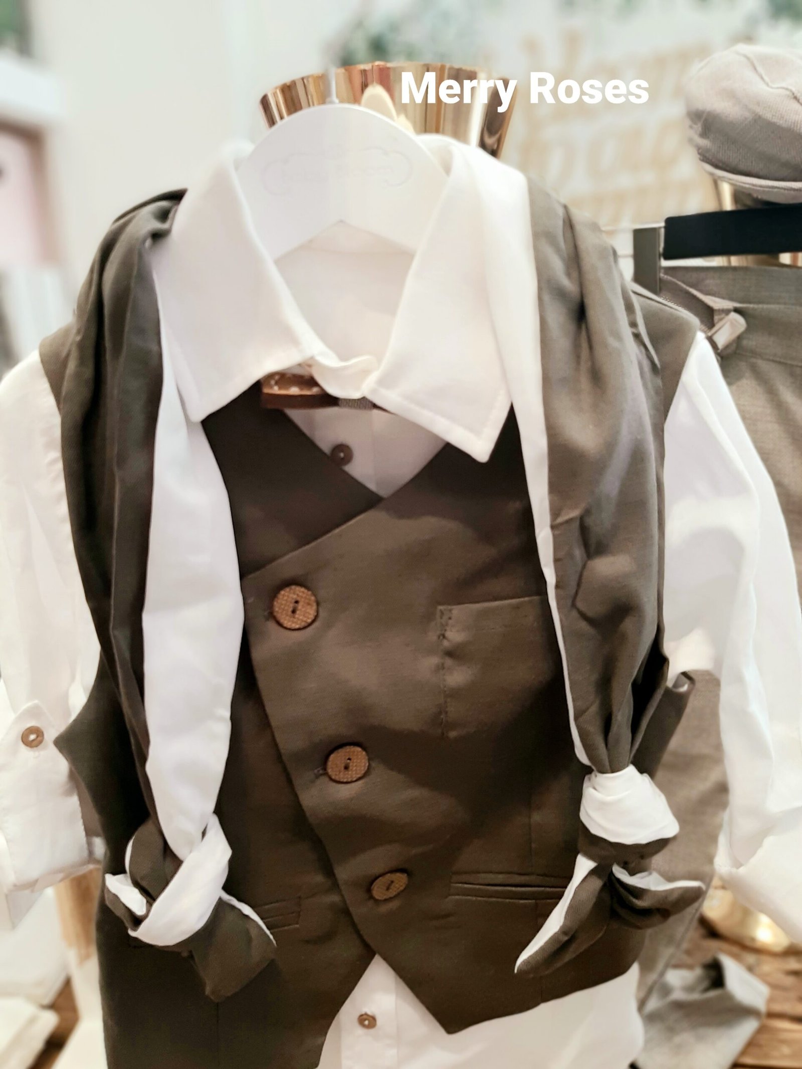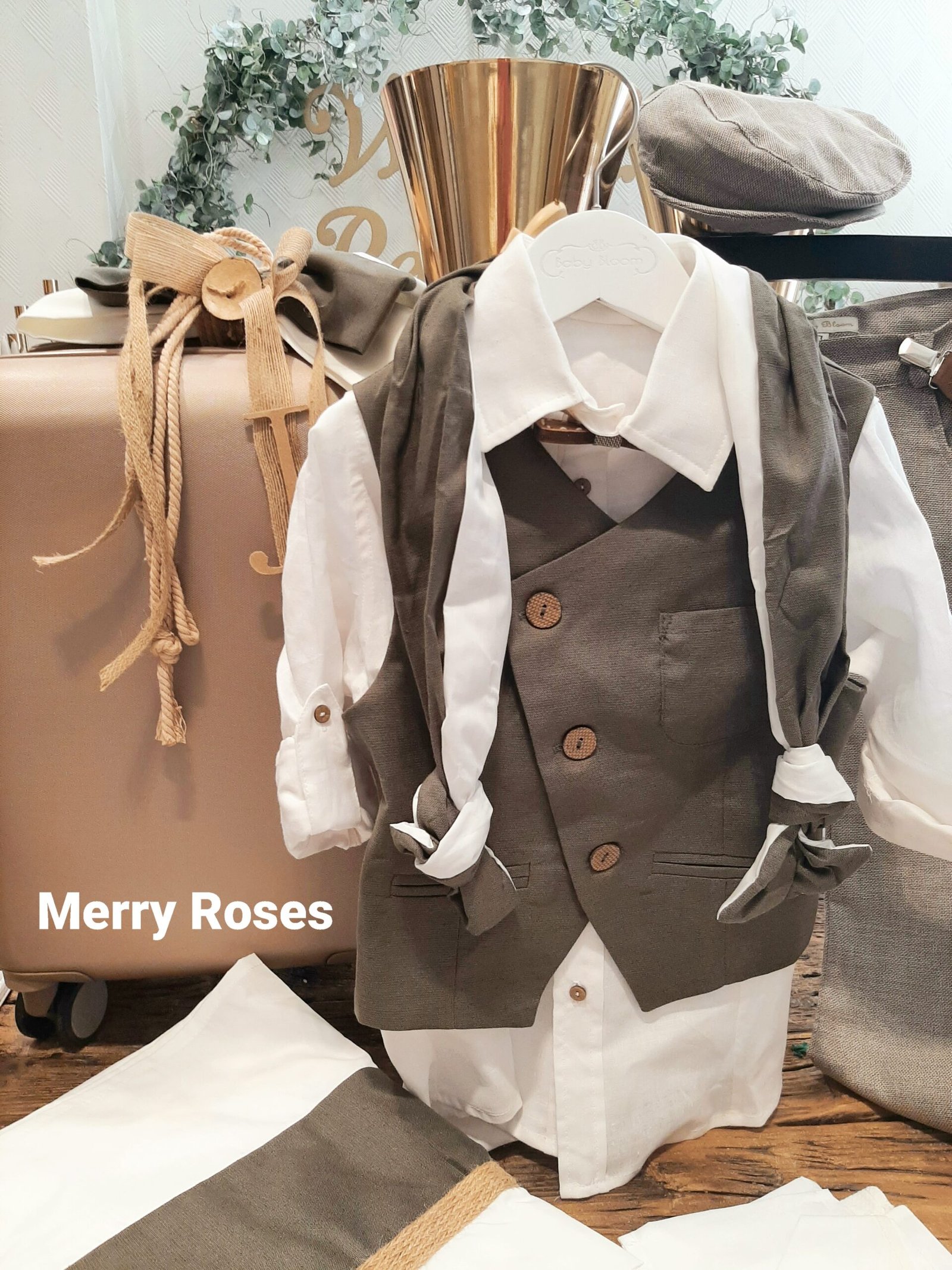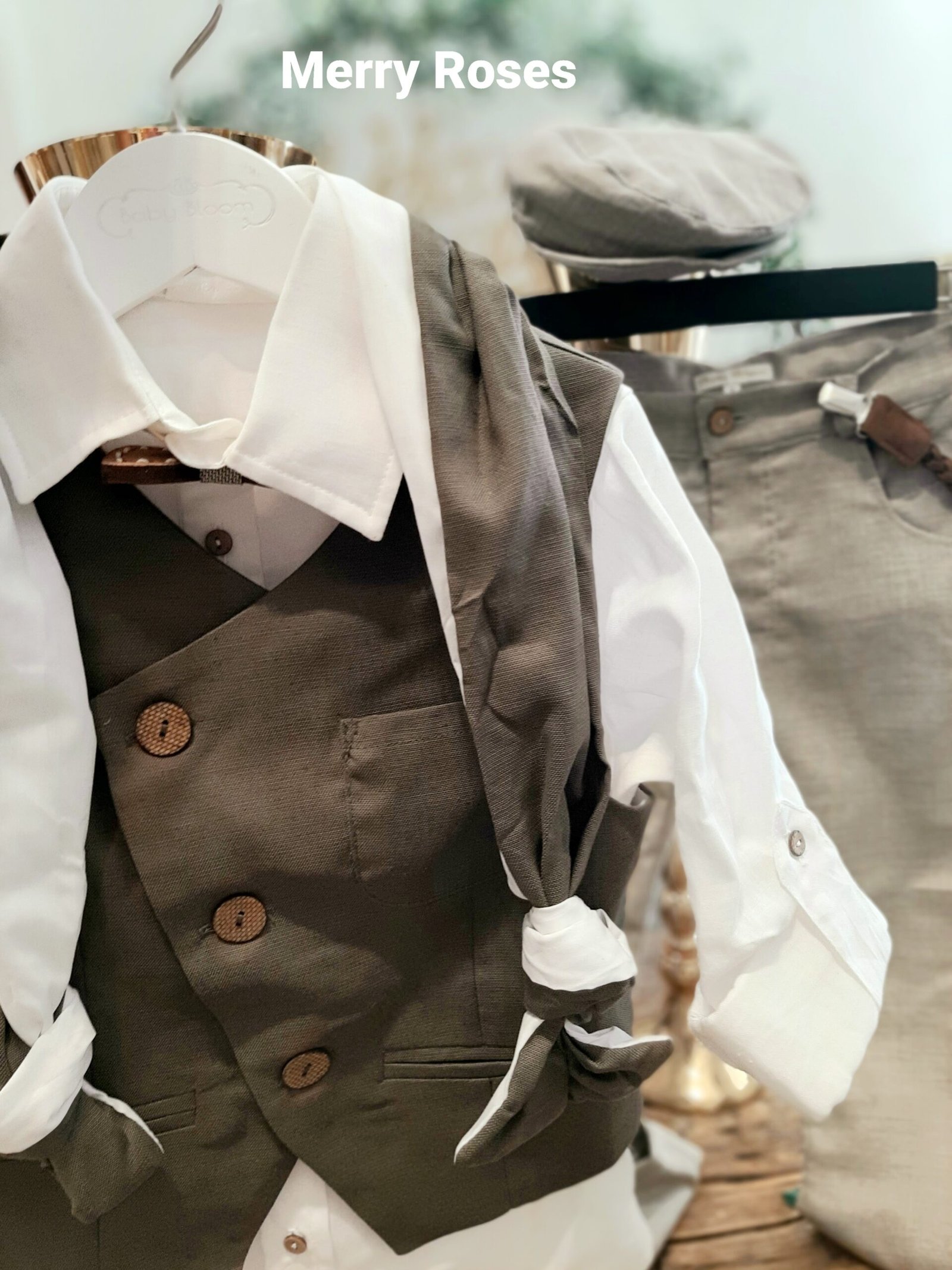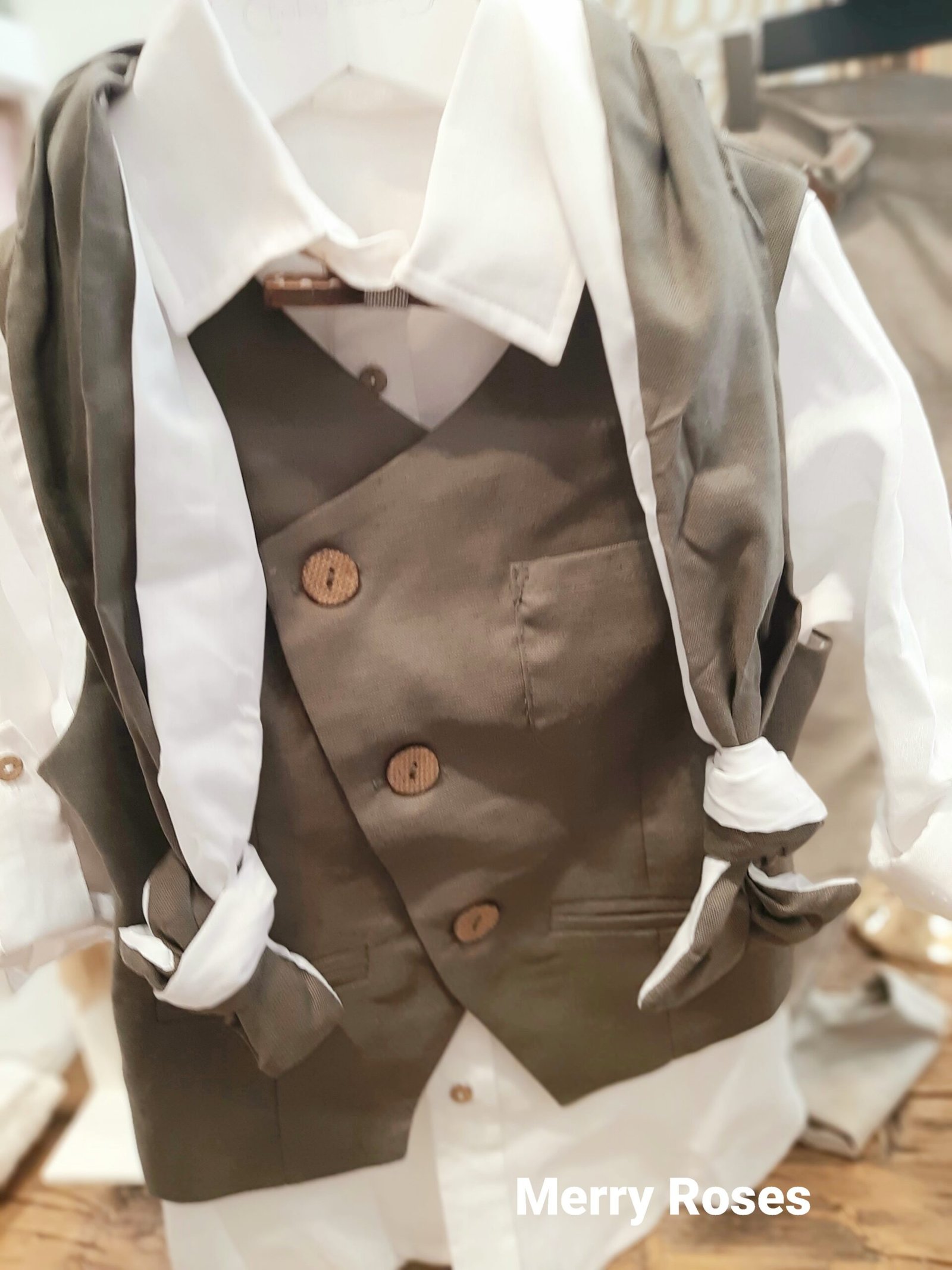 Μία πολύ ξεχωριστή πρόταση της σε χακί και μπεζ αποχρώσεις ,σετ βάπτισης 7 τεμαχίων που περιλαμβάνει παντελόνι μπεζ , το πουκάμισο είναι λευκό λινό και γιλέκο χακί λινό πλάγιο. Στο σετ περιλαμβάνονται επίσης τιράντες ,ξύλινο παπιγιόν ,δίχρωμο φουλάρι και ψάθινο καπέλο ή μπερές.
