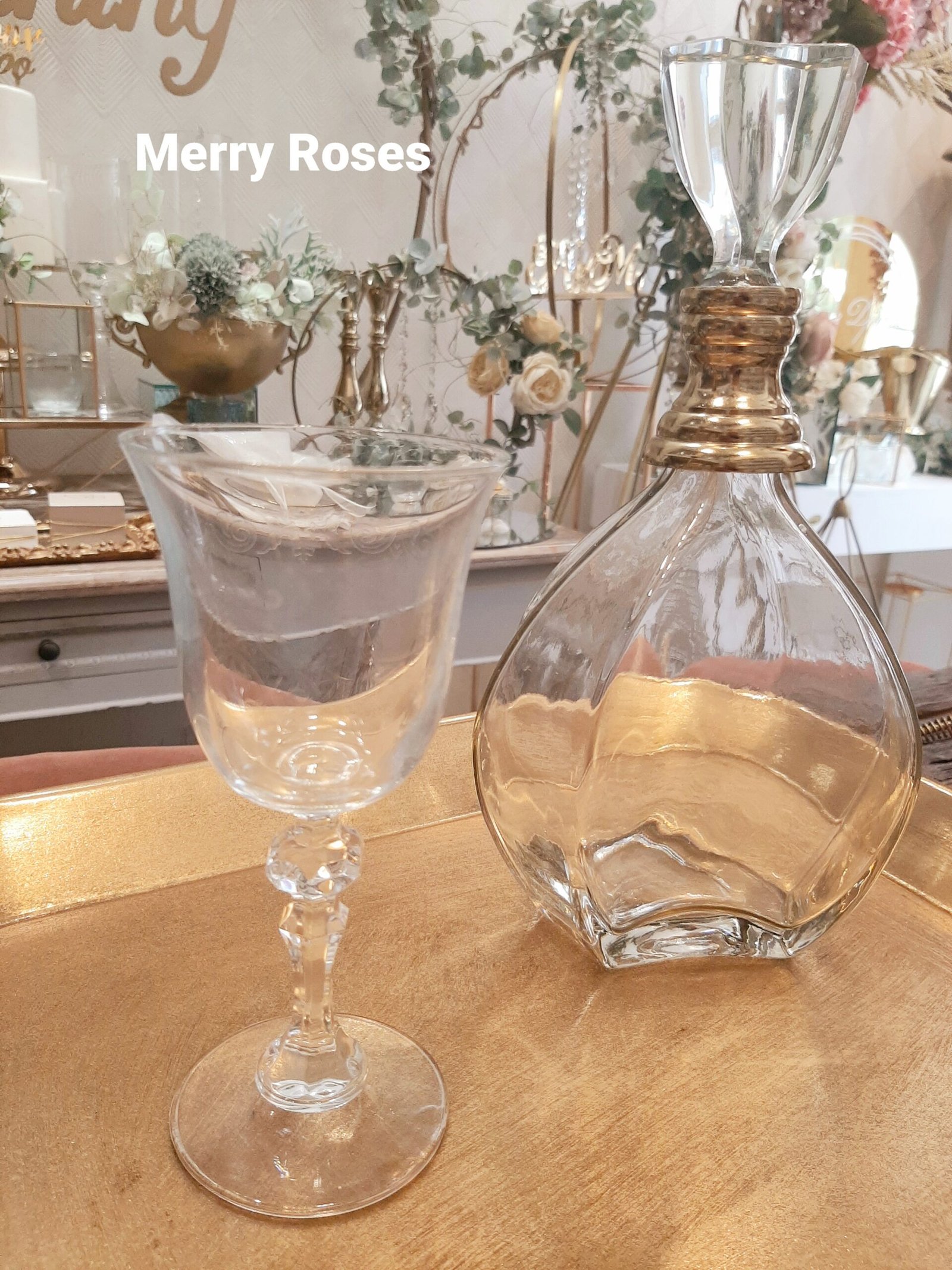 Σετ γάμου κουμπάρου με χρυσό μεταλλικό δίσκο,καράφα με λεπτομέρεια χρυσού ,ποτήρι.