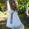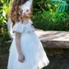 Ρομαντικό φόρεμα βάπτισης Baby Bloom που το χαρακτηρίζει η ιδιαίτερη δανδέλα που διακρίνεται σε όλο της το μήκος του φορέματος. Στο φόρεμα δίνουν μια ιδιαίτερη αισθητική το πλούσιο μανίκι με δανδέλα και τούλι όπως και στο τελείωμα και η χειροποίητη σύνθεση λουλουδιών που στολίζει τη μέση του φορέματος.