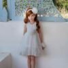 Φόρεμα εποχής από την συλλογή nostos collection με δανδελένιο κορσάζ και επένδυση μαλακό βαμβακερό , μια εντυπωσιακή πλάτη από την ίδια ανάγλυφη δανδέλα , που καταλήγει πιο μακρύ στο πίσω μέρος . Εσωτερικά υπάρχει επένδυση από μαλακό βαμβακερό ύφασμα και τούλι με κεντητό πουά . Το βολάν της φούστας αποτελείται από δανδέλα και τούλι πλισέ που δημιουργεί μια αέρινη κίνηση.