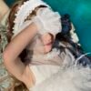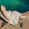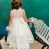 Eντυπωσιακό φόρεμα υψηλής ραπτικής ,μικρό νυφικό , ασύμμετρο από κεντητό πουά τούλι σε λευκή απόχρωση με εσωτερική επένδυση από μαλακό βαμβακερό ύφασμα. Κορσάζ V με διαφάνεια, διπλή απλικέ δανδέλα στο τελείωμα του φορέματος και διαφάνεια στην πλάτη. Το εκπληκτικό αυτό αποτέλεσμα συμπληρώνει το βολάν στην μέση του φορέματος από πυκνό τούλι, πούπουλα maraboo και την διπλή τρέσα με στρας. Ασορτί κορδέλα με το ίδιο λουλούδι του φορέματος ή κατ’ επιλογή μπαντάνα ή τουρμπάνι.